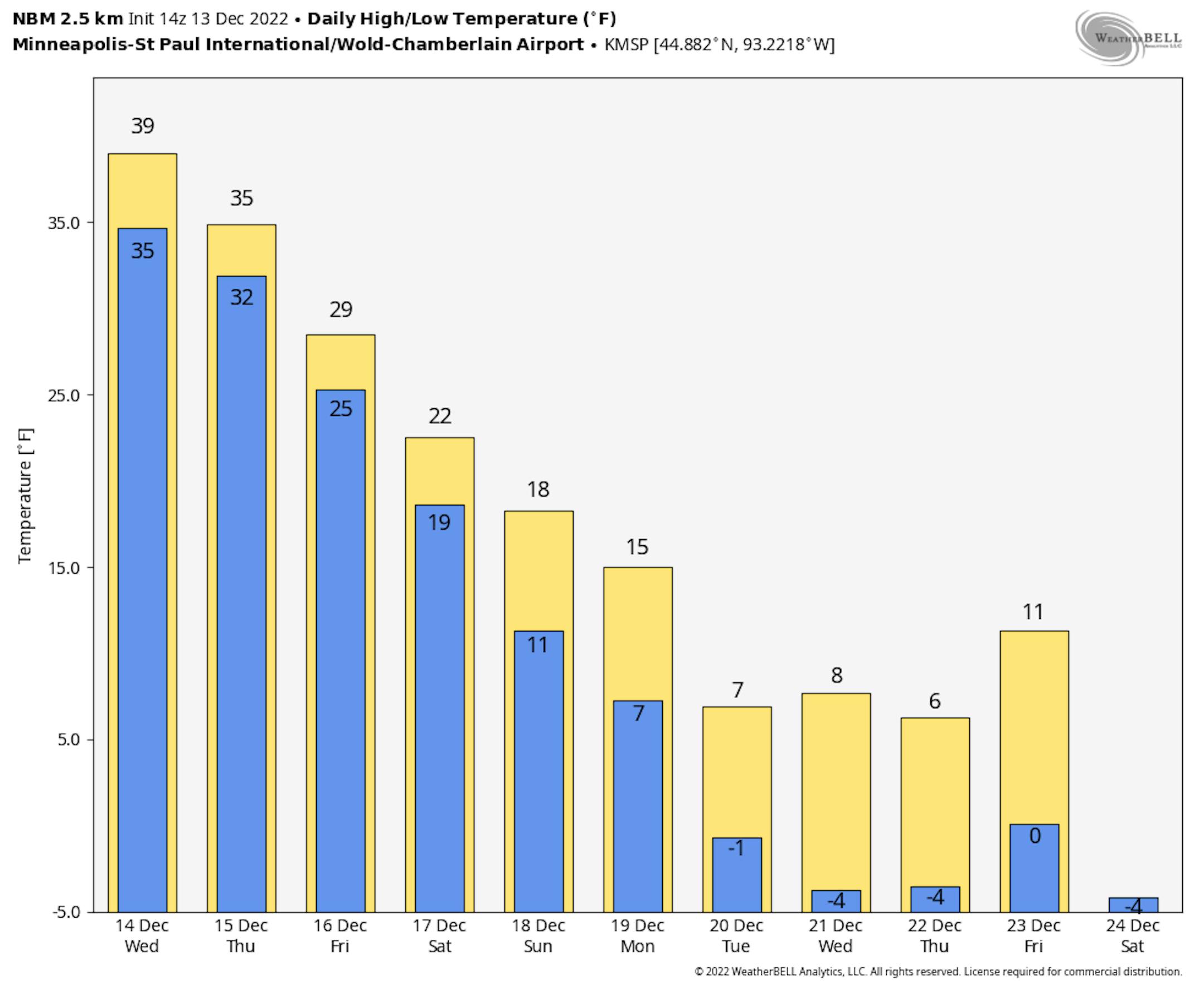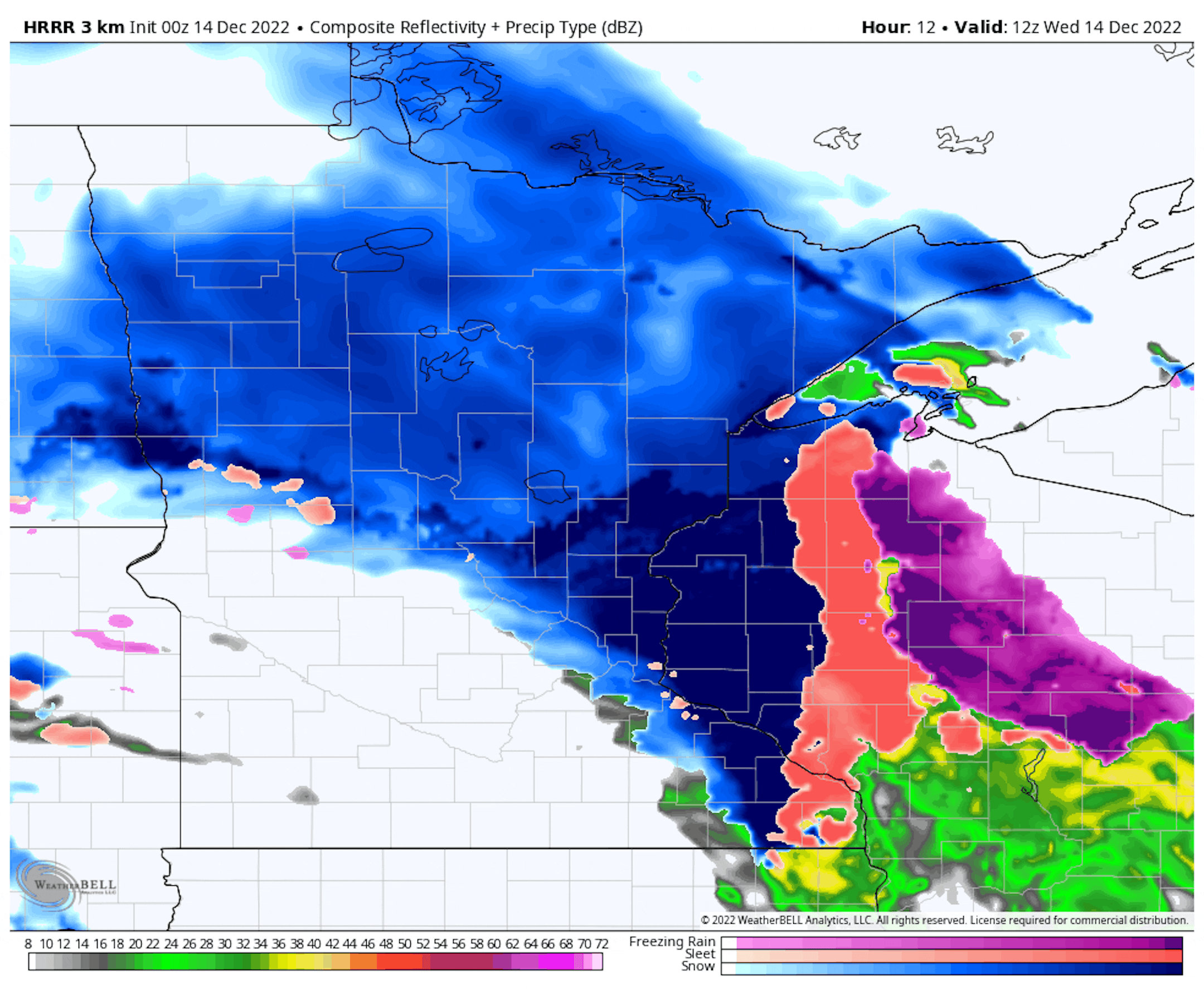 The Twin Cities on Wednesday, December 14th, looks pretty messy with a wintry mix moving through mainly during the 2nd half of the day. Temperatures will warm into the mid 30s with strong winds.