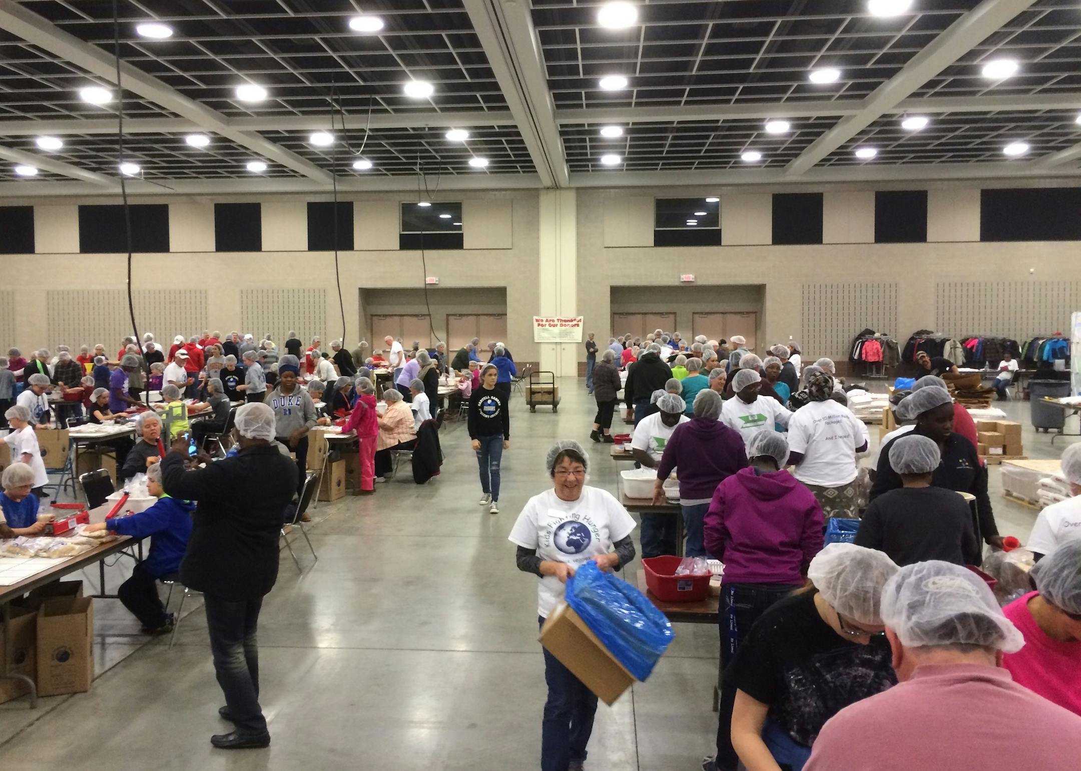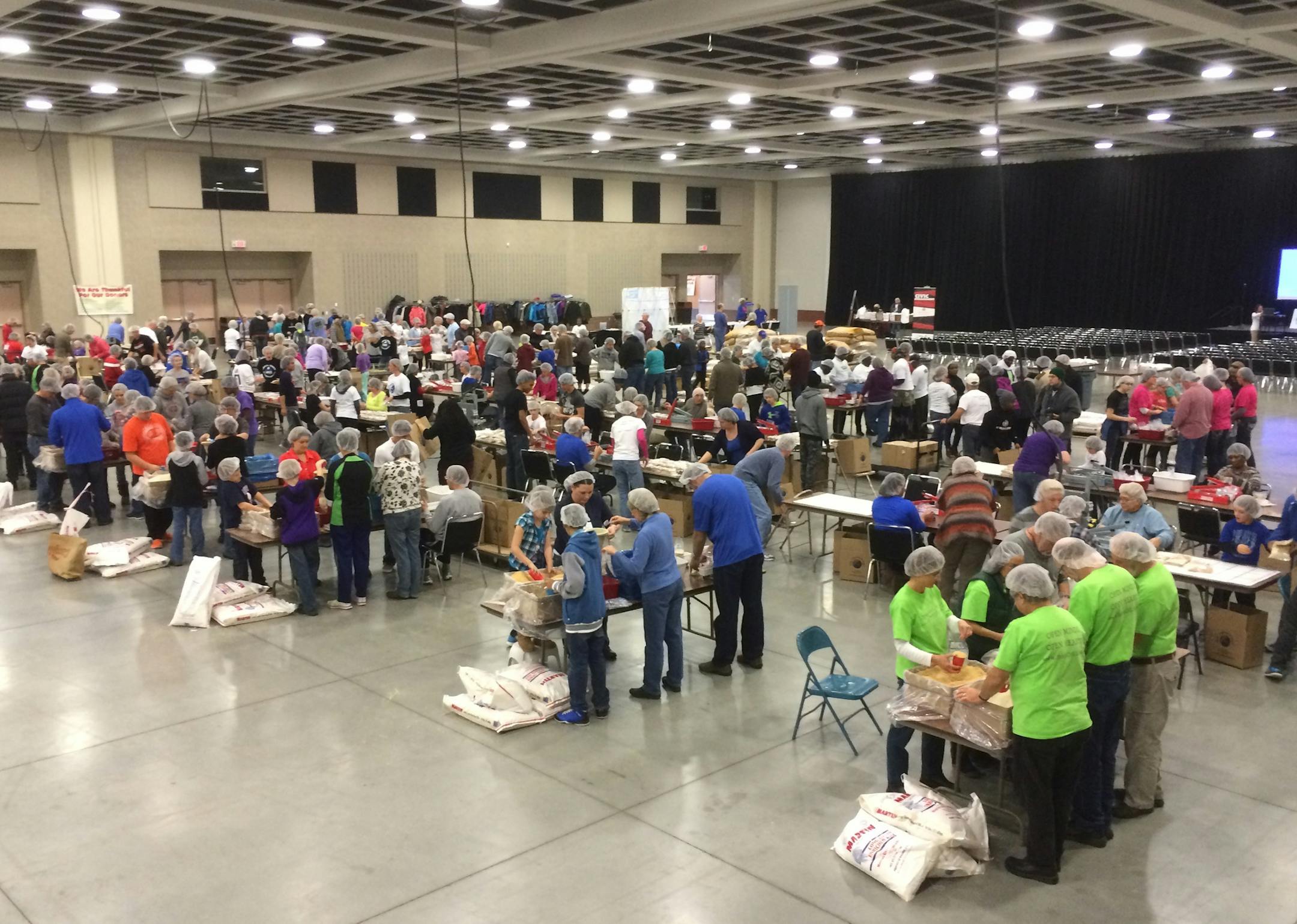 The main sponsor, Kids Fighting Hunger, based in Sauk Rapids, hopes to package enough food to feed 1,300 families for a month, said Pam Beard, executive director. "We have almost 700 volunteers and 50 more waiting to help in this huge space with people busy packaging food," she said.