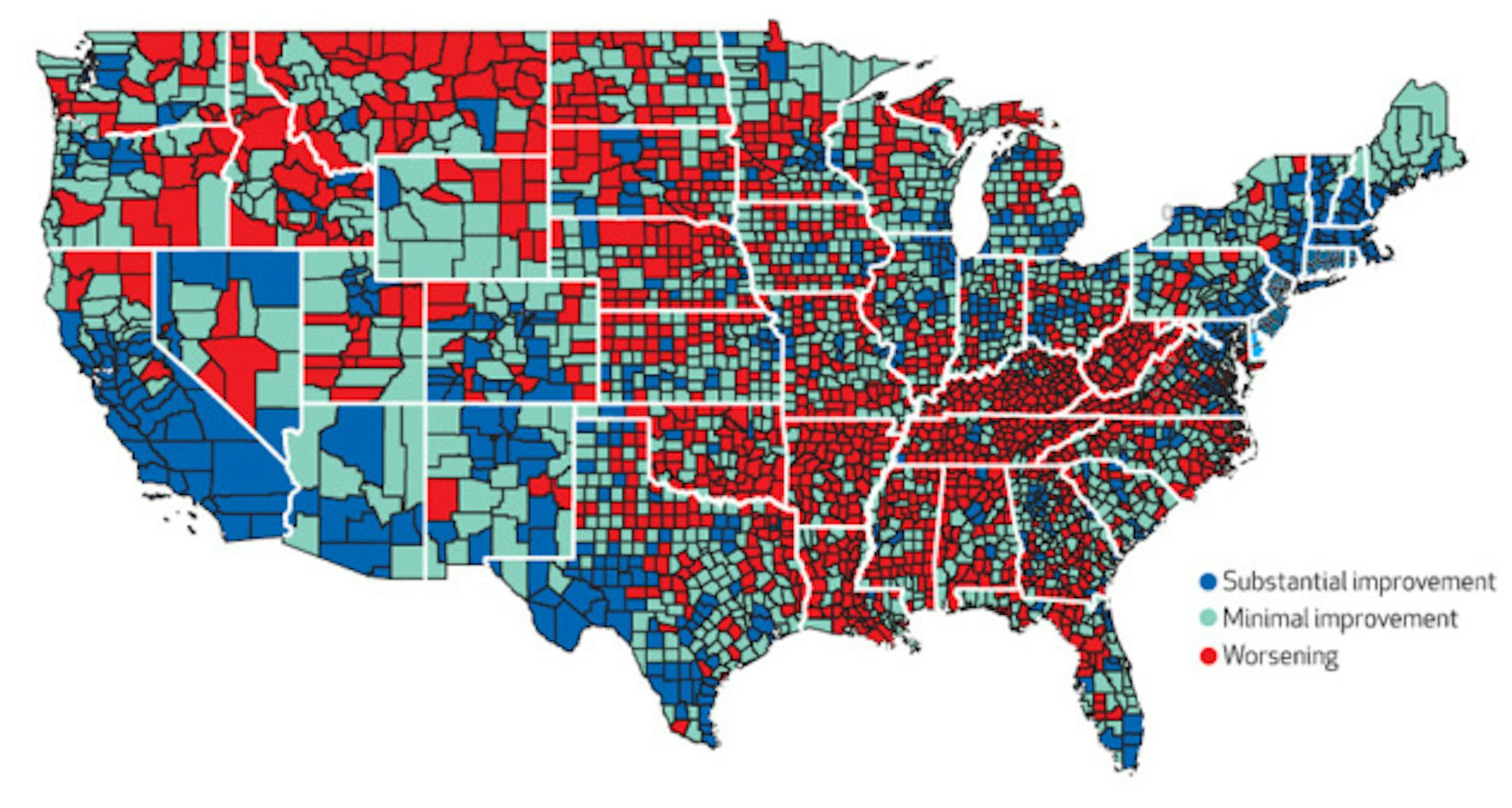 In other words, while mortality rates improved in most U.S. counties, women in some parts of America, especially those in the West and South, faced worse premature mortality rates (dying at or before age 75, which is considered by epidemiologists to mark premature death).