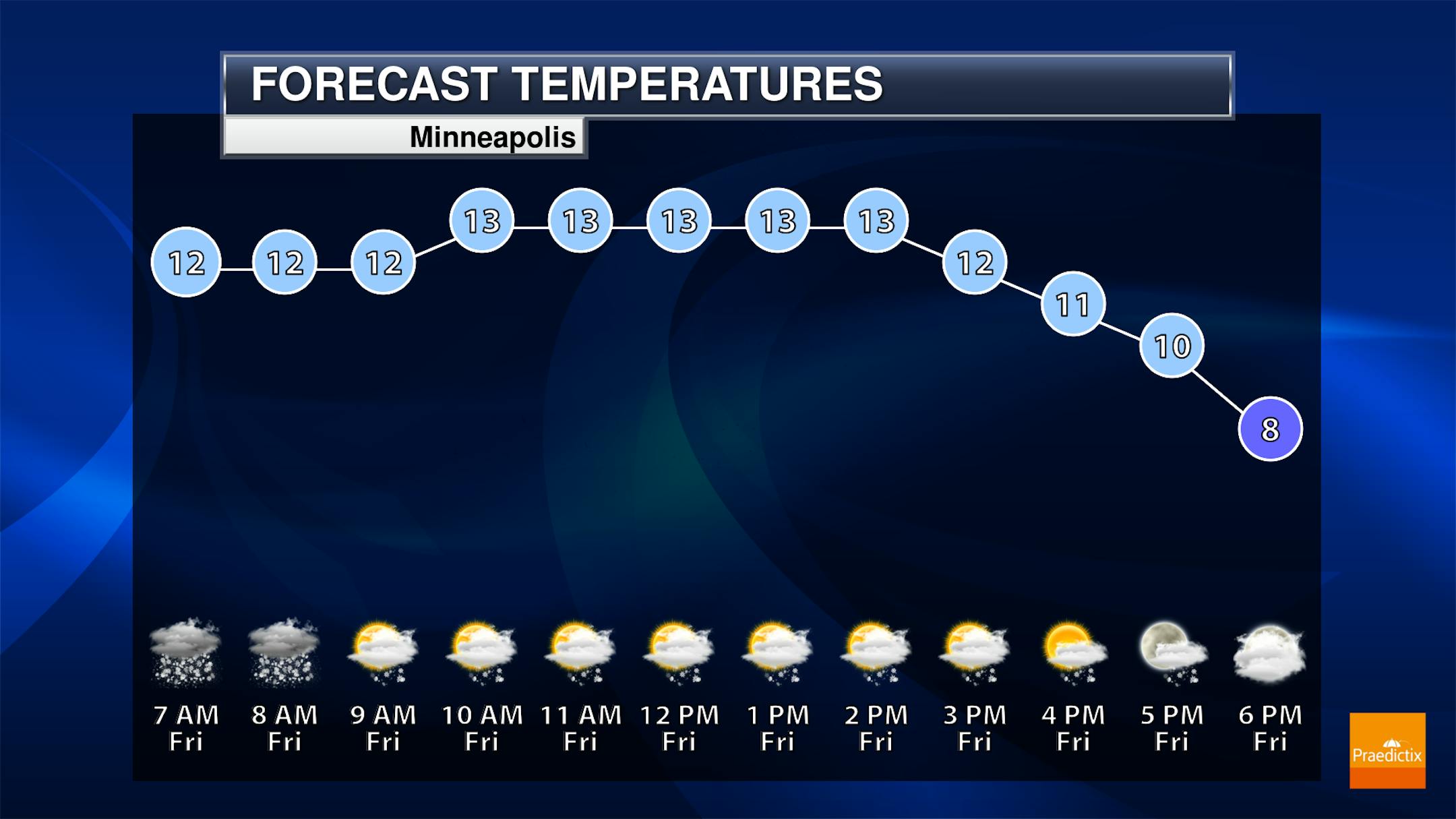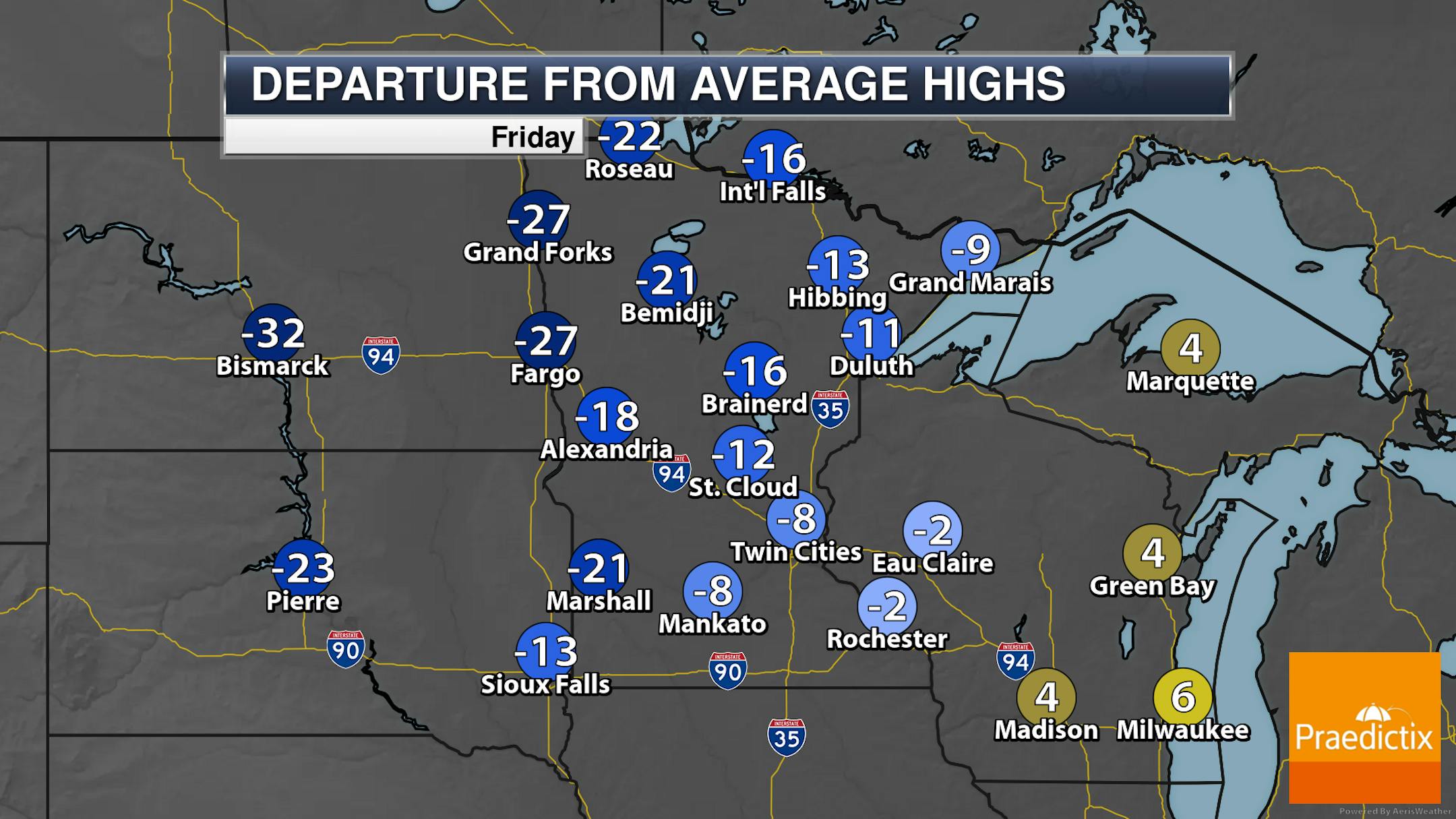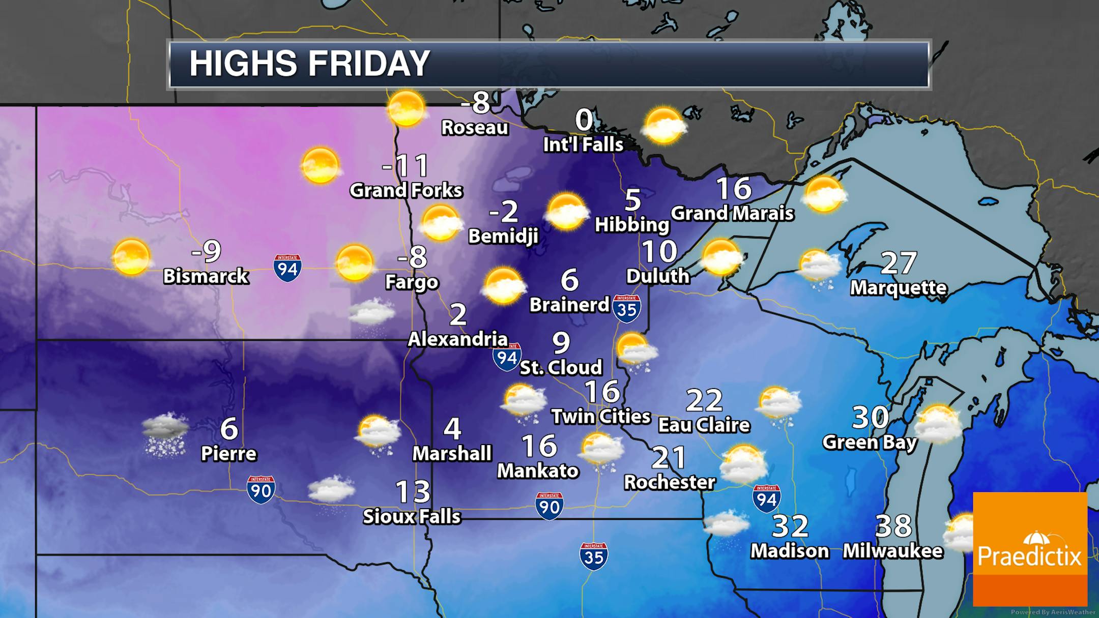 A big temperature gradient will set up across the state as 20s hang on for parts of the day down in southeastern Minnesota but you can see that cold air rushing in - particularly up north where some areas of northwestern Minnesota may see highs in the teens below zero.