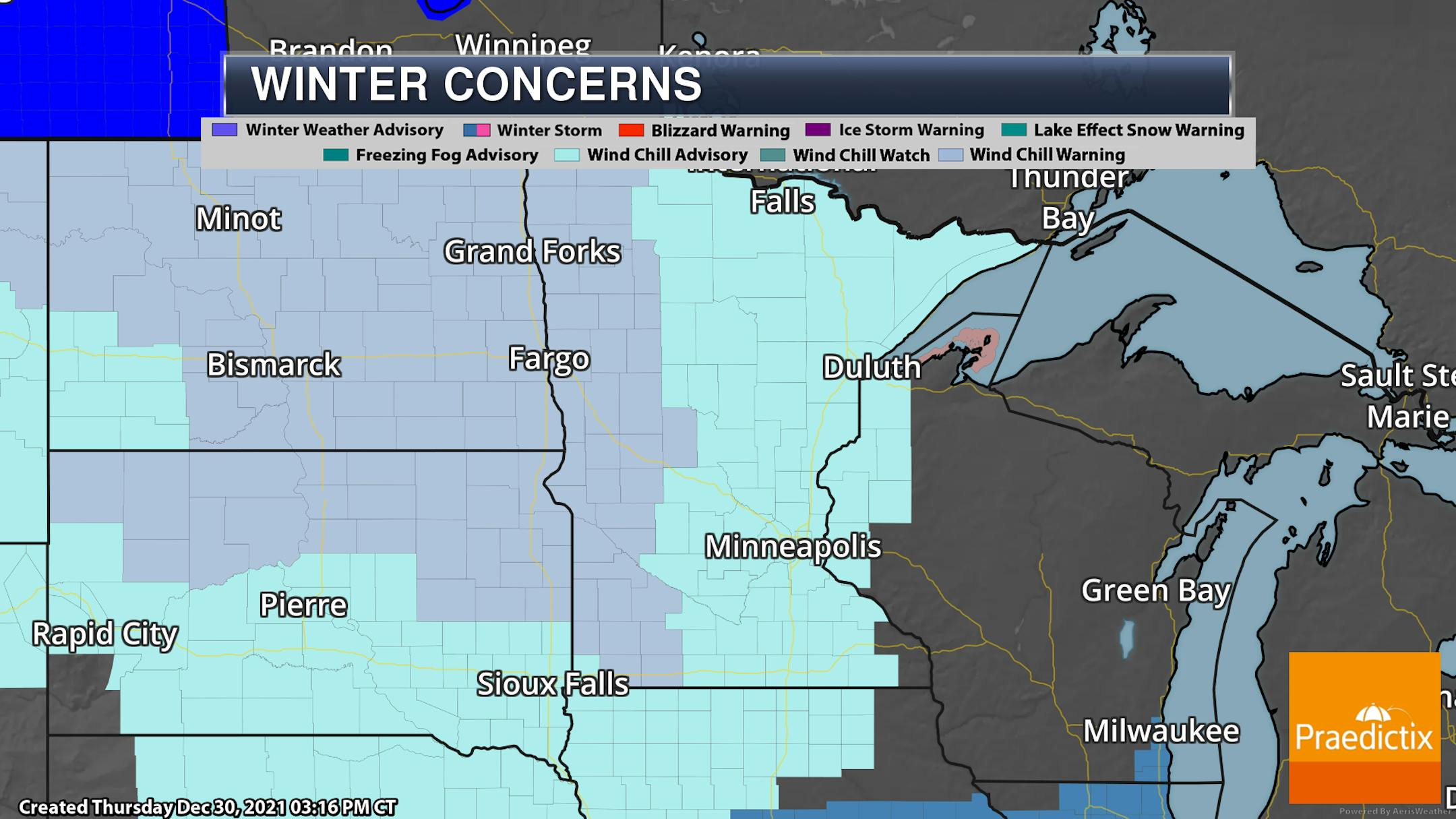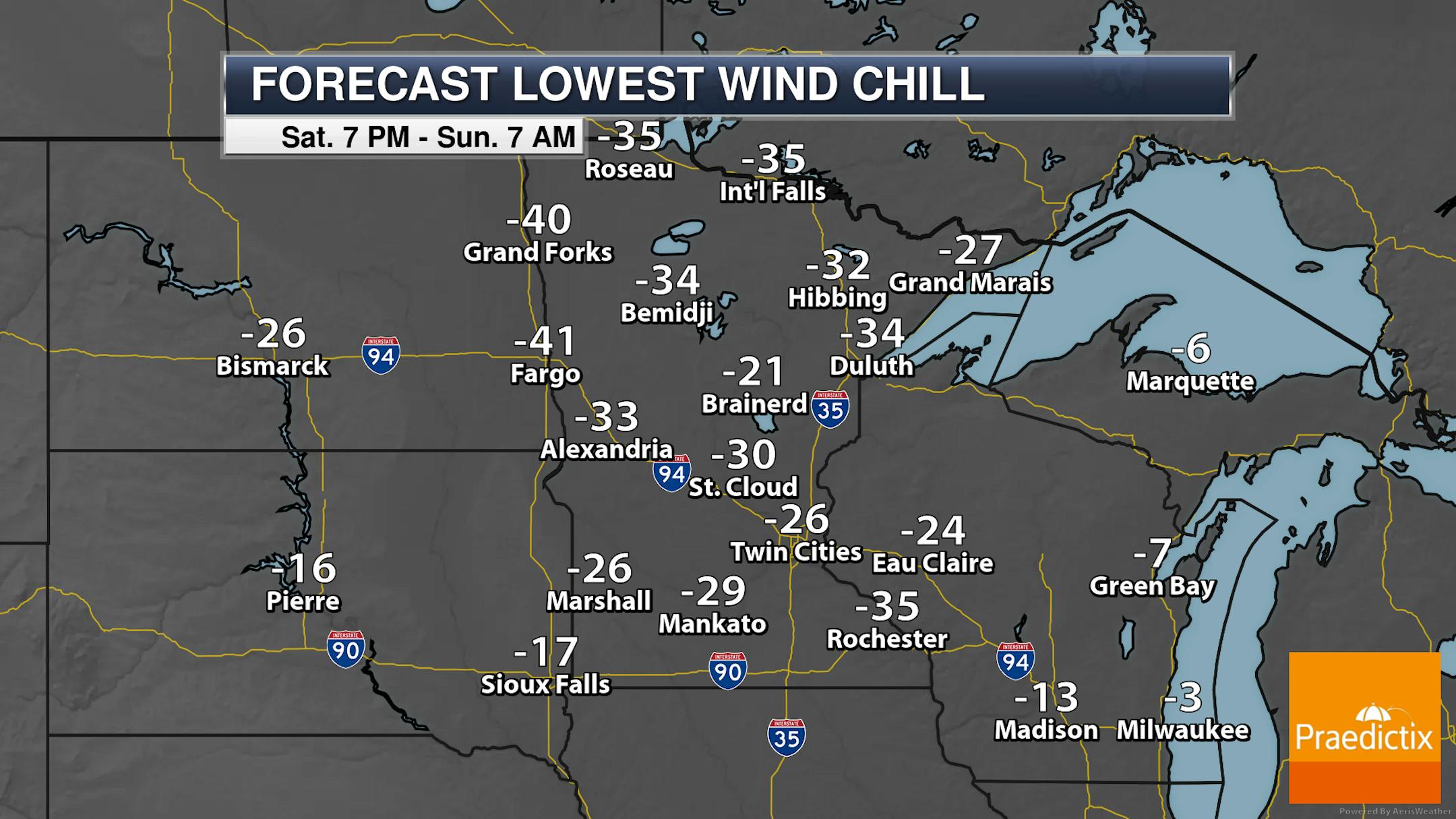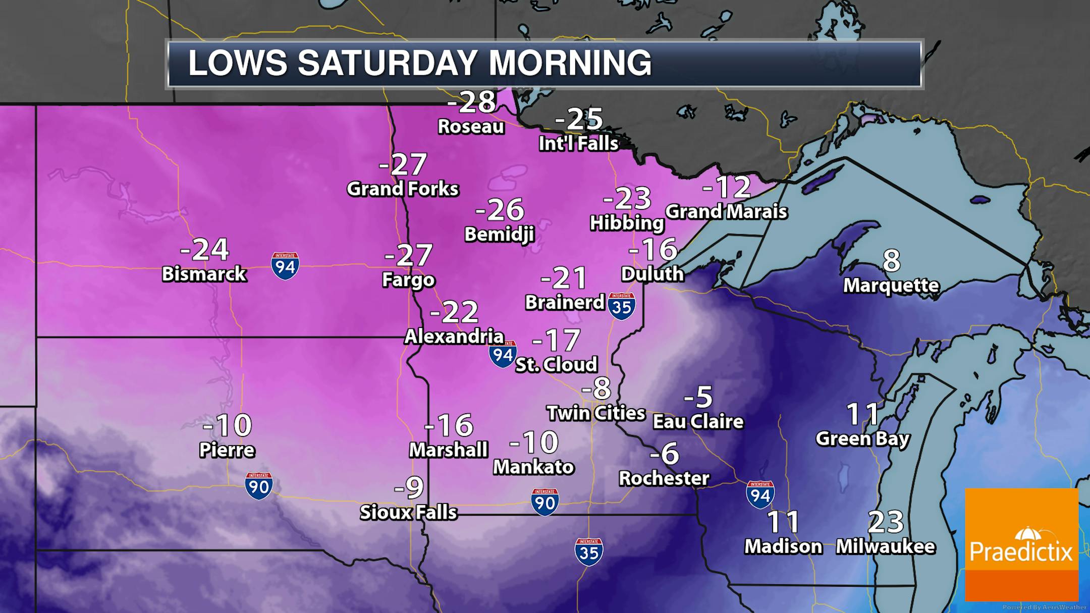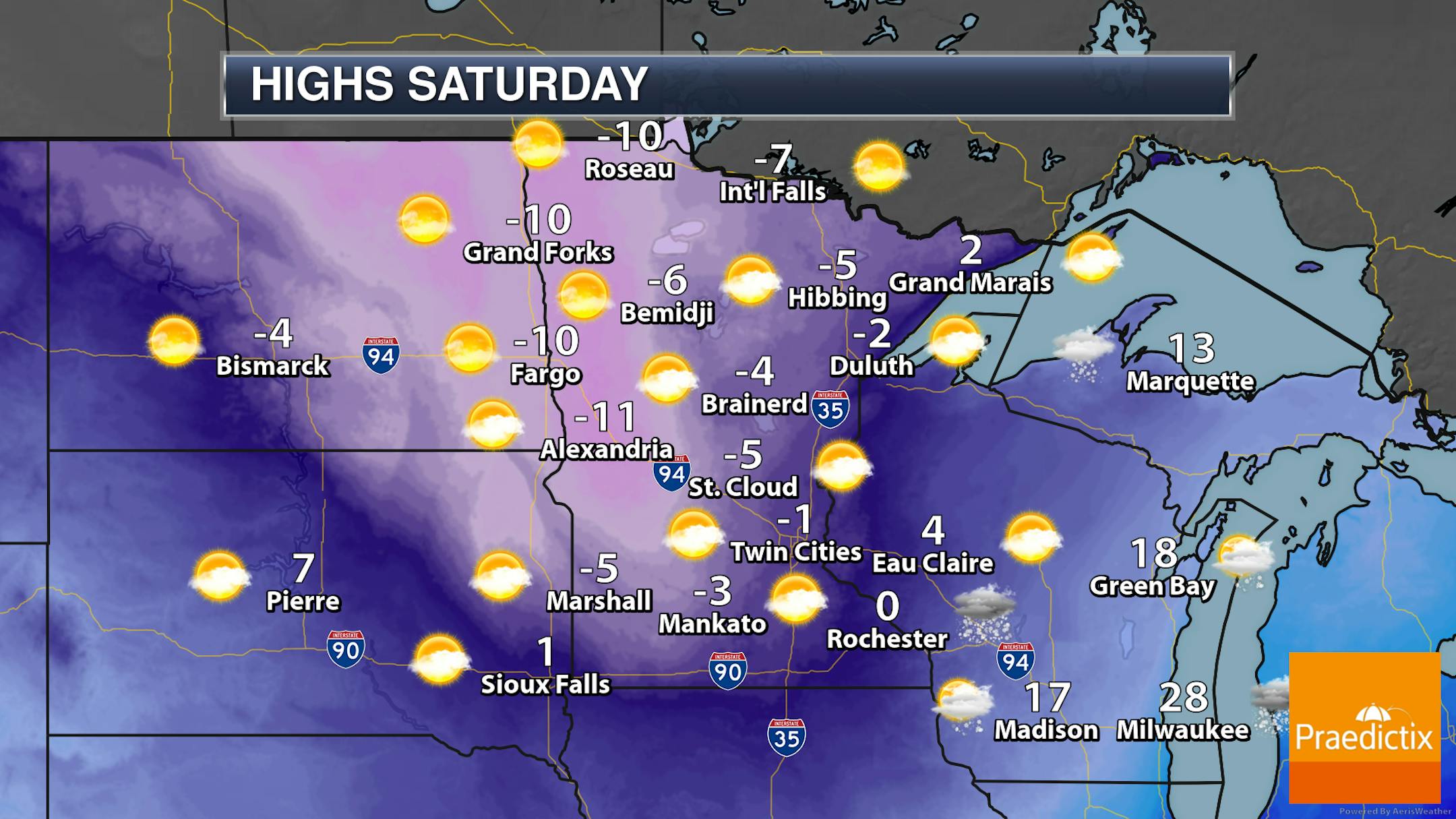 As you get ready to tackle your resolutions on New Year's Day, make sure you are bundled up! Morning temperatures will be at least in the -20s across parts of central and northern Minnesota, with a morning low around -8F in the Twin Cities.
