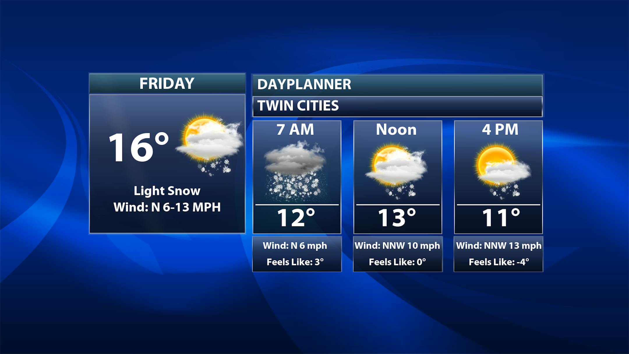 As we say goodbye to 2021 on Friday, we will be watching the chance for some snow - but it appears the better chance will be to the north of the metro. Temperatures won't budge much in the low to mid-teens as we head throughout the day with another batch of cold air moving on in.