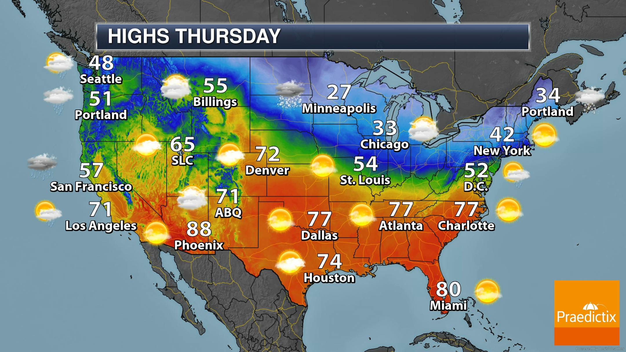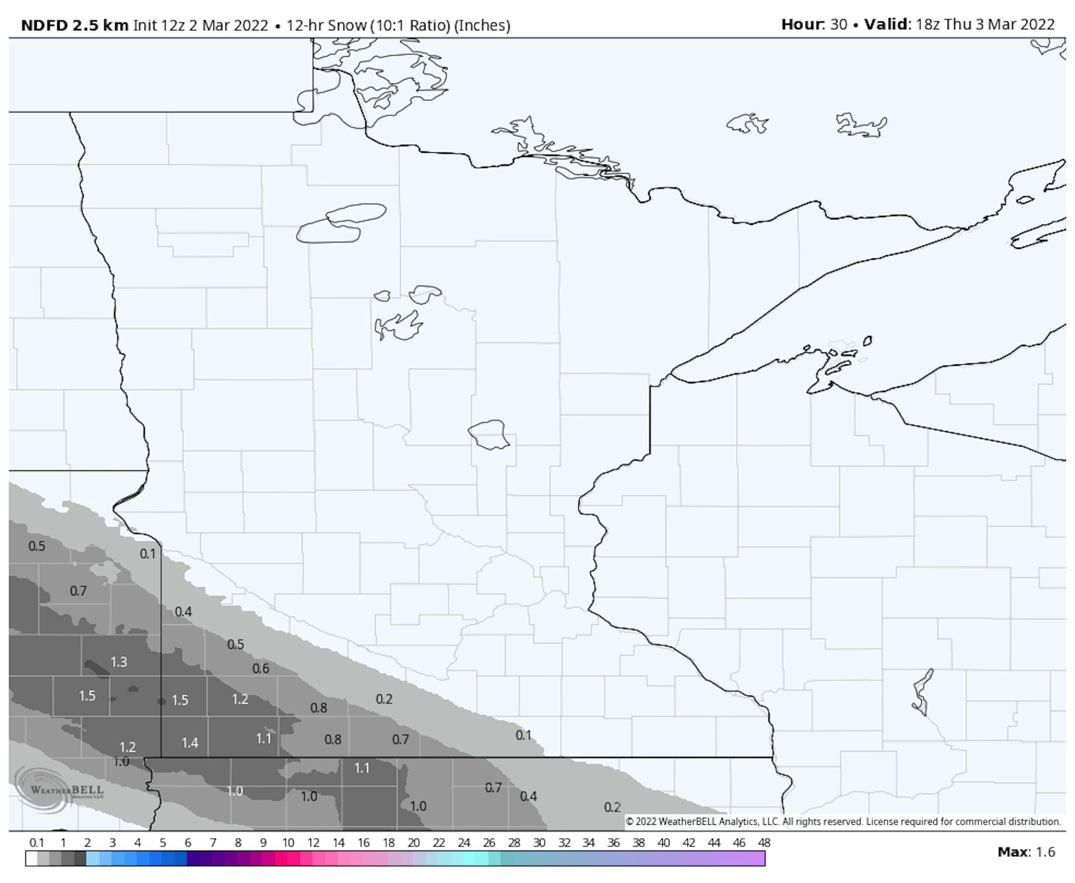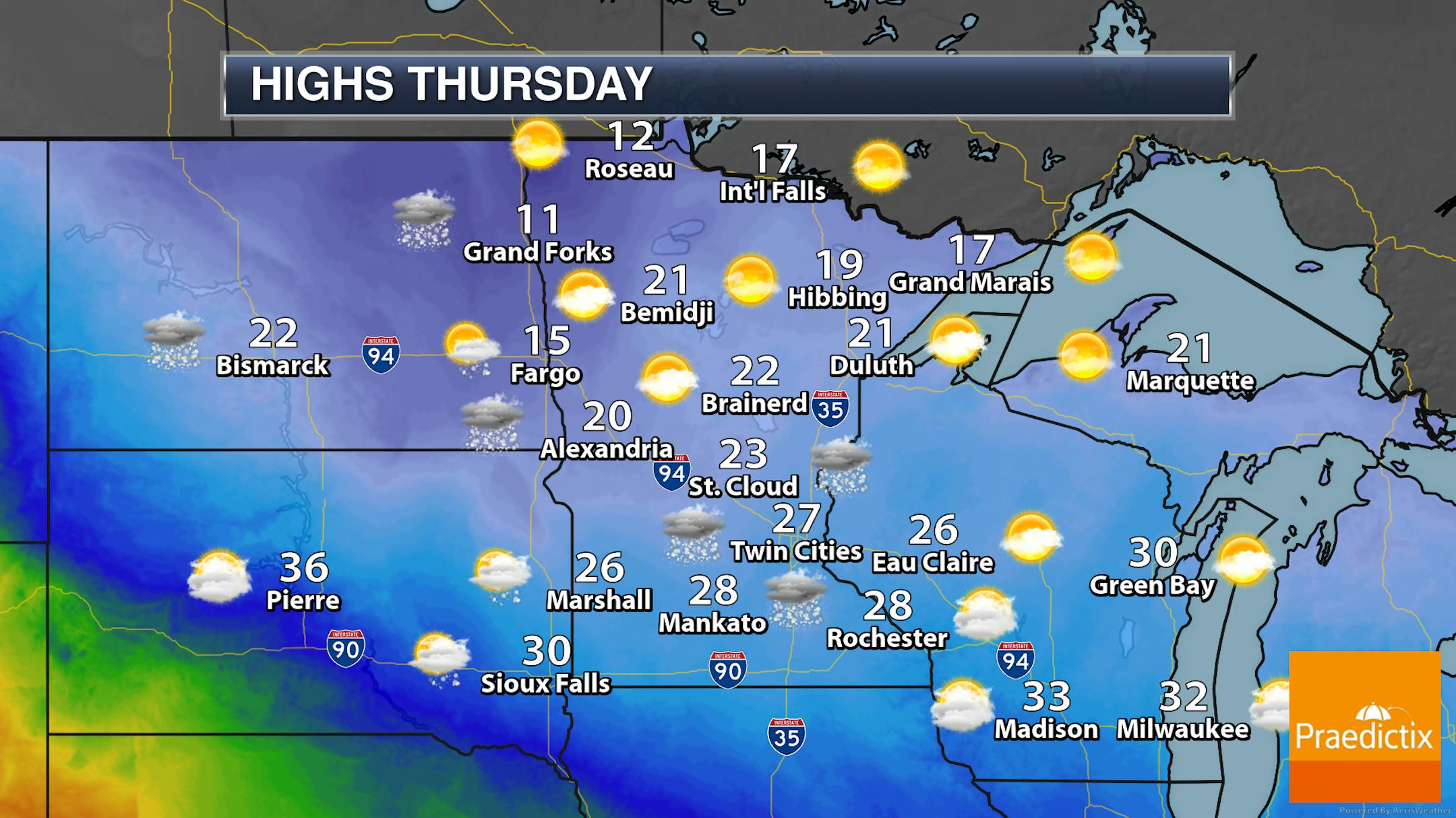Again, the best chances of snow during the daytime hours Thursday will be across southwestern Minnesota during the morning (mainly south of the Minnesota River), otherwise, cloudier skies are expected in southern Minnesota with sunnier skies as you head north. Highs will be in the teens and 20s across the state - up to 15F degrees below average.
