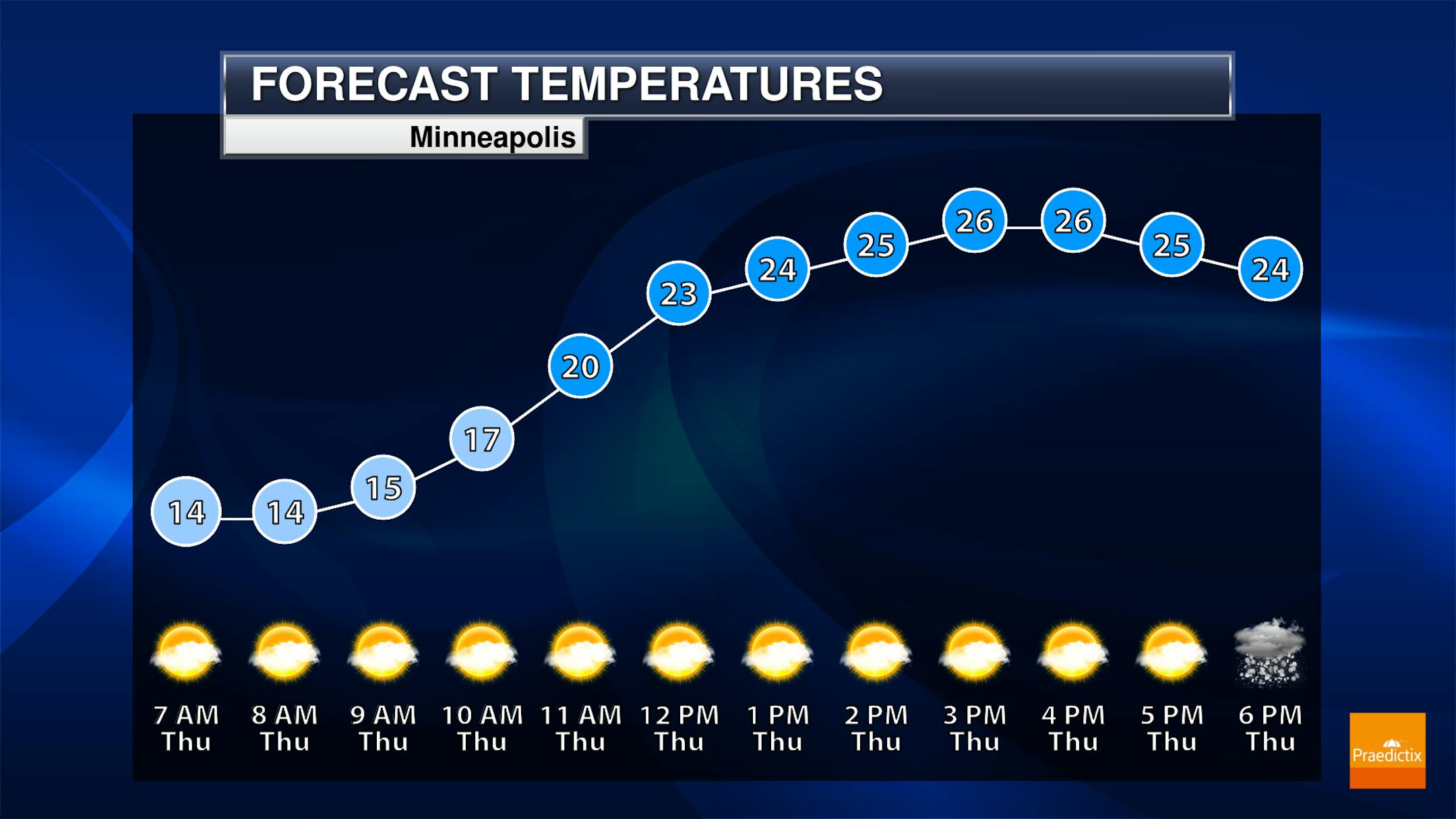 A mainly cloudy day is expected Thursday in the Twin Cities, with the chance of a few snow showers as we head into the evening hours (more on that below). Morning temperatures will start off in the mid-teens, climbing to the mid-20s in the afternoon.