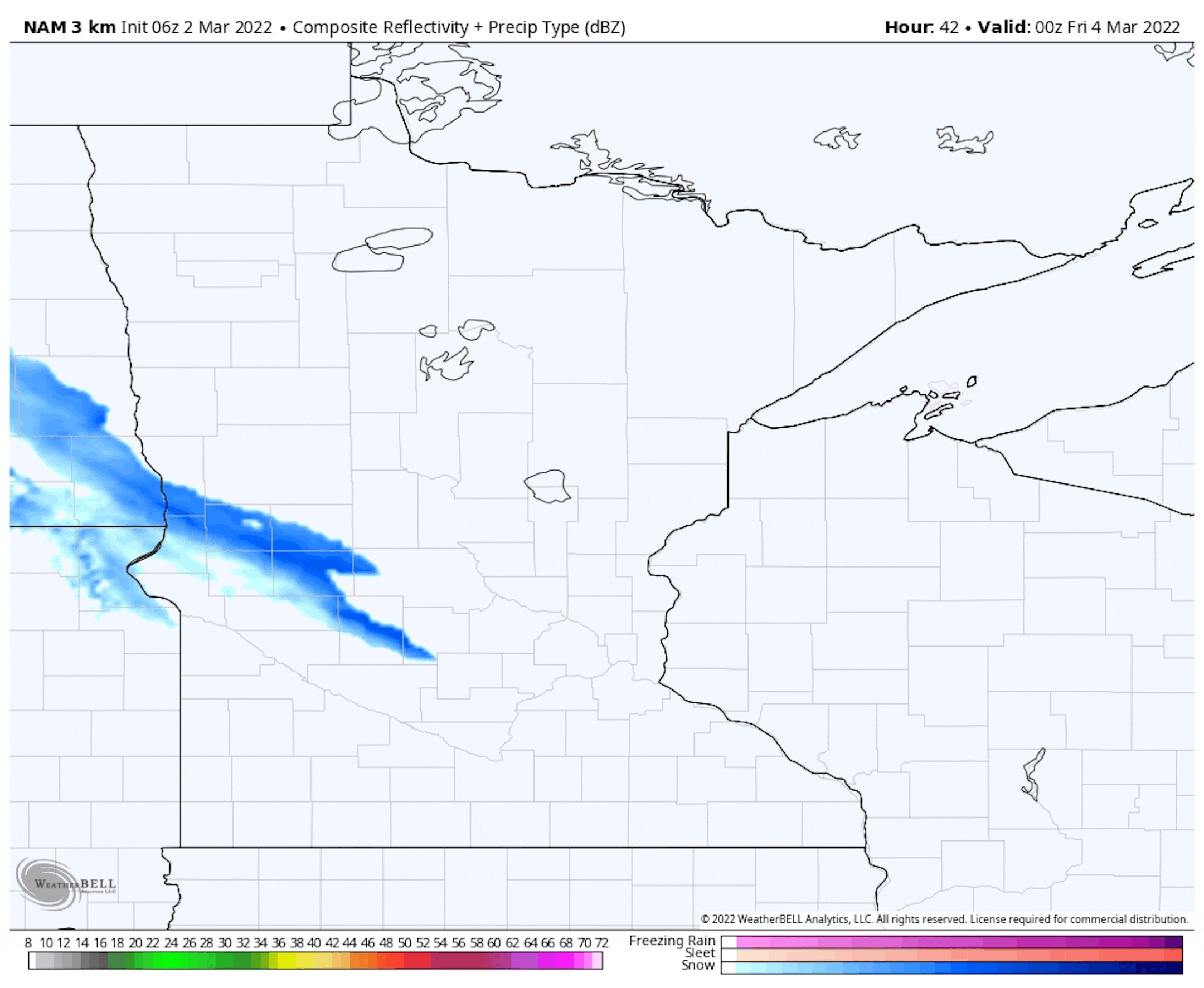 The next chance of some light snow to impact the state will move into southwestern Minnesota Wednesday Night, lasting into early Thursday. A narrow band of snow is expected to produce snowfall amounts up to 2" through the midday hours Thursday mainly south of the Minnesota River.
