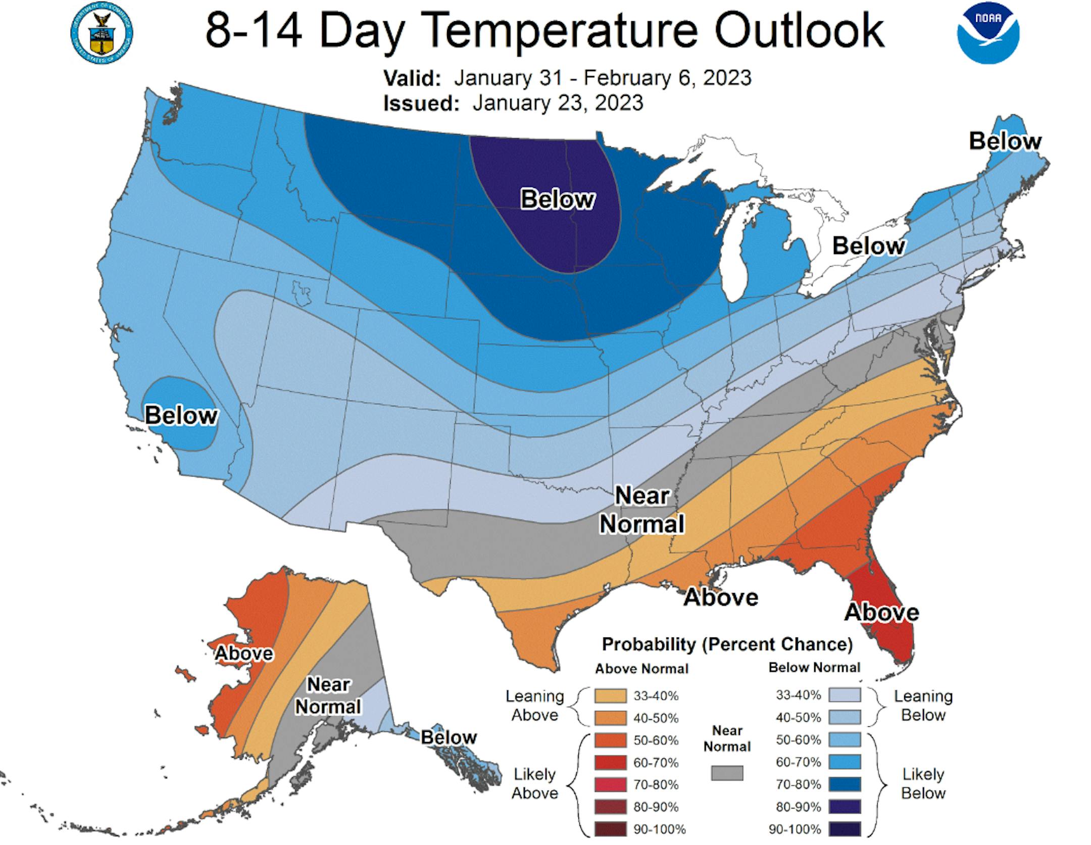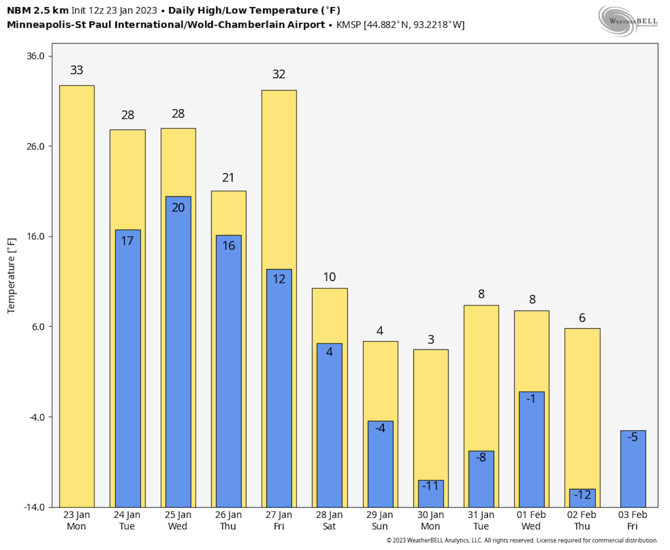 Here's the NBM extended temperature outlook for Minneapolis. Note that temps will still be fairly mild through the week before some pretty chilly air arrives late Friday into the weekend. This colder than average weather may stick around into the early part of February with overnight lows in the subzero range once again.