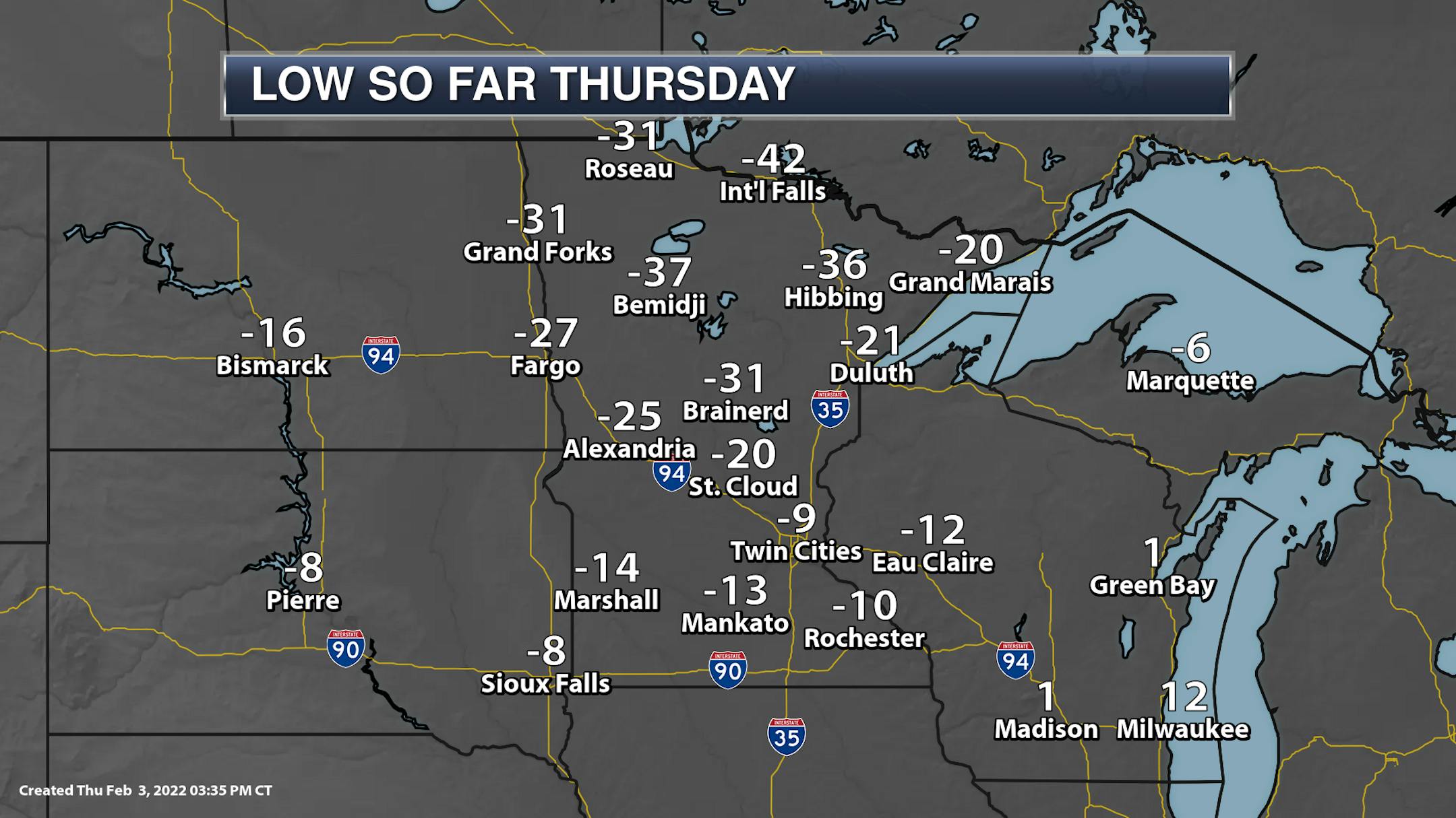 It was a bitterly cold start on Thursday across the state. While we only made it down to -9F in the metro, temperatures started the day off in the -30s and even -40s across northern Minnesota. International Falls made it down to -42F, which was a record low for the day (previous: -40F in 1982)! A low of -36F in Hibbing was also a record low this morning (previous: -32F in 1989 and 1996).