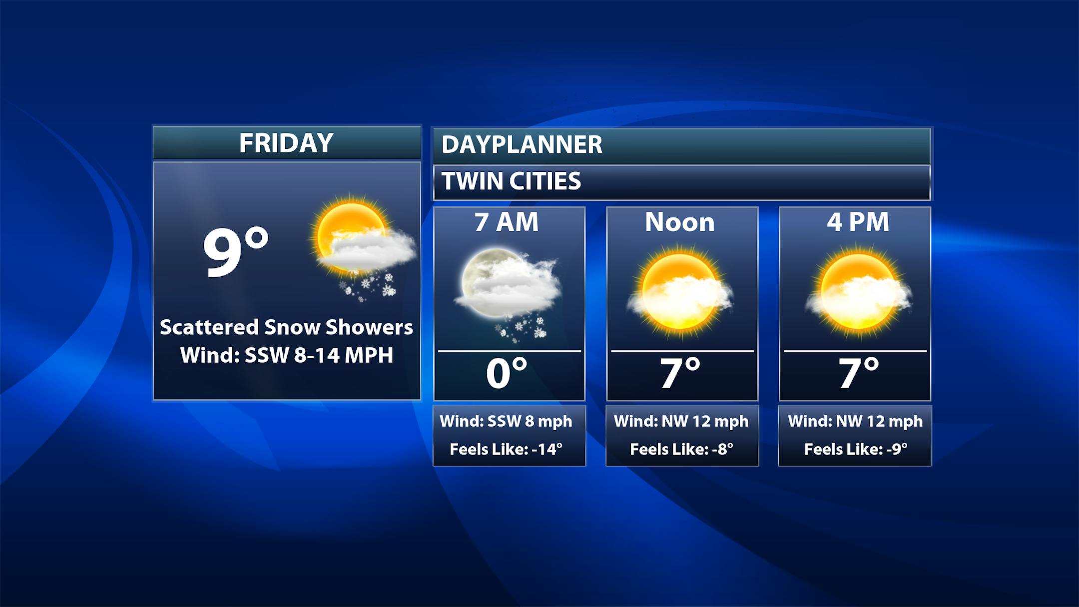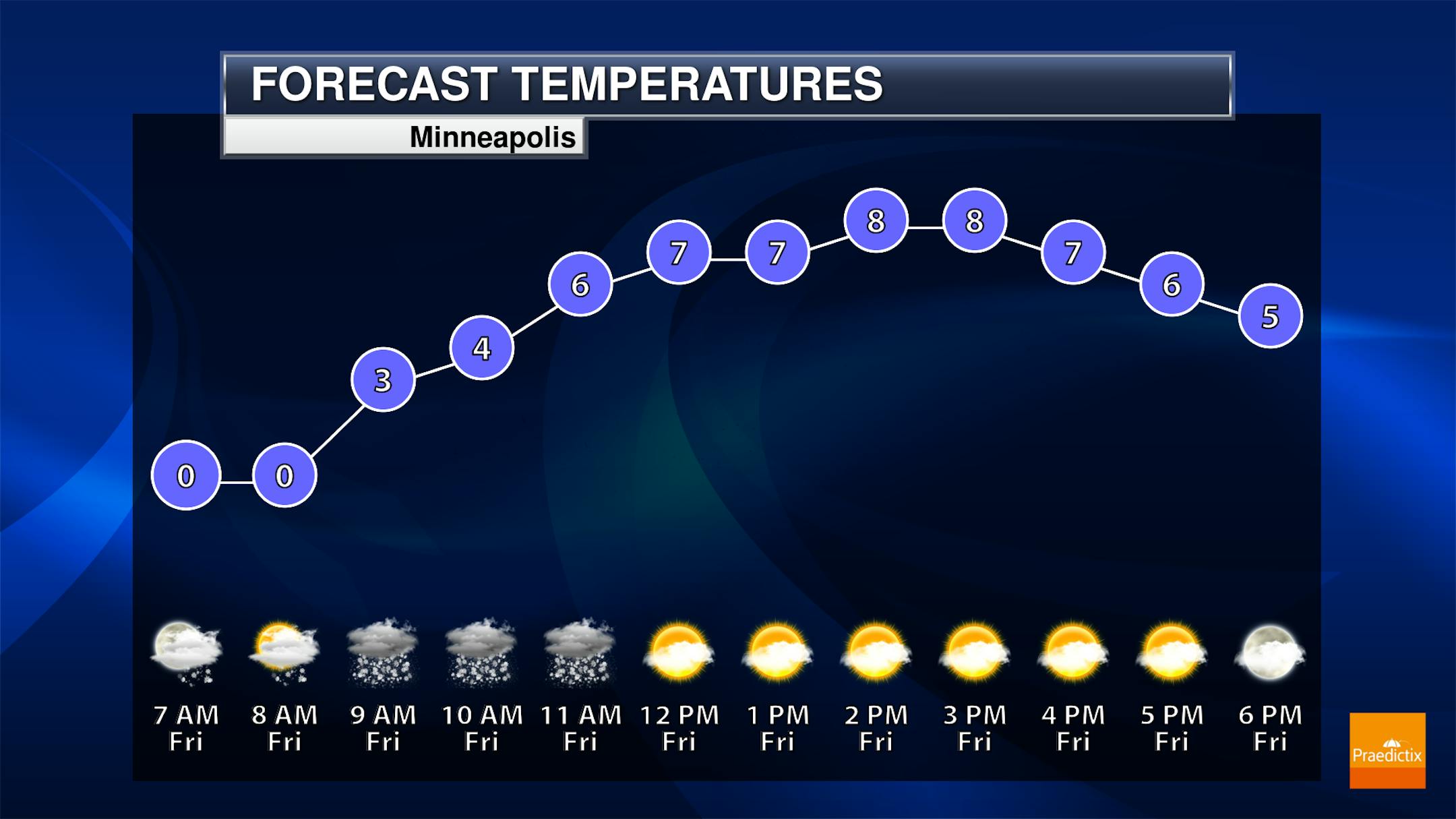 We'll watch that snow chance here in the metro during the morning commute, with clouds decreasing into the afternoon. Highs will only make it to the high single digits.