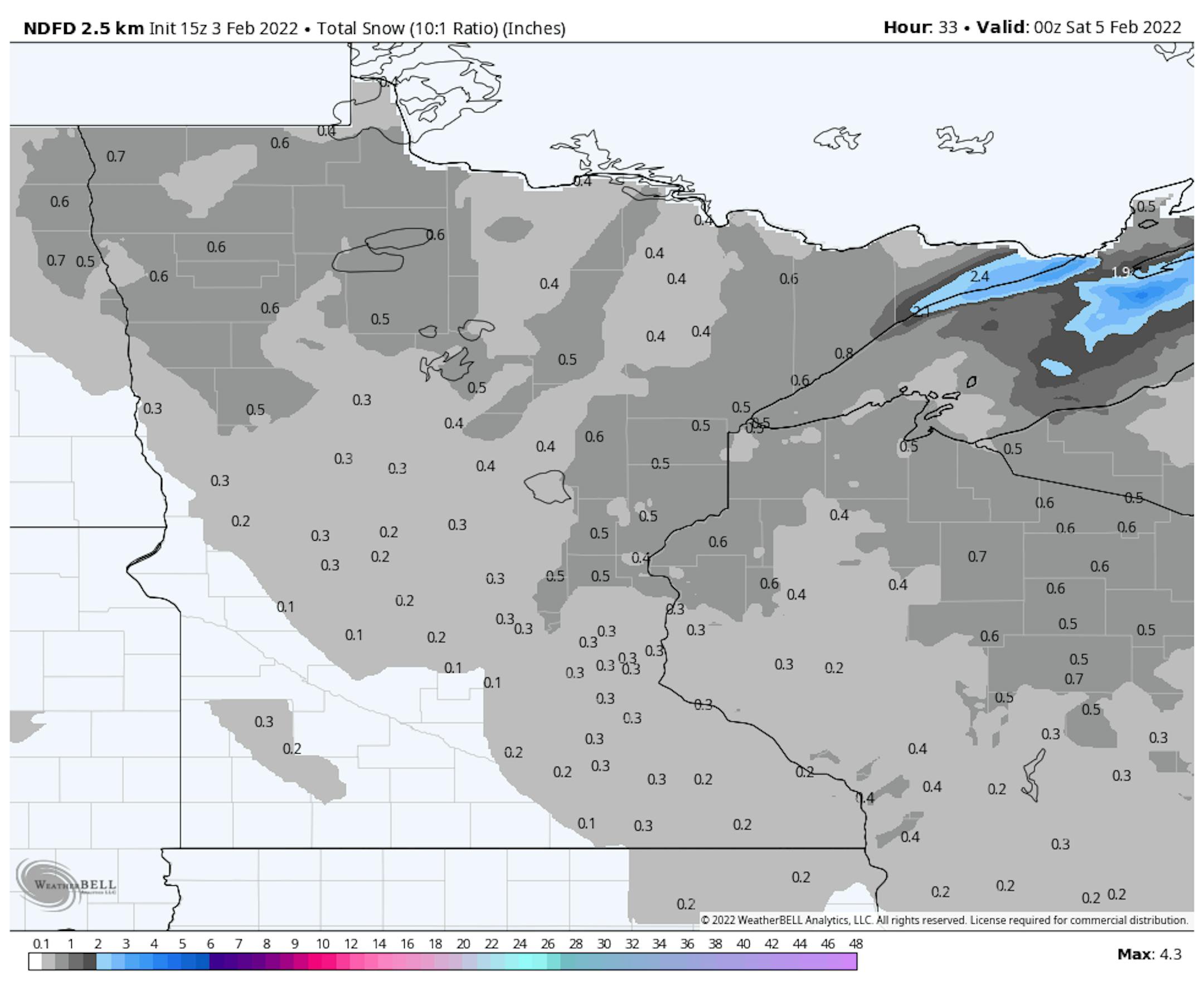 Snow totals are generally expected to be at or under half an inch for many locations. The heaviest snow will fall across parts of the North Shore, where areas like Grand Marais could see about 2" of snow.
