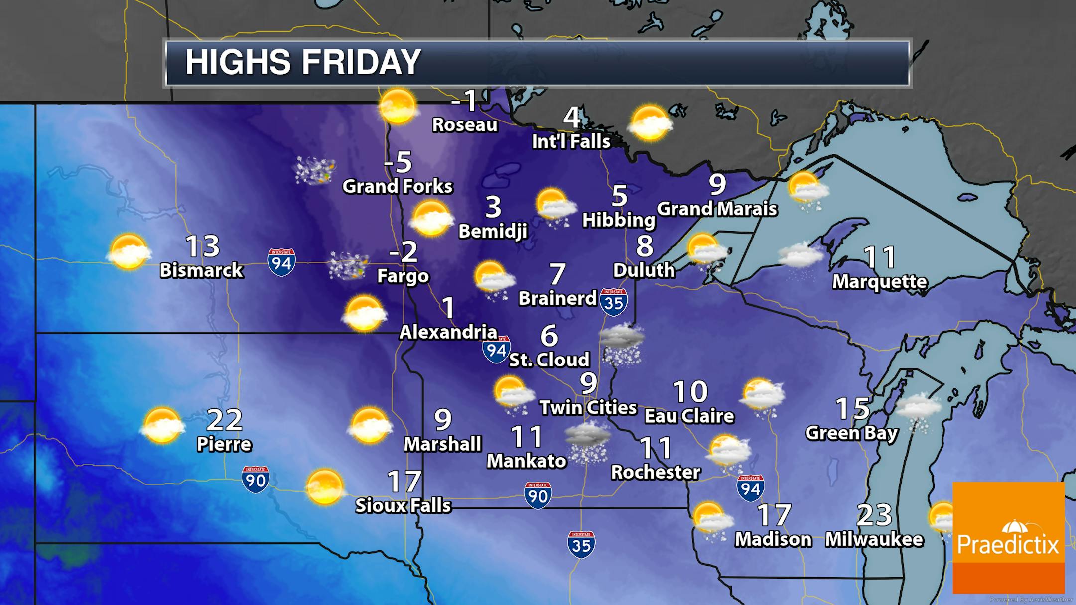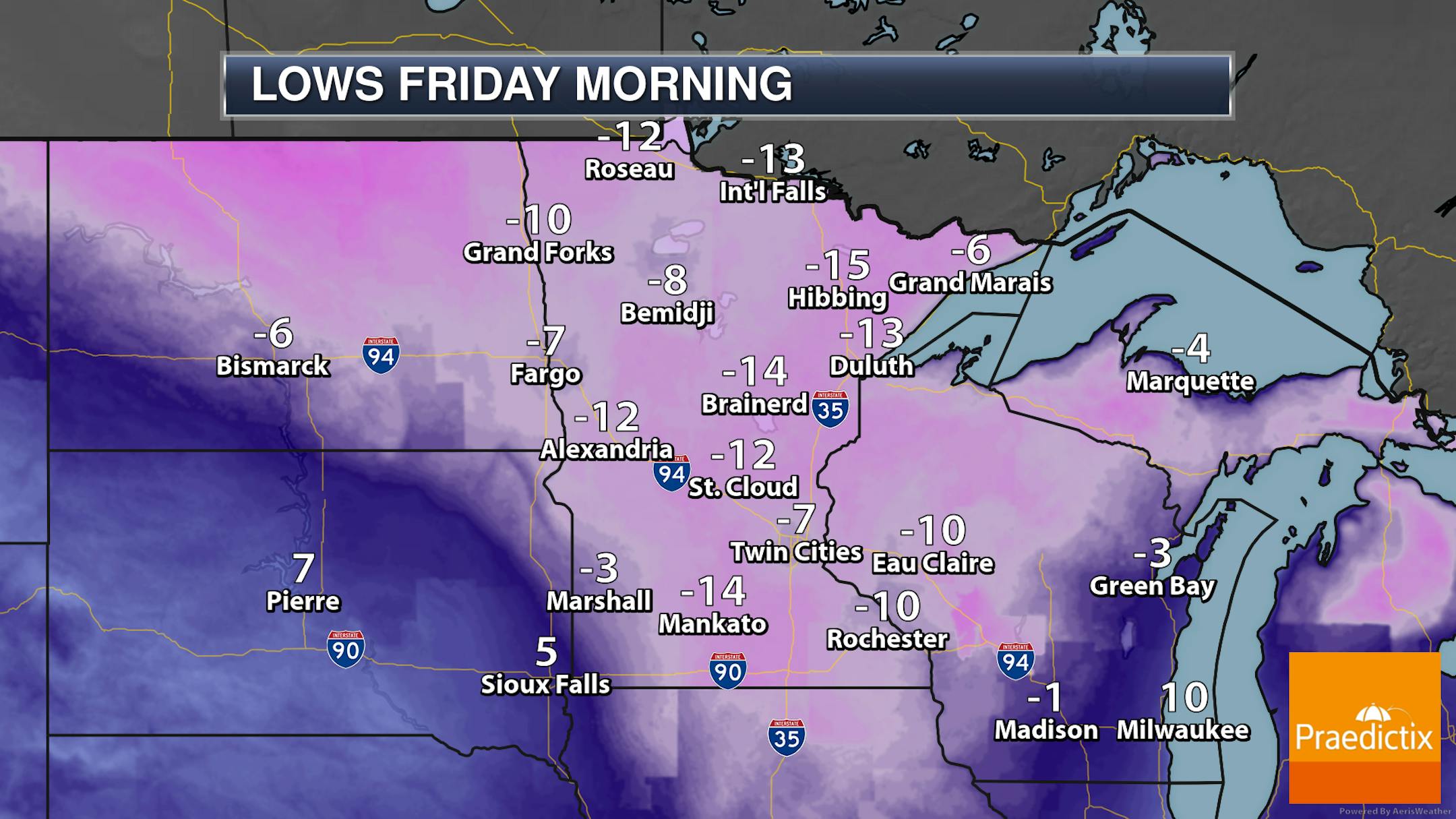 The good news is that it won't be as cold to start Friday morning, with only a low of -7F in the Twin Cities (not like that feels that much different than -9F!). However, temperatures will only reach the negative teens in parts of northern Minnesota.