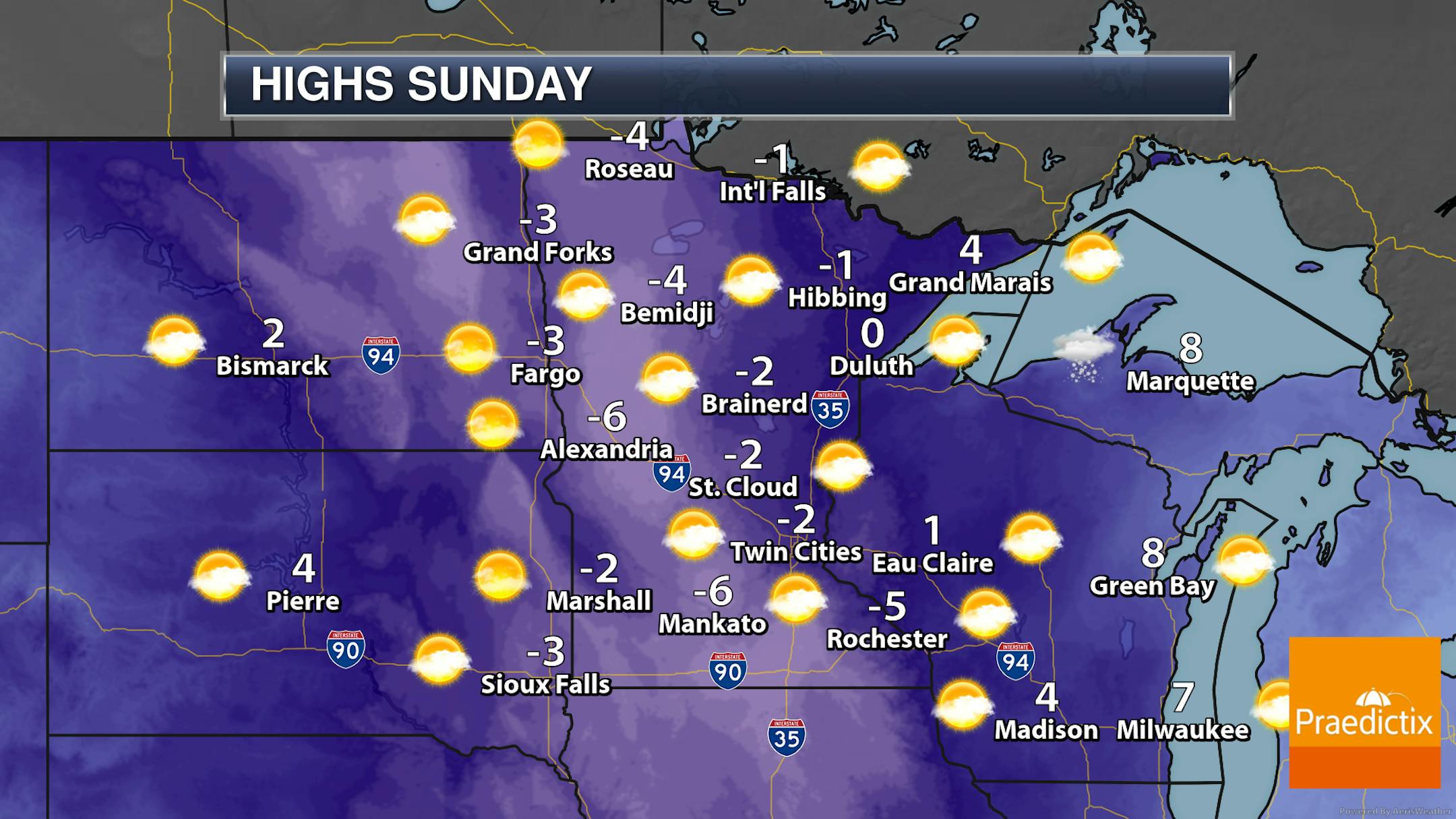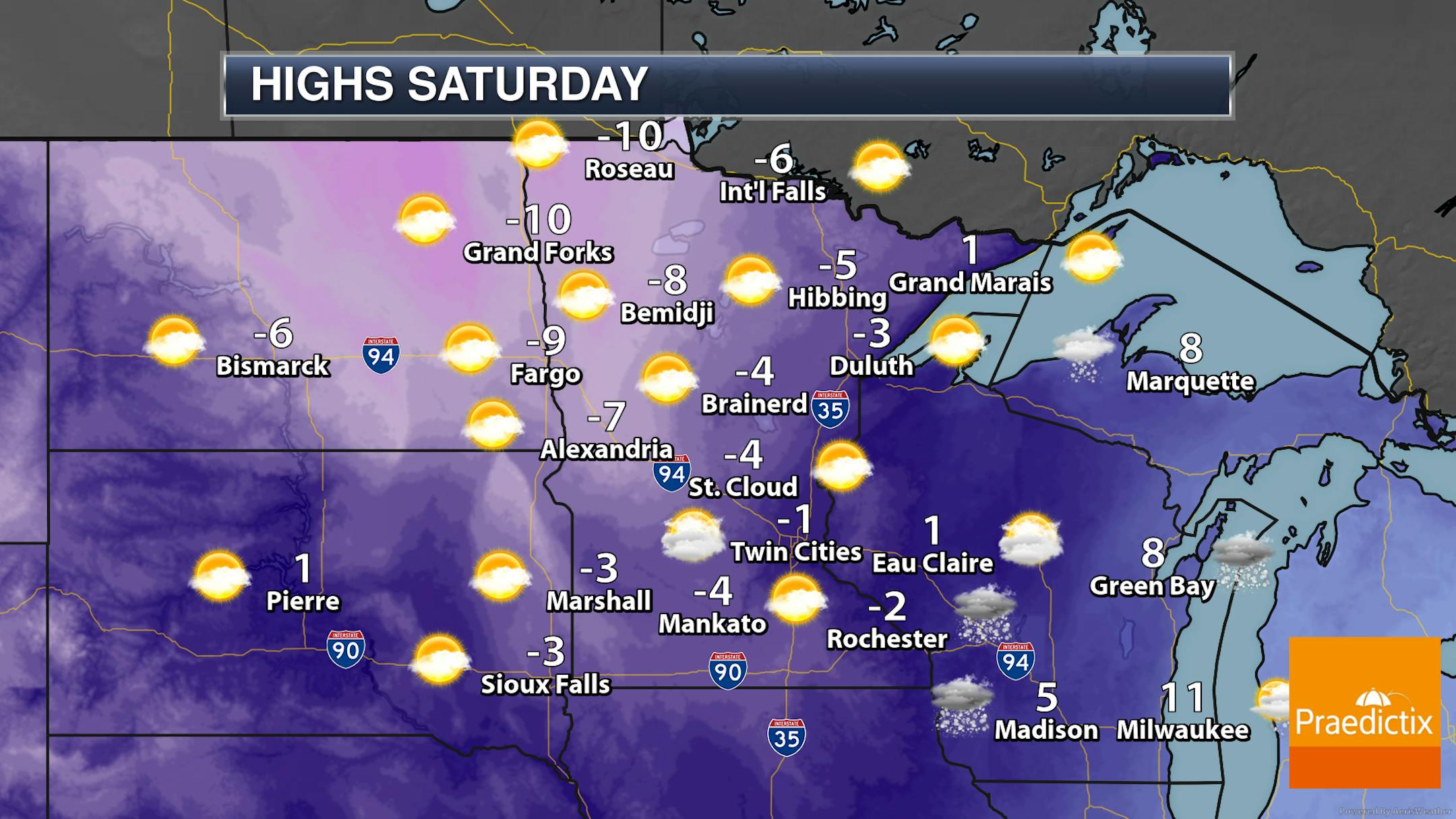 Highs in northern Minnesota Thursday will stay below zero, with highs from St. Cloud southward barely making it to or above zero. These highs will be 25F to 30F degrees below average. We will watch the light snow chance across the southern half of the state.