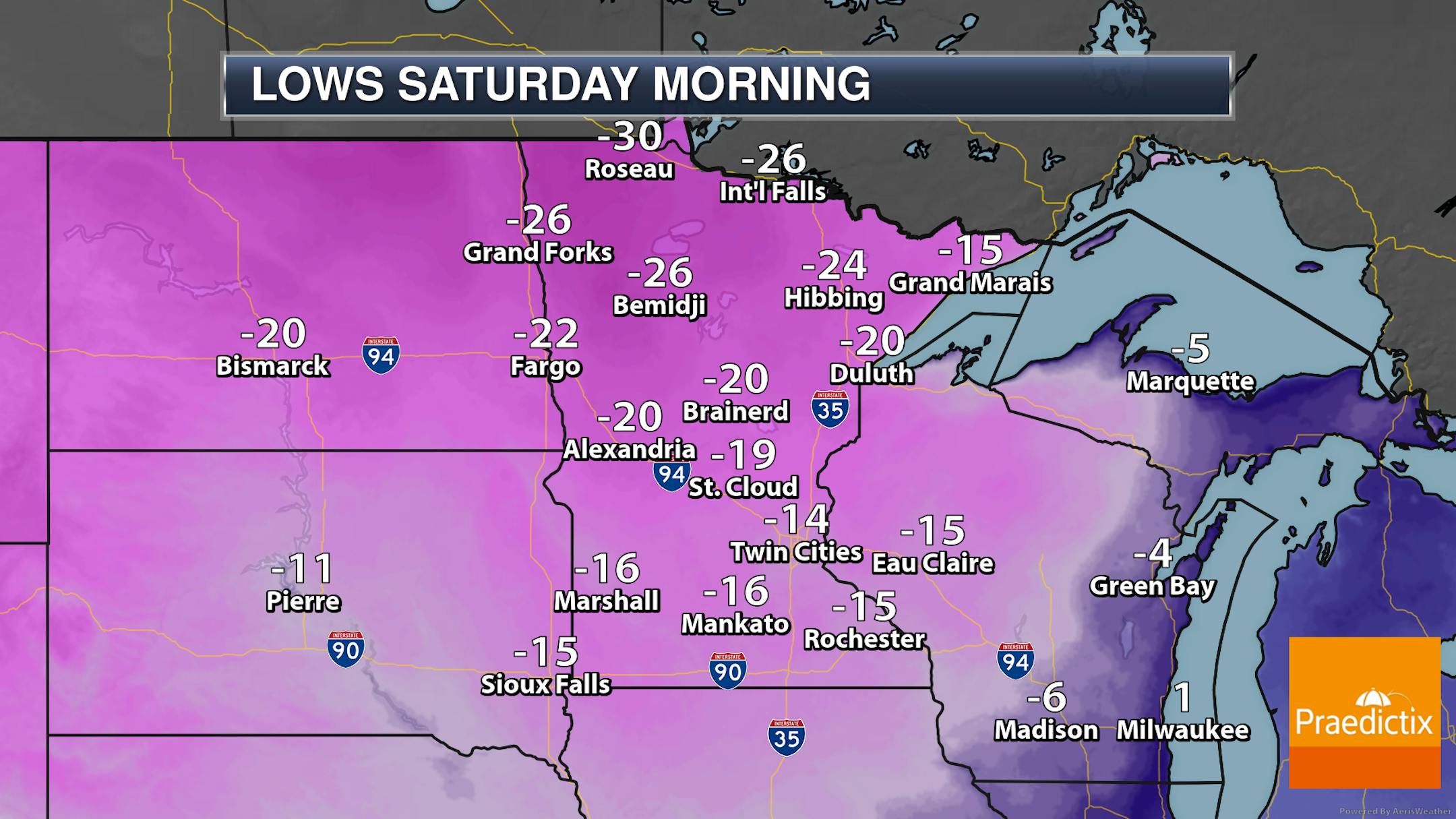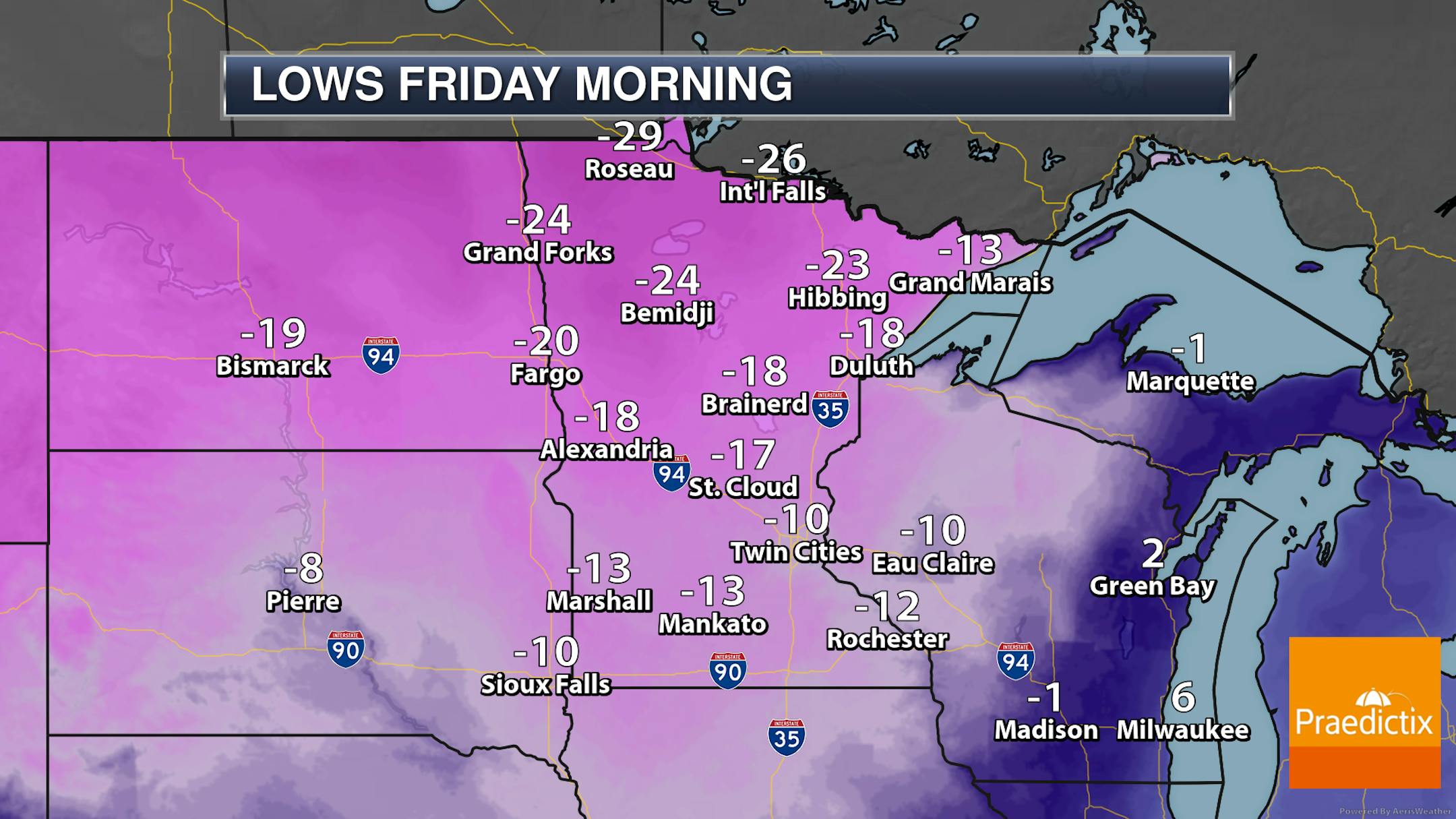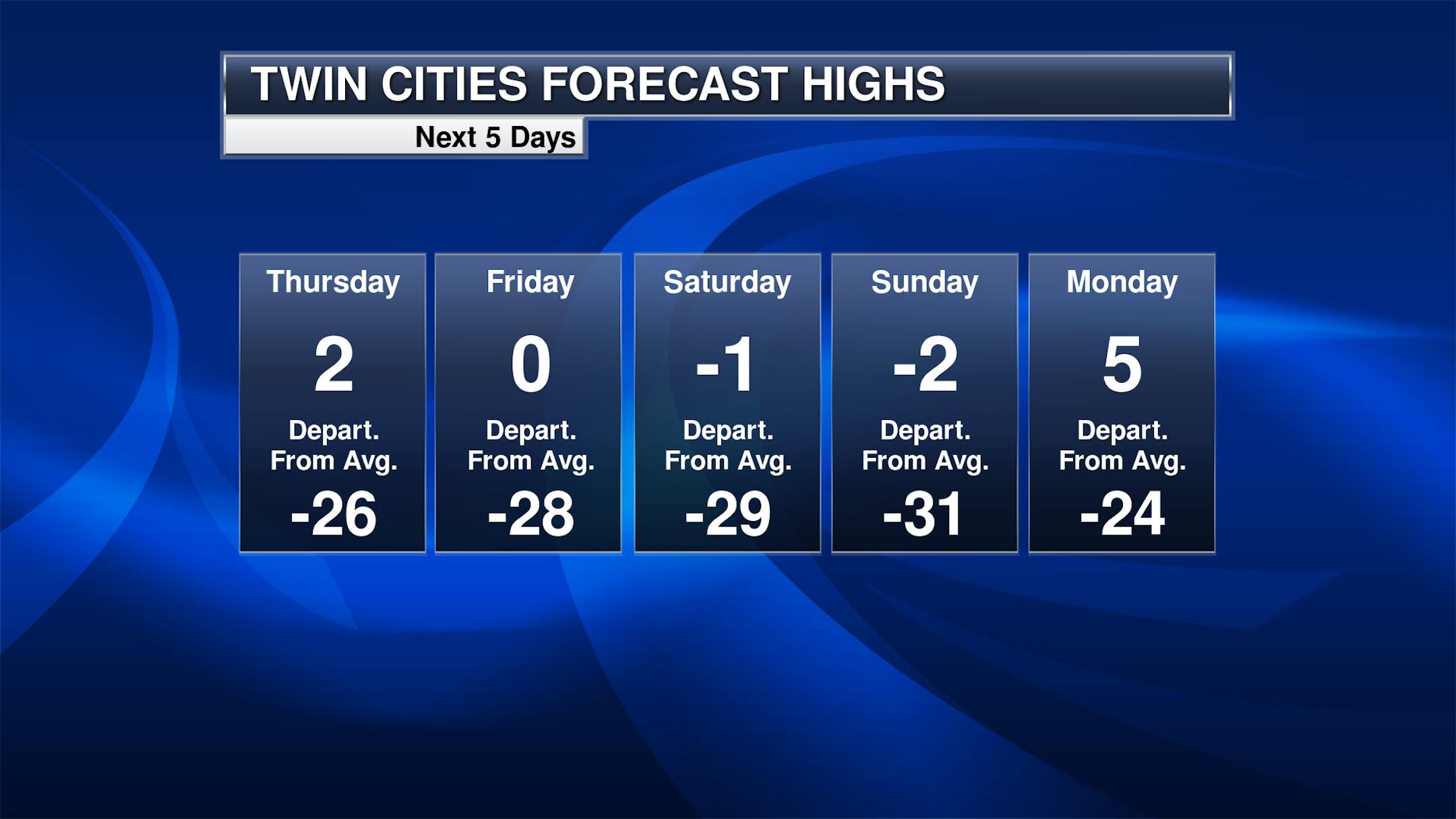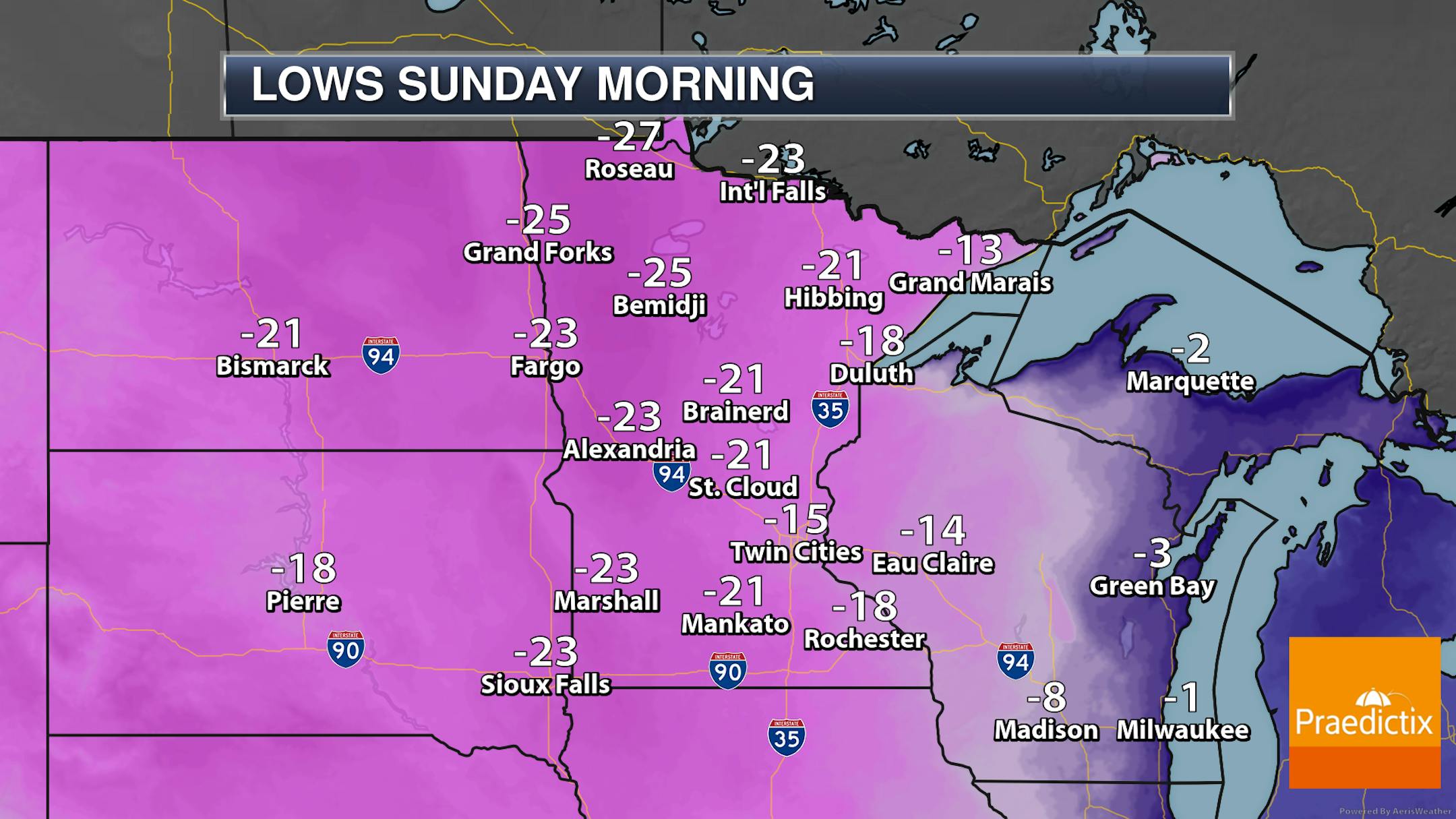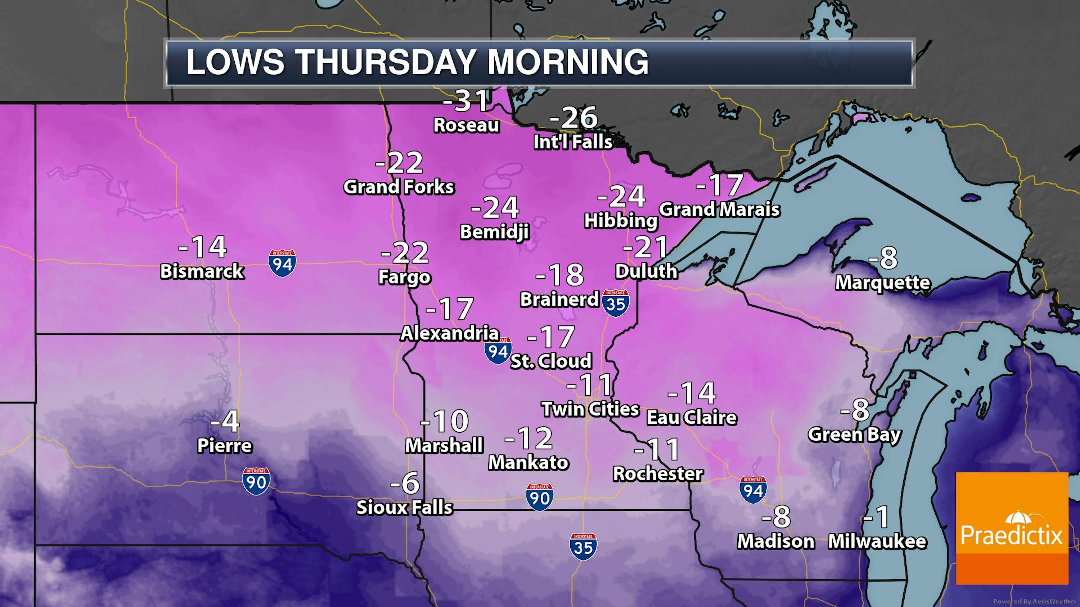 I am running out of words to say that it's still cold out there - and it will be once again Thursday. Most areas of the state will be in the double digits below zero for morning lows, with the negative 30s possible in northern Minnesota. In some areas far up north, wind chills could approach -50F.