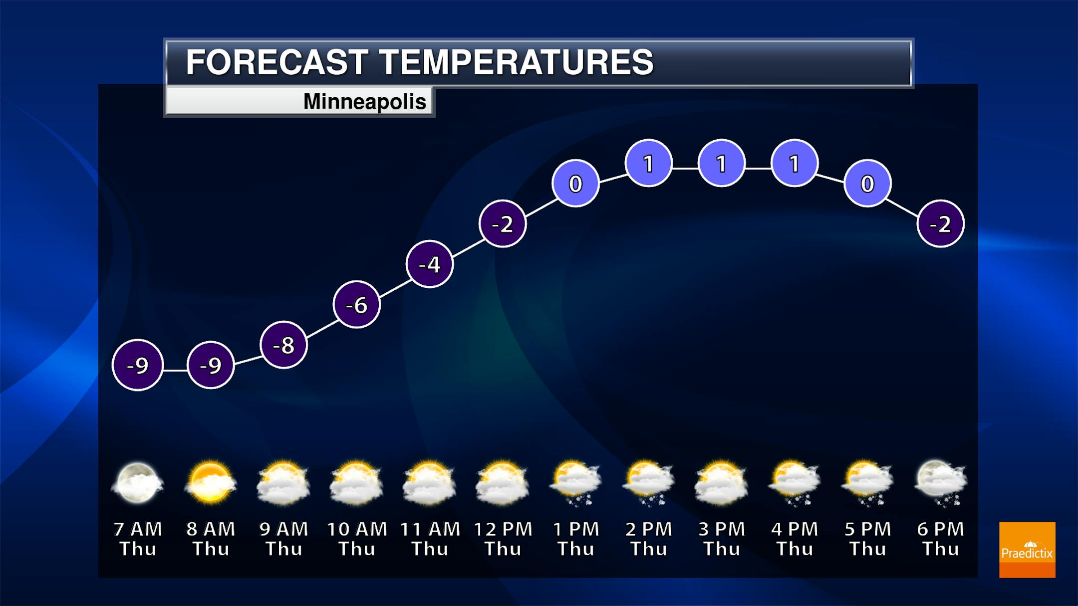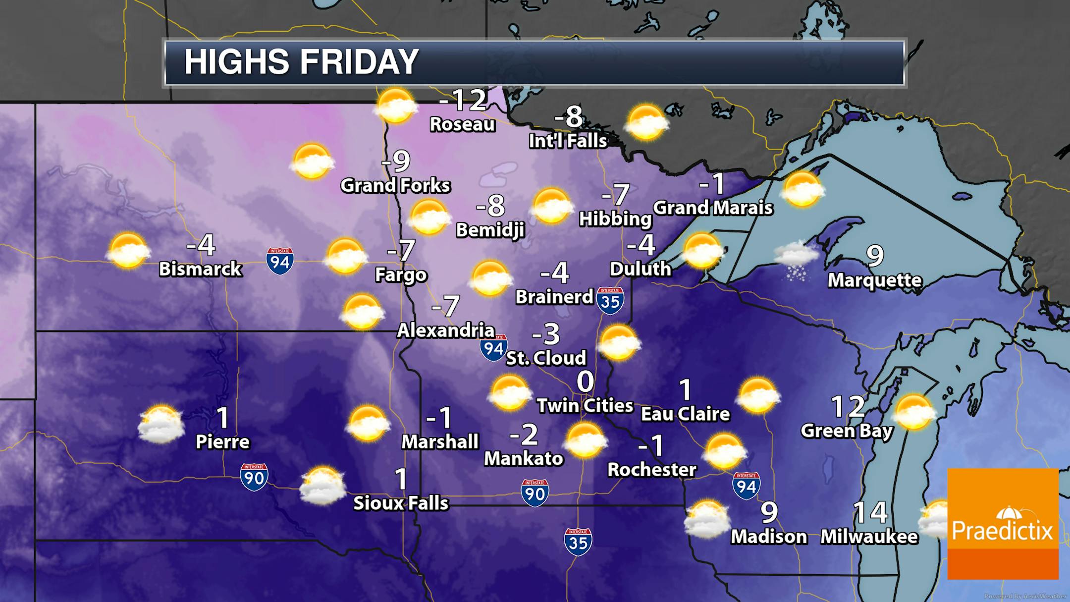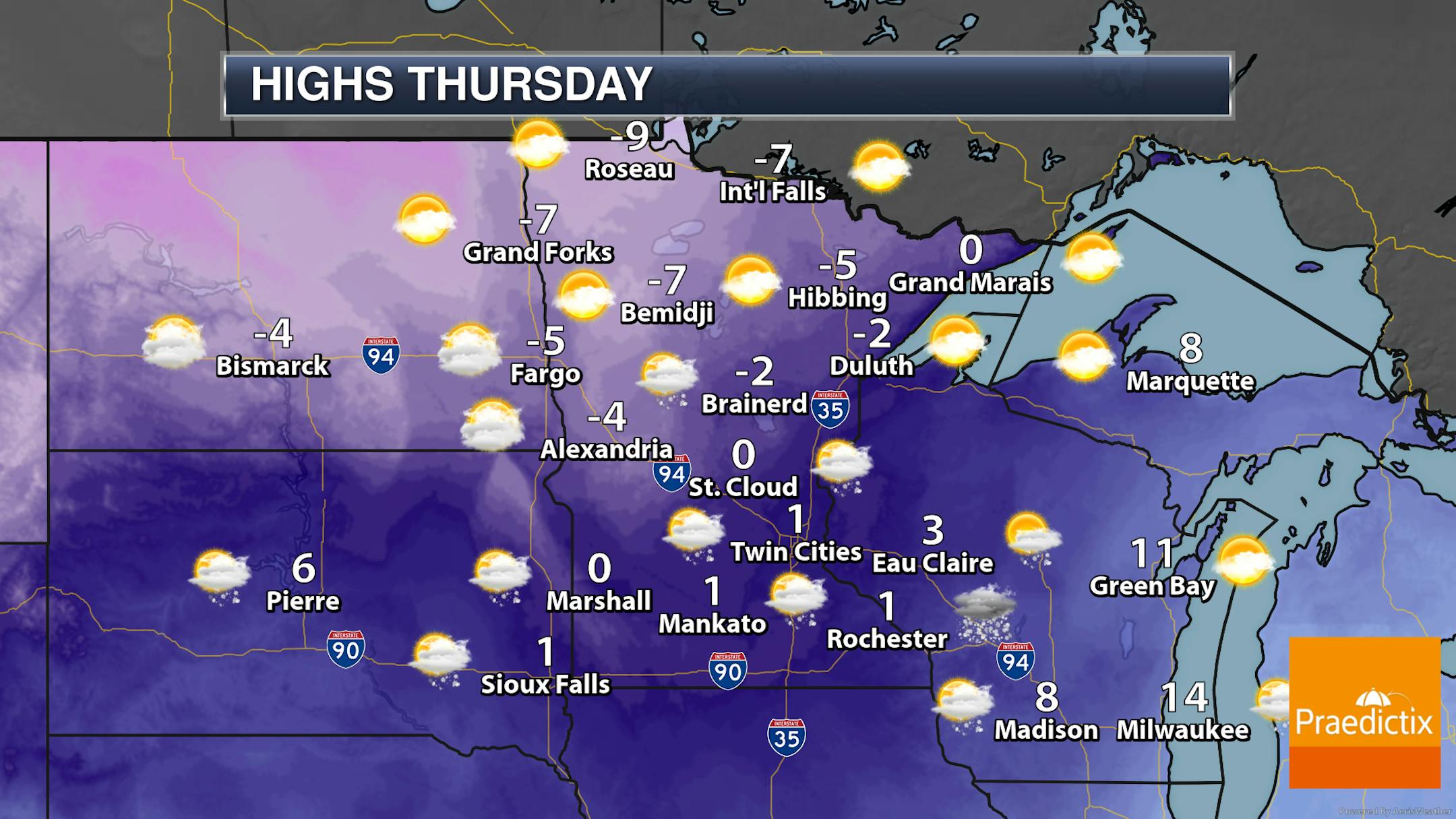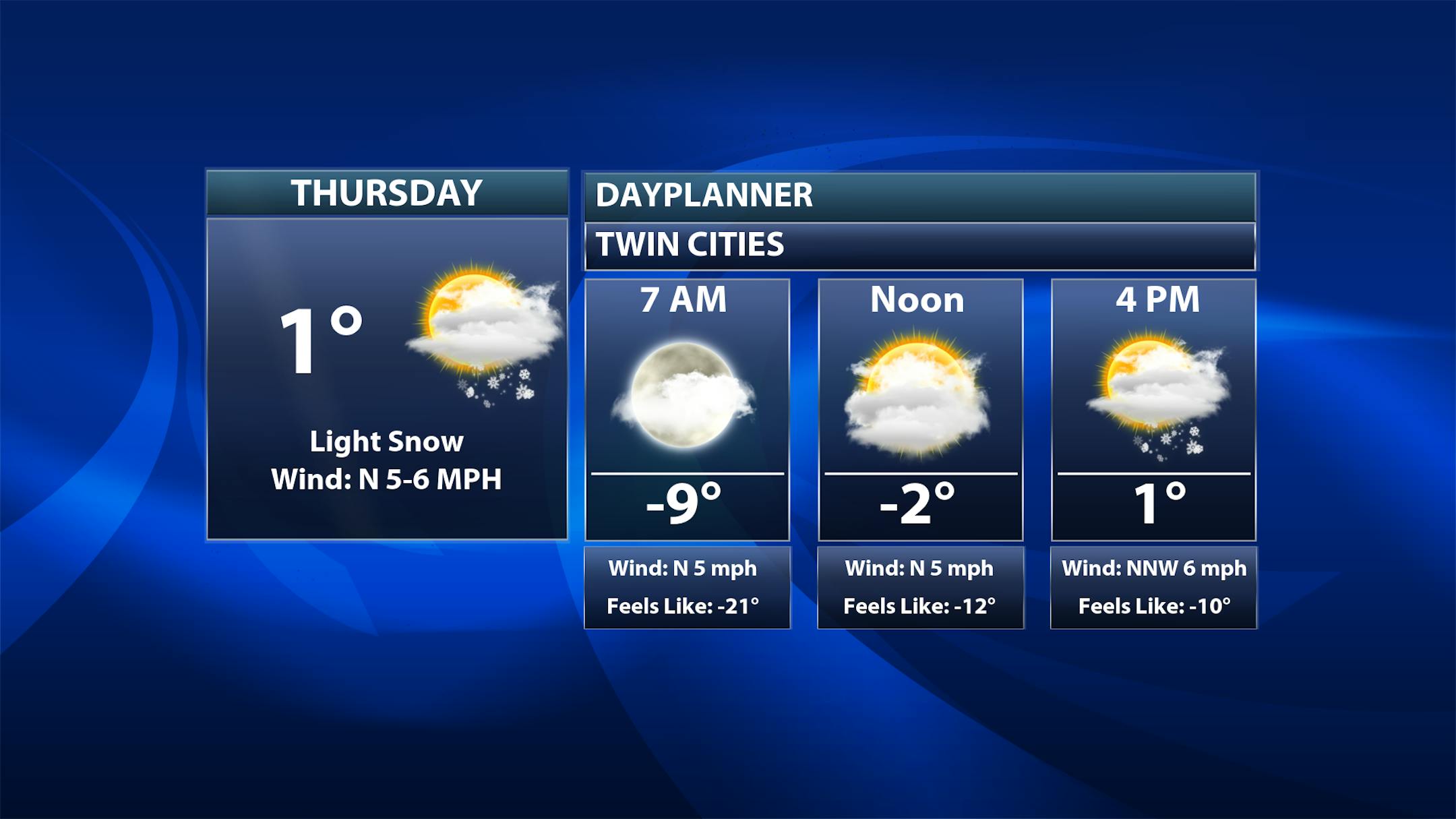Afternoon highs in the Twin Cities Thursday will barely climb above zero, with wind chill values sticking in the negative teens. We will watch the chance for some light afternoon snow, but as mentioned above, this will cause slick roads heading toward the evening commute.