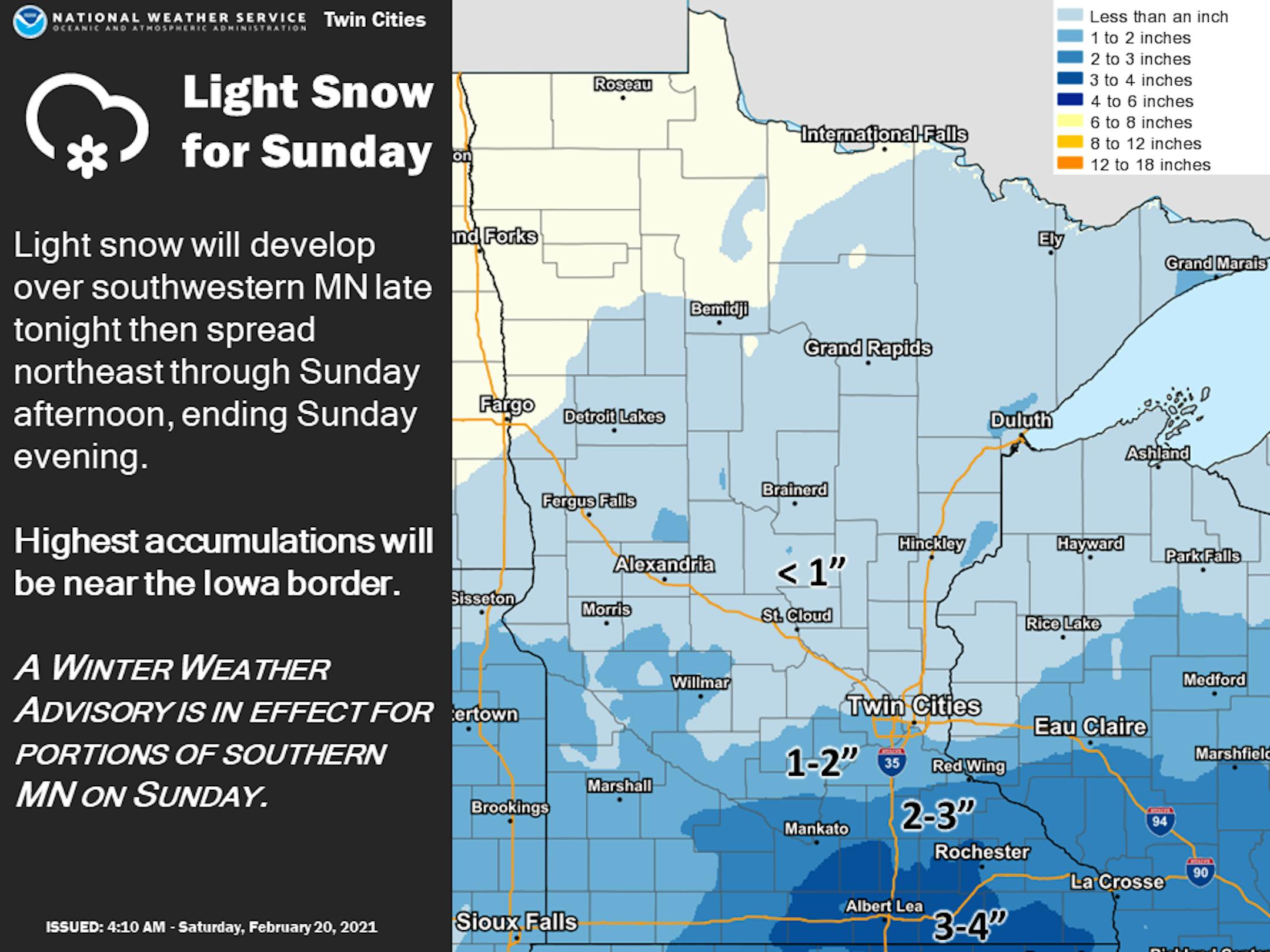 Here's the weather outlook for Minneapolis on Sunday, which shows light snow chances pushing through during the day. Folks across the southern half of the state could see 1" to 2". Note that if we warm into the 30s, it'll be the first time since February 4th.