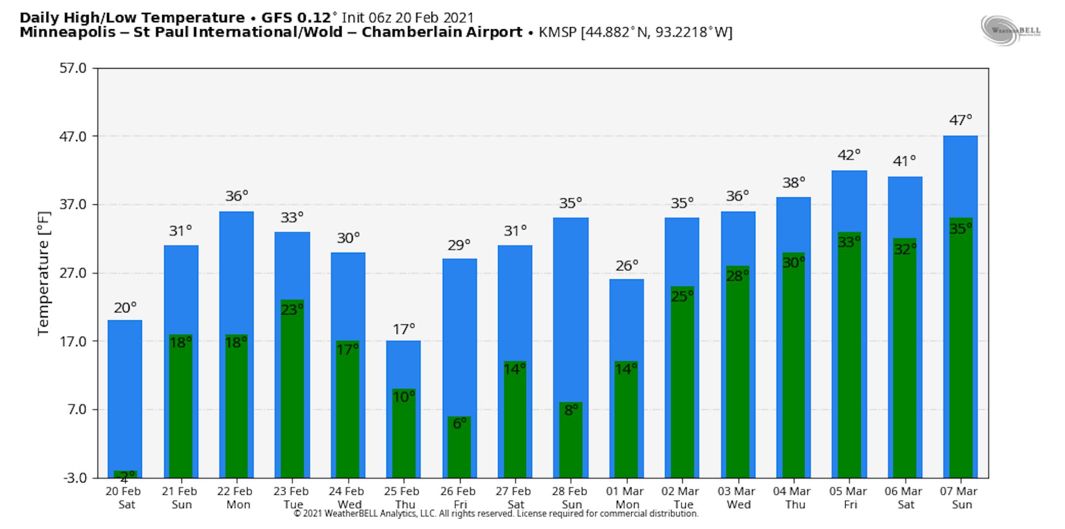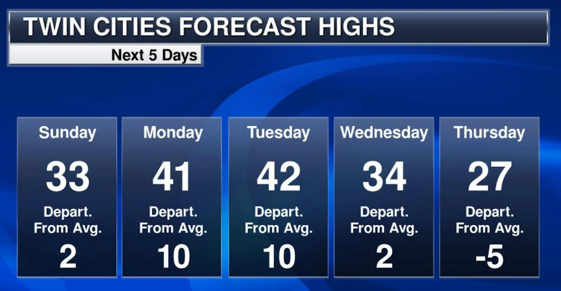 Here's the extended weather outlook for Minneapolis over the next 5 to 7 days. Note that temps will warm into the 40s on Monday and Tuesday, which will be nearly +10F above average. A cooler breeze arrives once again on Thursday with temps running below by nearly -5F, but it certainly won't be as cold as it has been.