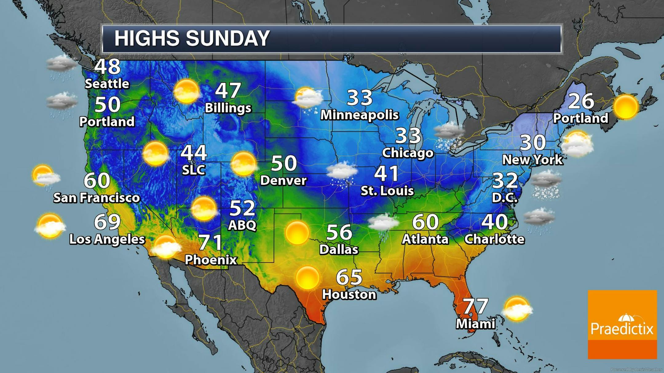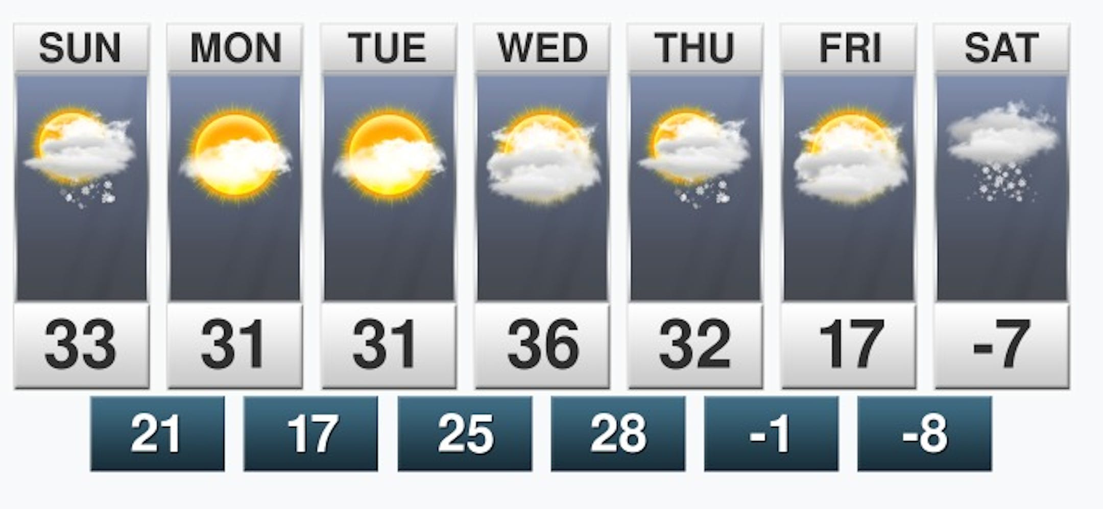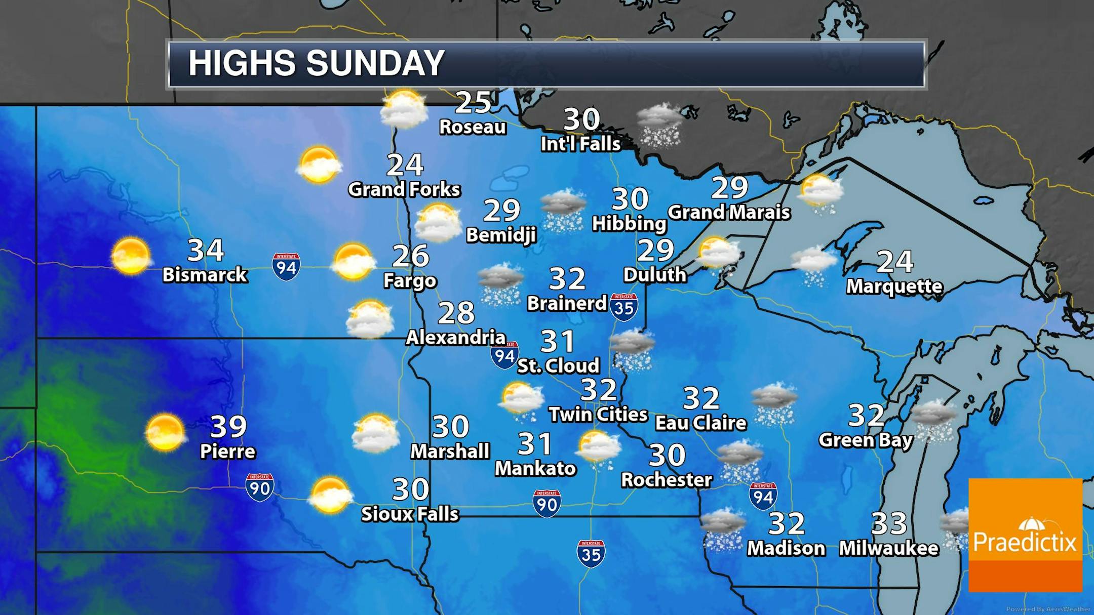 Here's the weather outlook for Sunday, which shows lingering light snow chances through the morning hours. Snow should taper through midday with drier conditions expected during the 2nd half of the day. Temps will remain milder than average with highs topping out around the freezing mark.