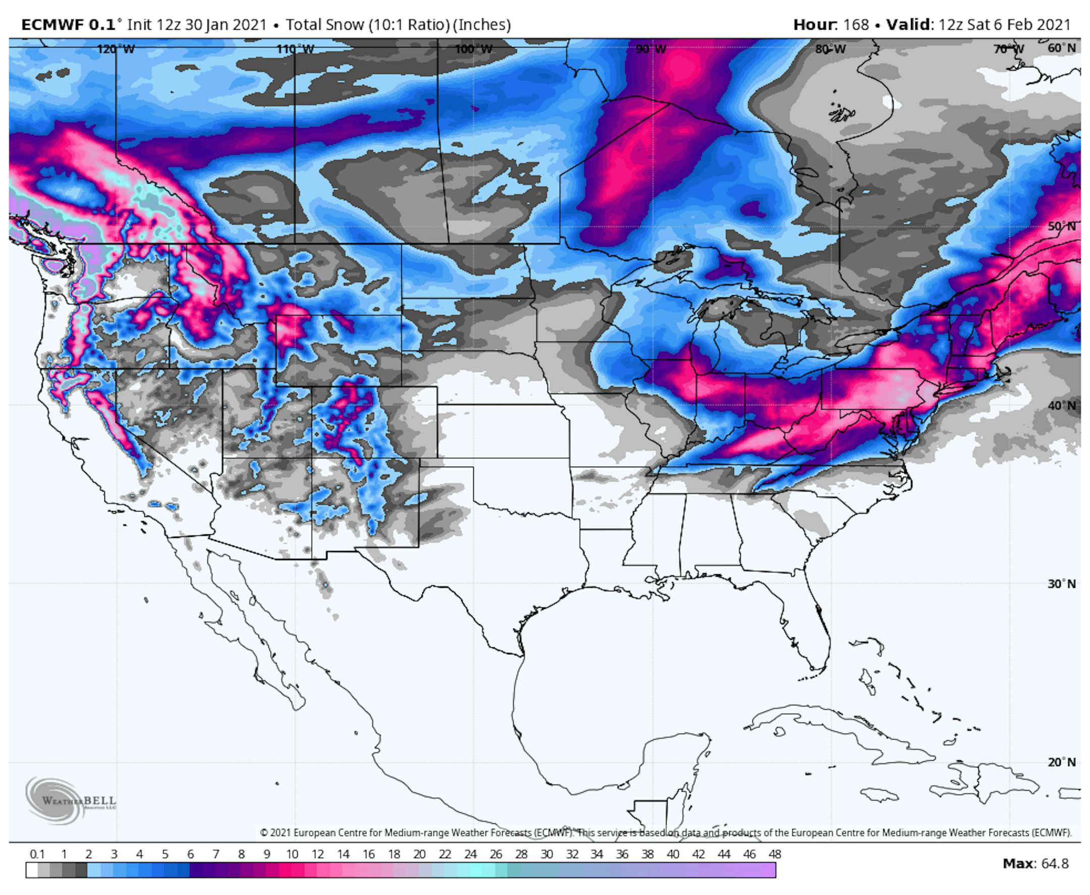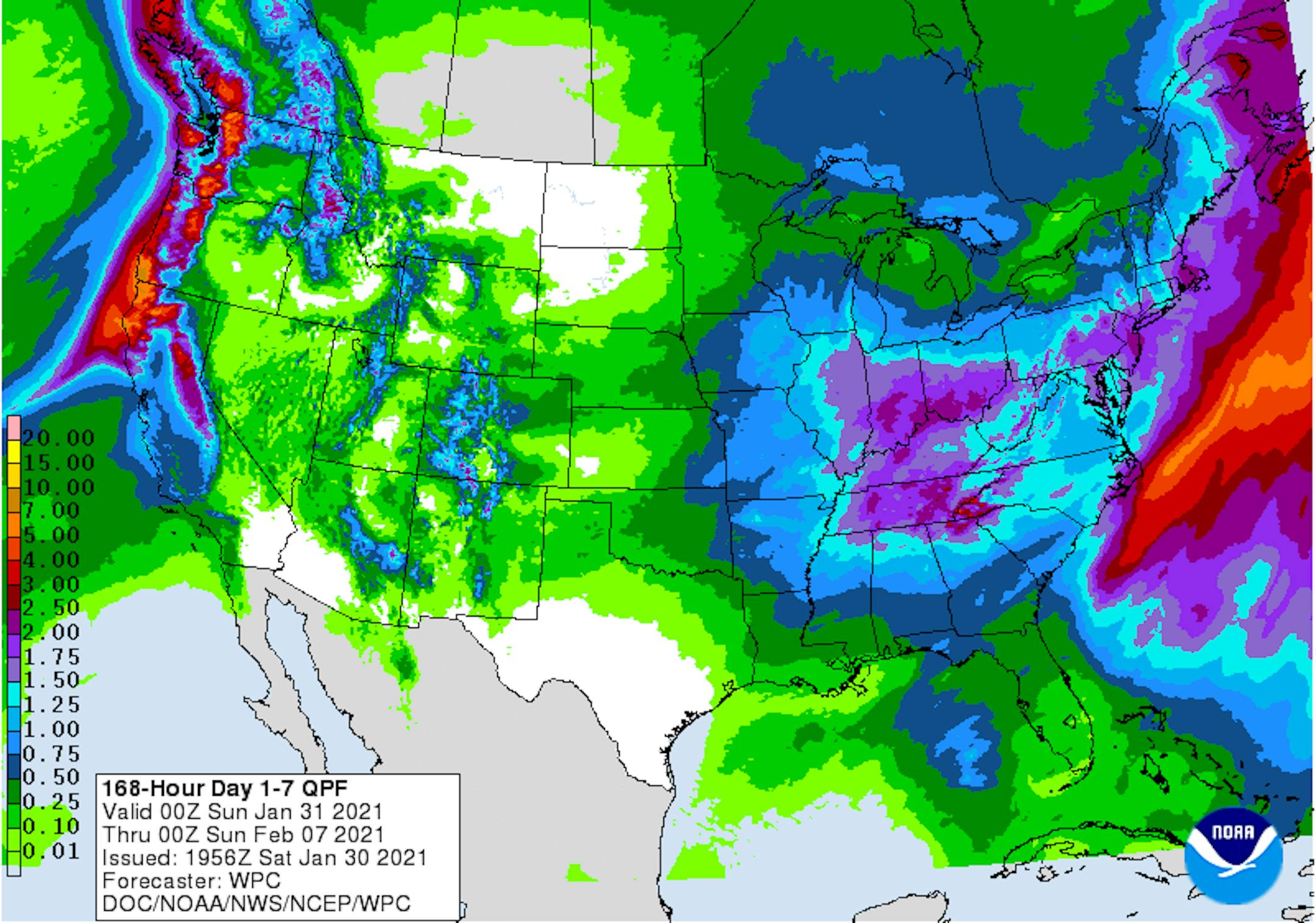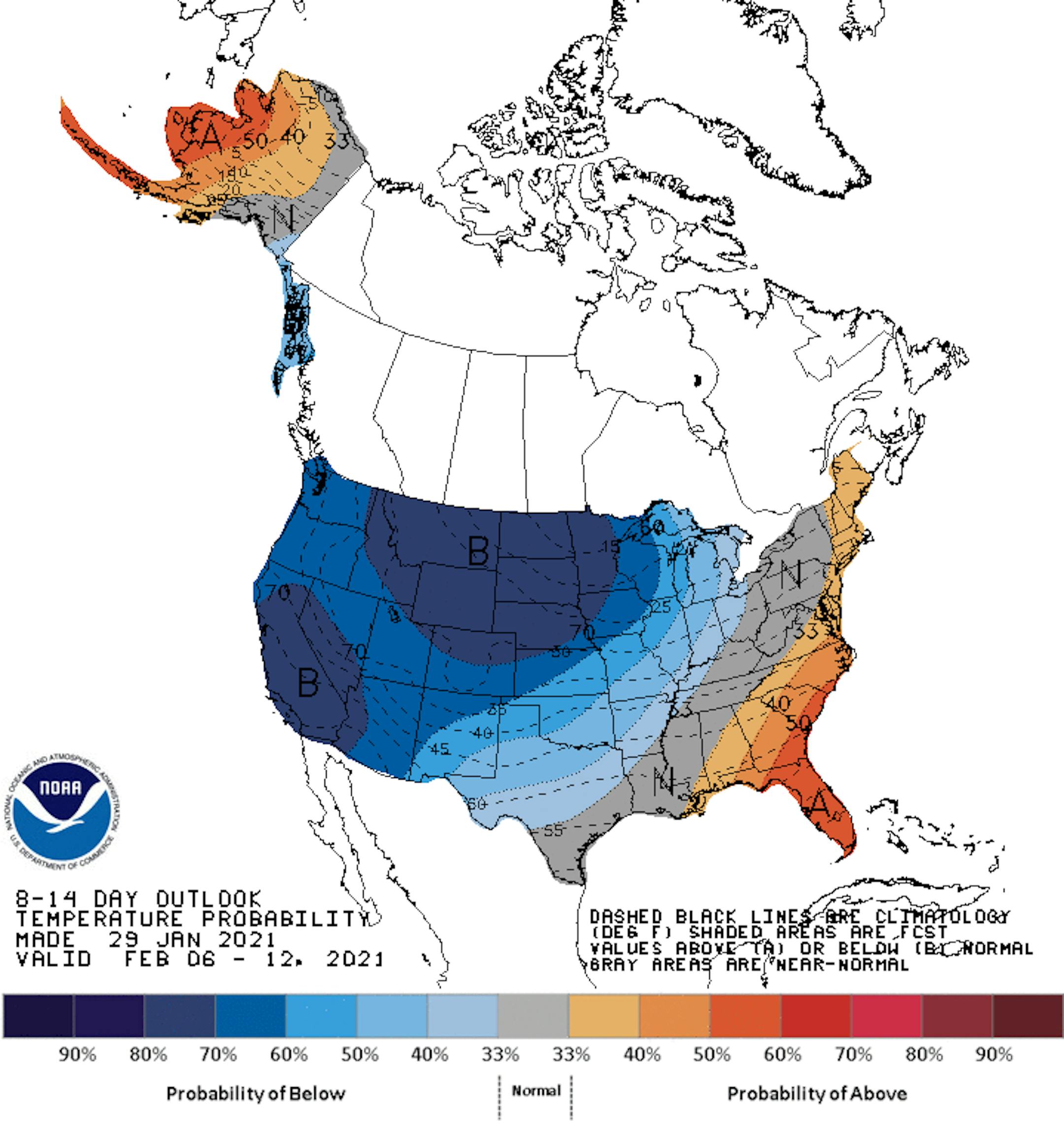 The extended temperature outlook into the early part of February. It appears that readings will be quite mild through much of the week ahead, however, a fairly significant swipe of colder air appears to be imminent by the first weekend of February. It could be our first real Arctic air mass of the season with temps going sub-zero. Stay tuned...