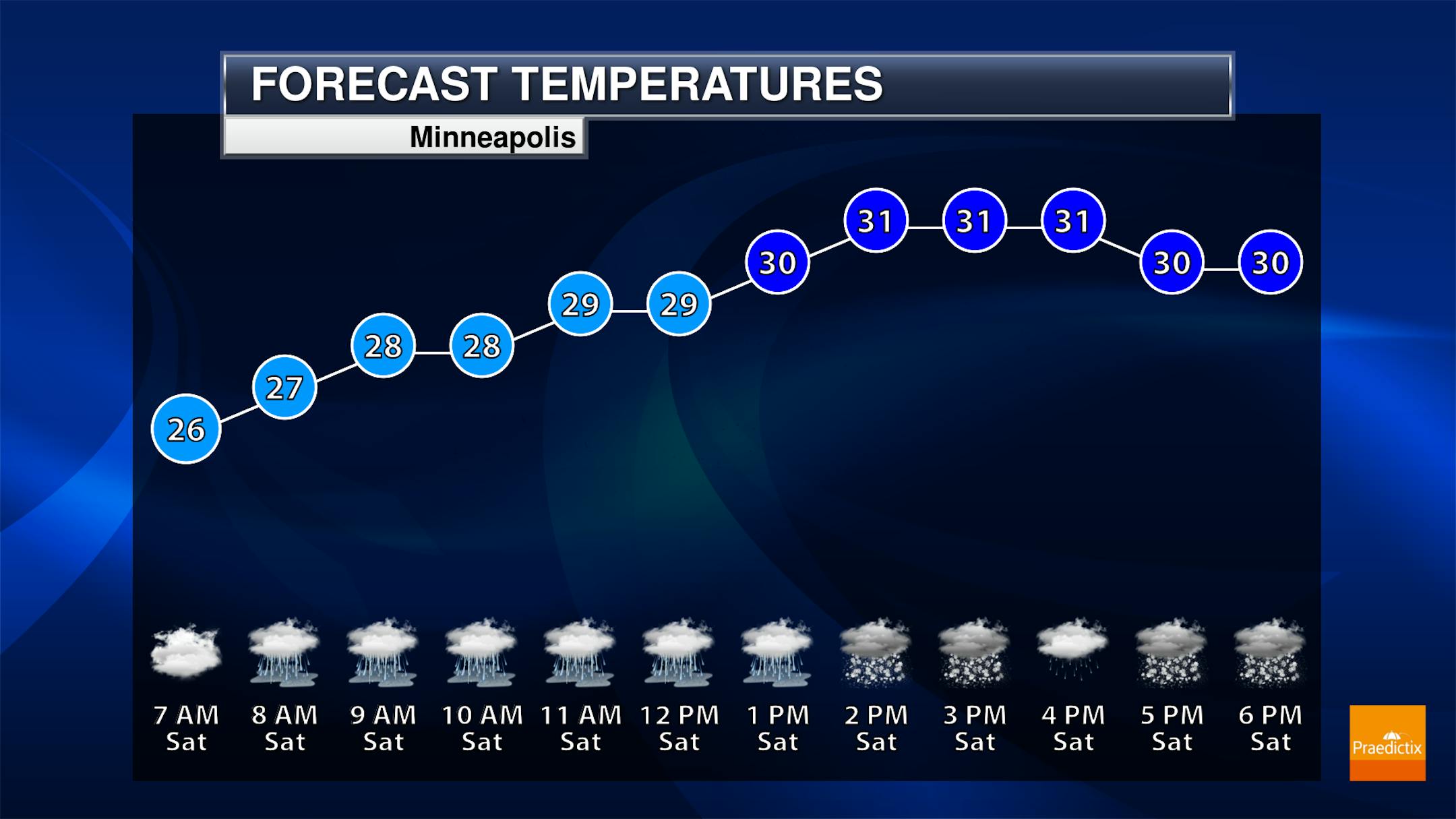 Here's the extended outlook over the next 5 to 7 days for Minneapolis. Note that temperatures will be quite mild over the next several days with temps warming into the 30s through midweek. There's a chance of snow later next week with a fairly potent cold front sweeping through late week. Temps next weekend could be very cold with sub-zero readings possible.