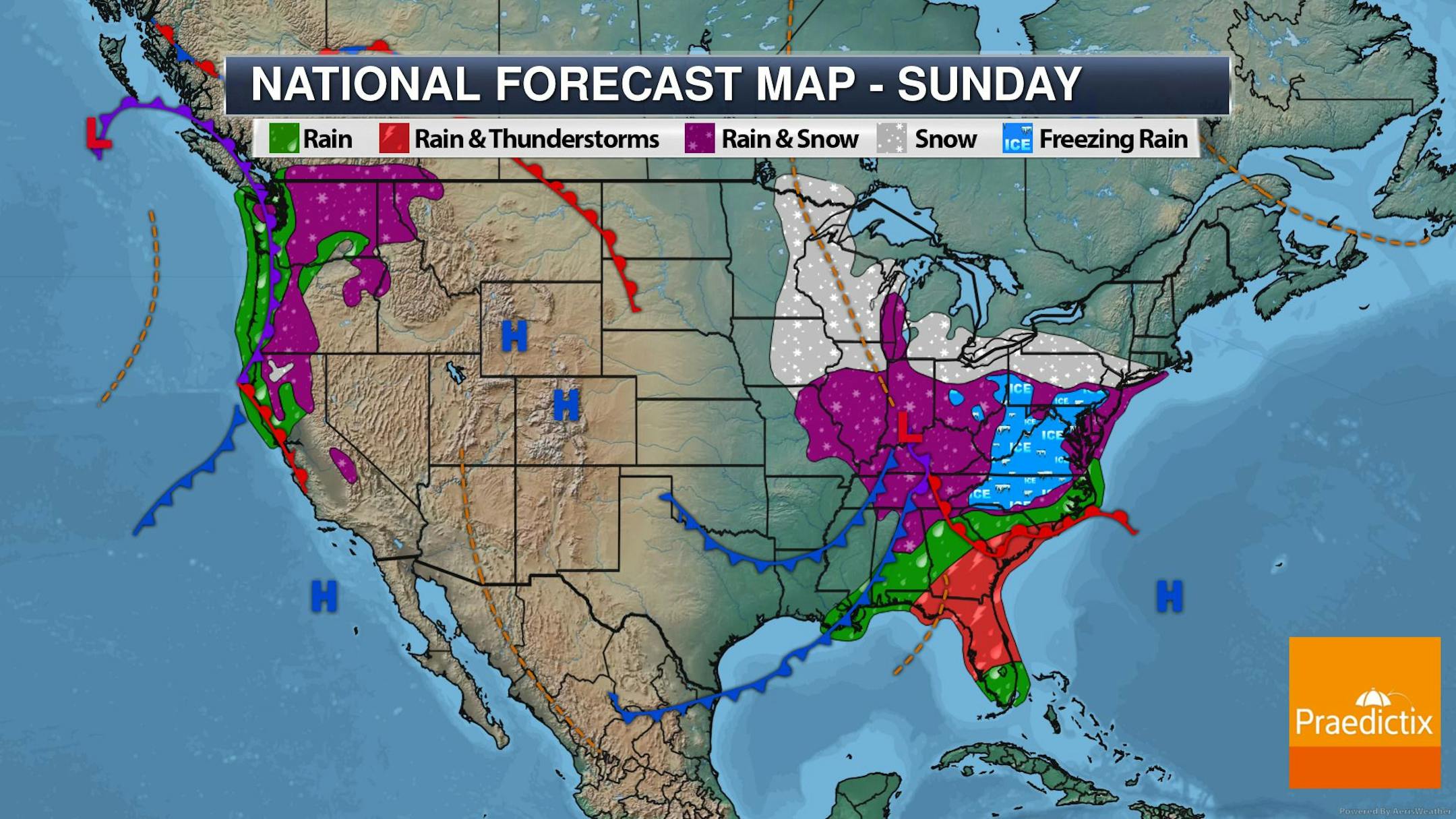 Here's the weather outlook from AM Sunday to AM Tuesday, which shows another large storm sailing south of the region. Light wintry precipitation, including minor snow accumulations will be possible closer to home, while heavier, plowable amounts will be found farther south and will end through the day Sunday.