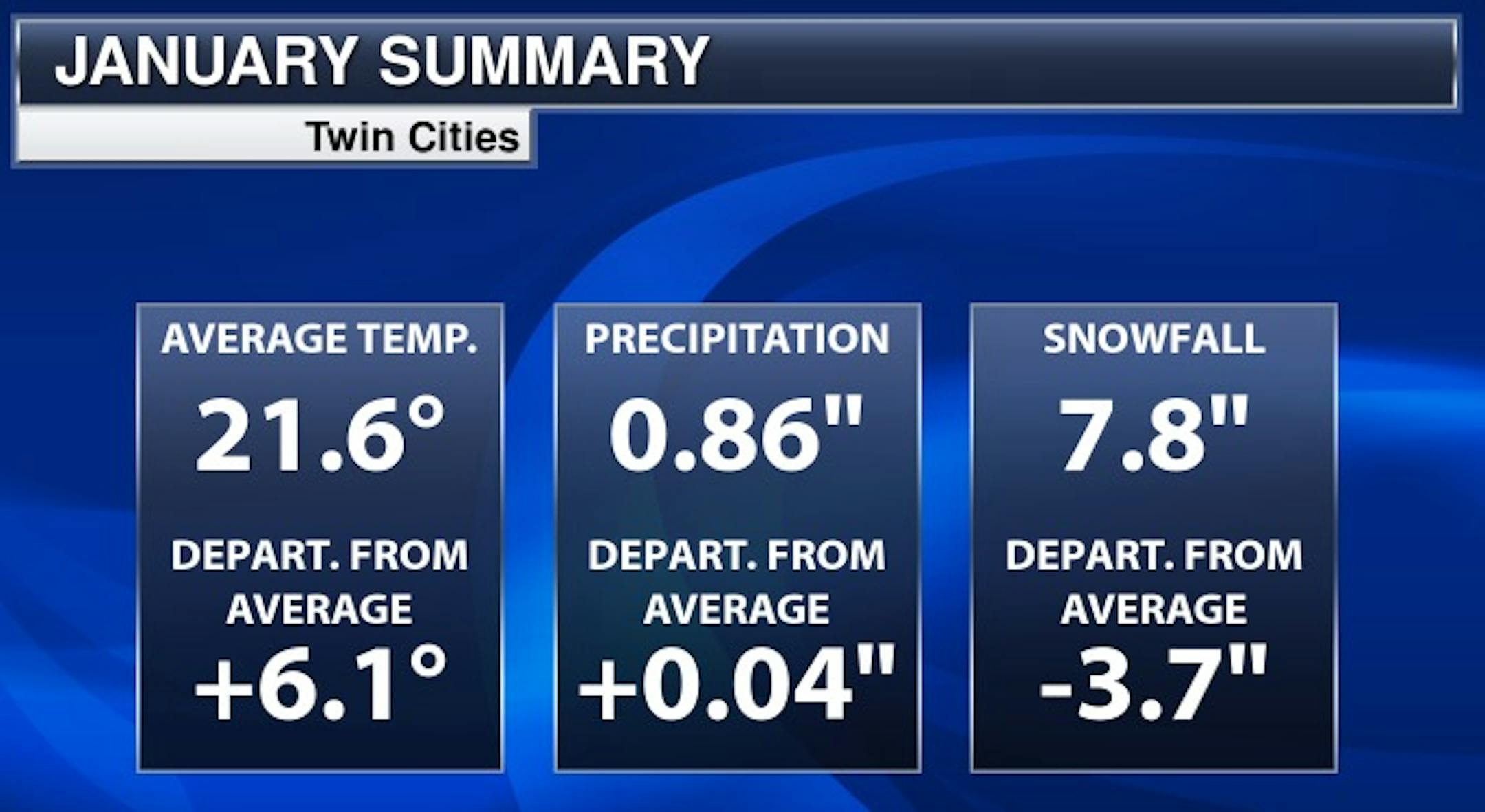 Here's a look at the January numbers and it certainly has been a mild month. We're nearly +6F above average, which is the 15th warmest January on record. Also note that MSP is currently sitting at its 14th warmest Meteorological Winter on record (December 1st - January 29th). We've also had 7.8" of snow, which is nearly -4" below average for the month.