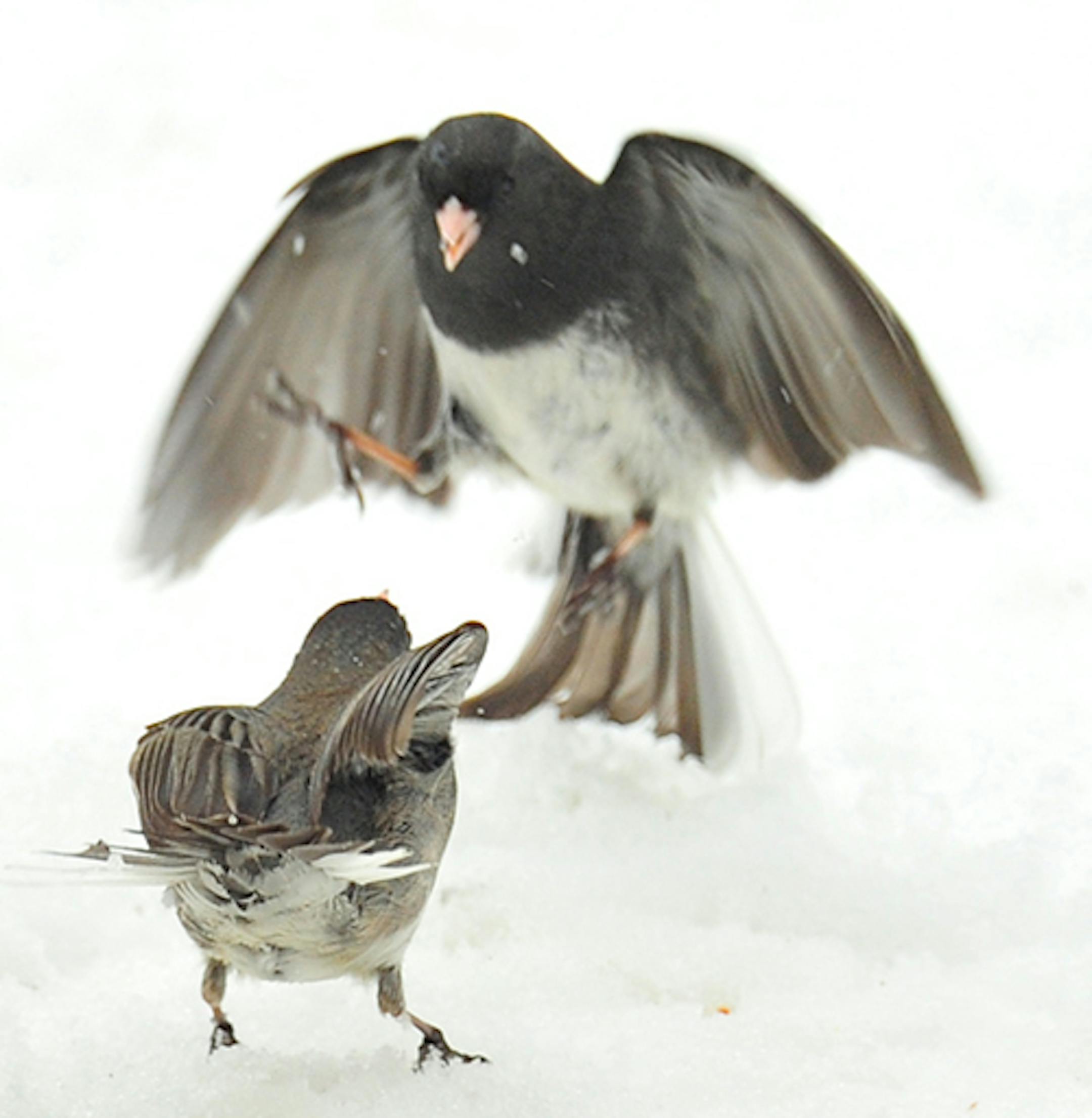 Photo: Dark-eyed Juncos in dispute about food, ages unknown.