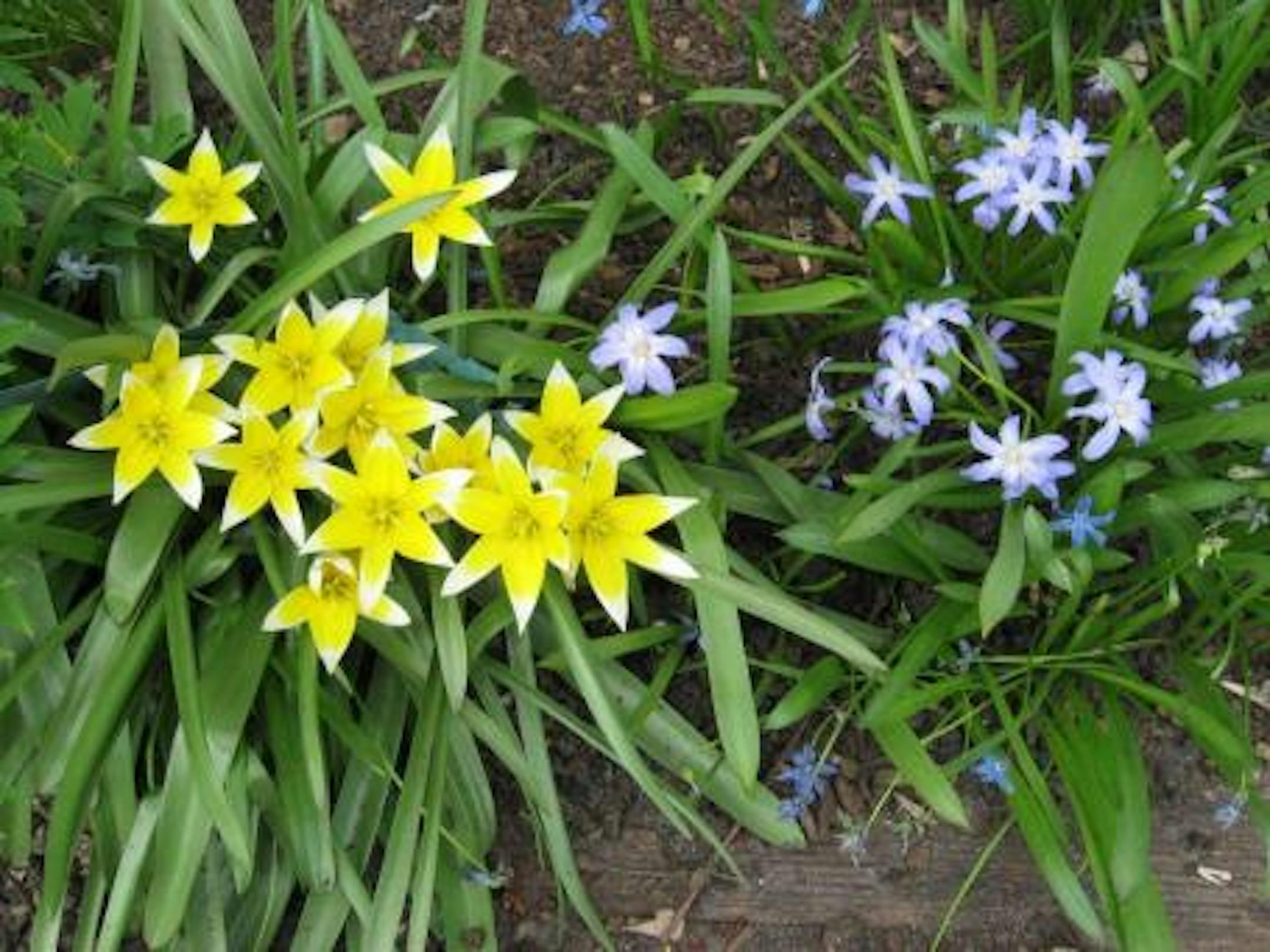 Right on their heels is Tulip tarda, a mini-tulip that reaches about six inches high. The star-shaped flowers open wide during the day, showing off bright yellow flowers edged in white. They, too, seem eager to take over a garden and I've been happy to let them do that.
