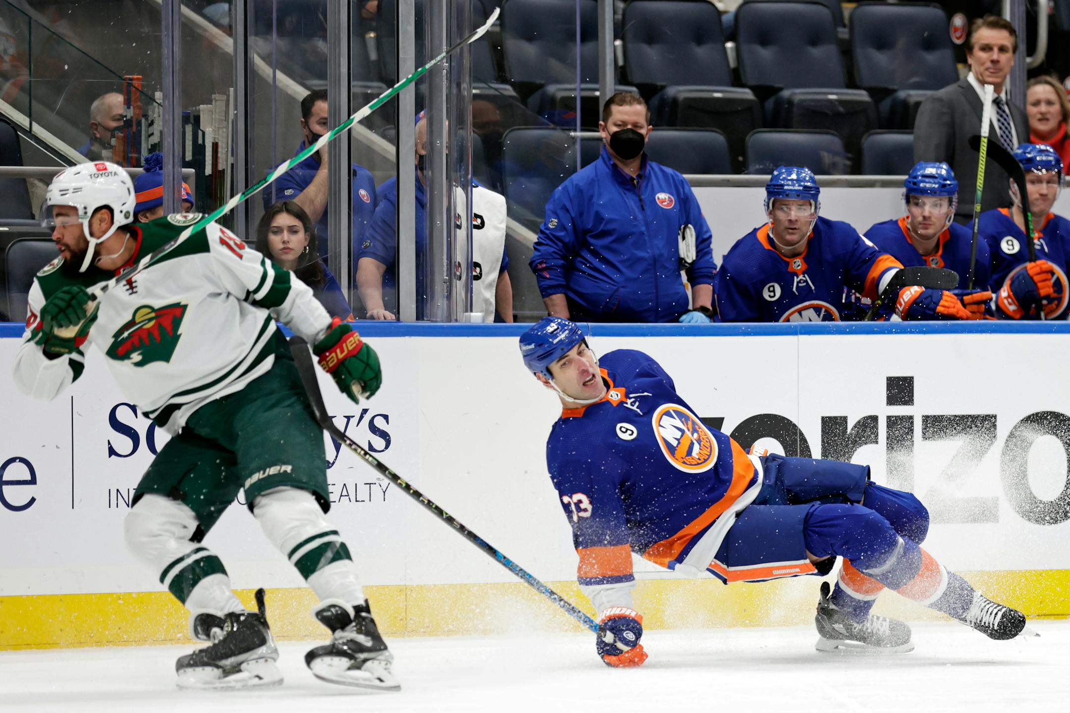 Minnesota Wild left wing Jordan Greenway (18) checks New York Islanders defenseman Zdeno Chara in the first period of an NHL hockey game Sunday, Jan. 30, 2022, in Elmont, N.Y. (AP Photo/Adam Hunger) (Adam Hunger, AP/The Minnesota Star Tribune)