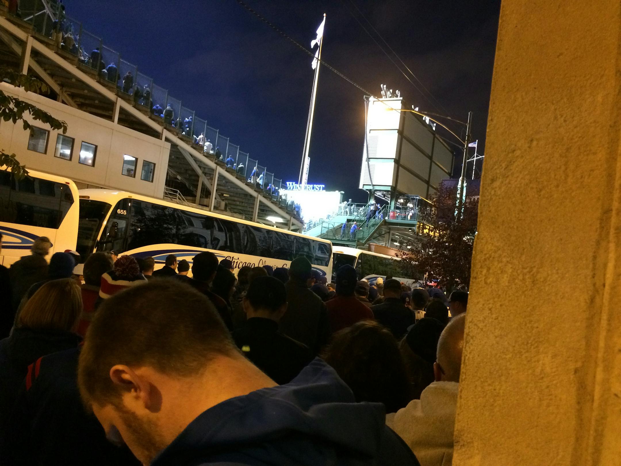 7:54 p.m. -- Waited about 15 minutes until a spot opened up but found warmth and refreshment at a establishment outside stadium.