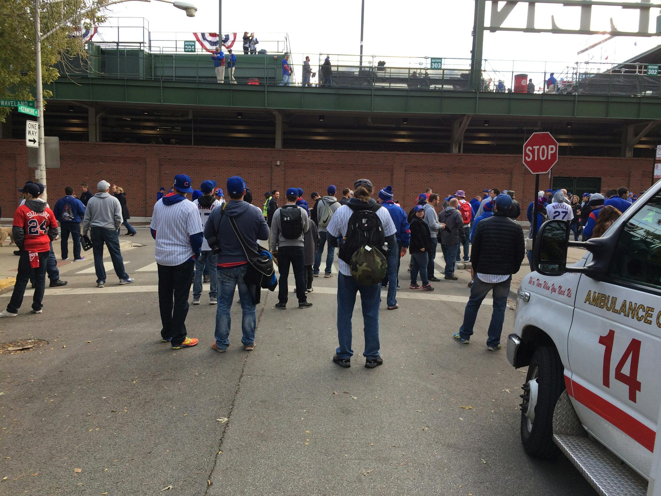 Fans singing along with seventh-inning stretch while standing in middle of the intersection.