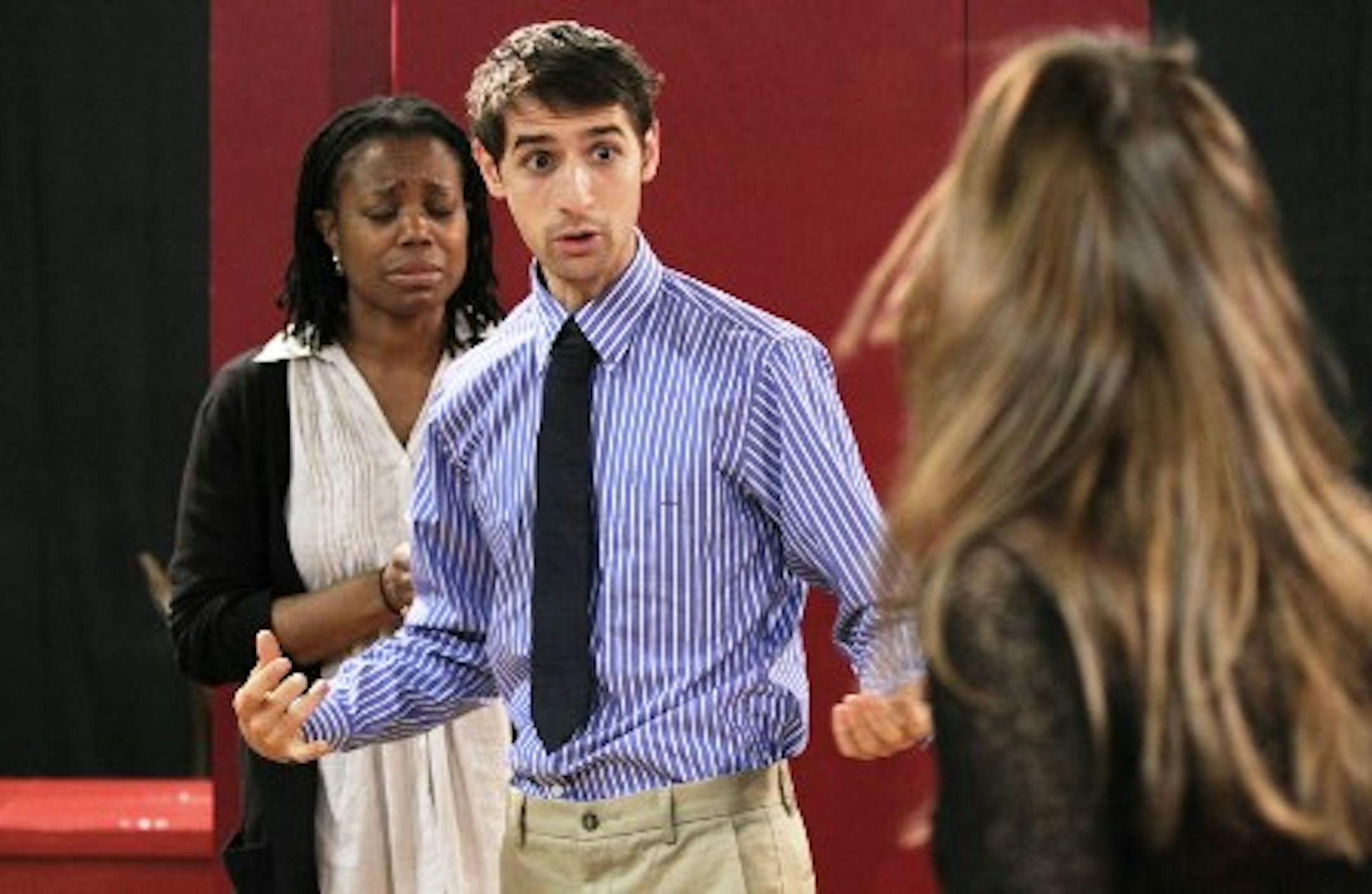 Actors, l. to r., Regina Marie Williams, Skyler Nowinski and Laura Robinson, back to camera, in "On the Spectrum." Star Tribune photo by Bruce Bisping.