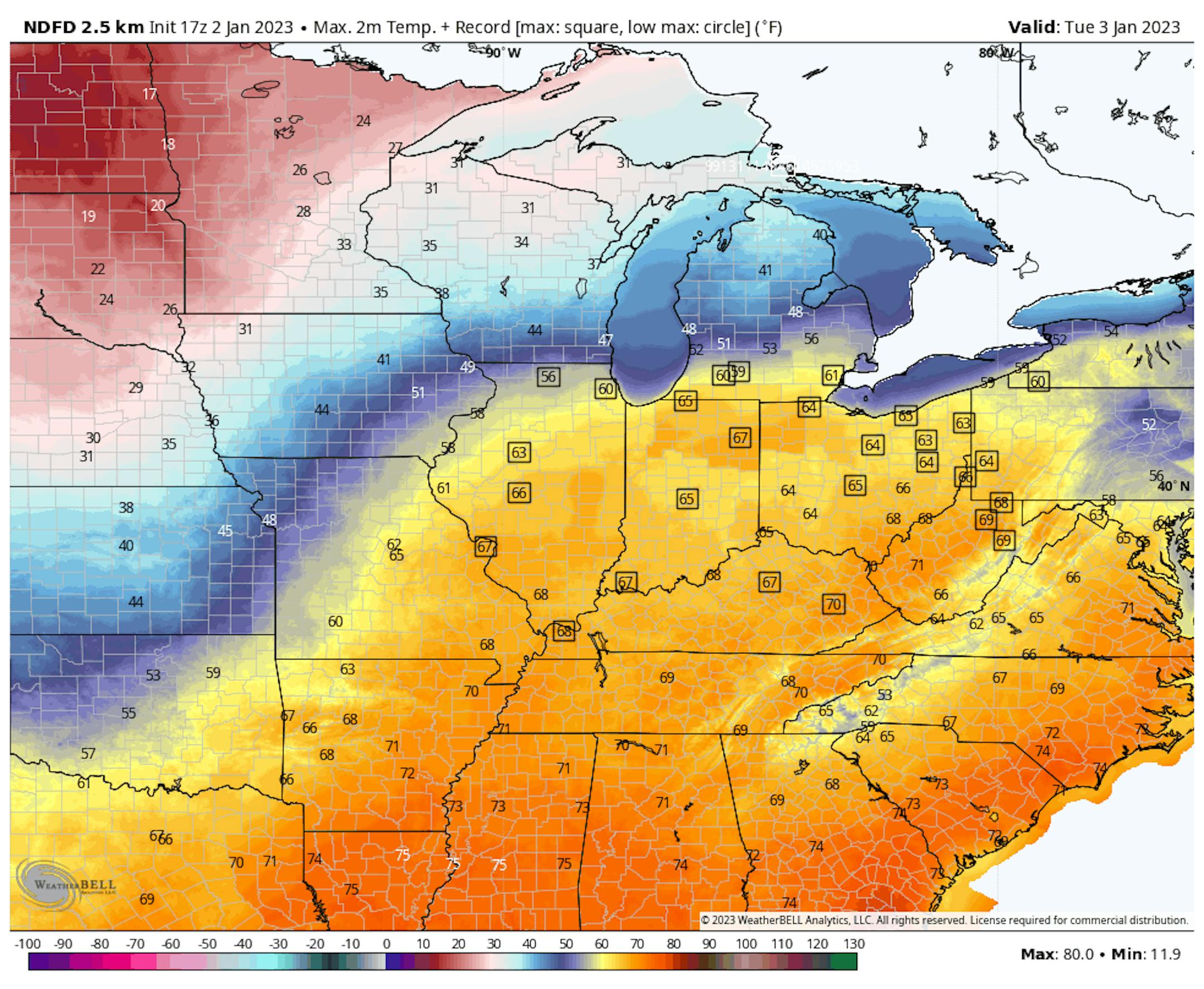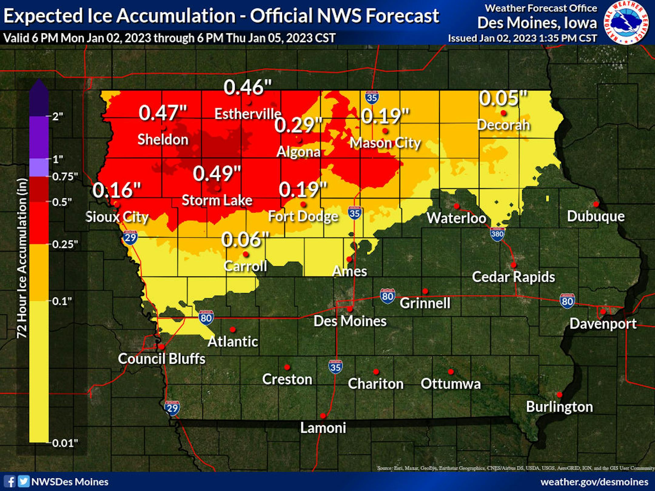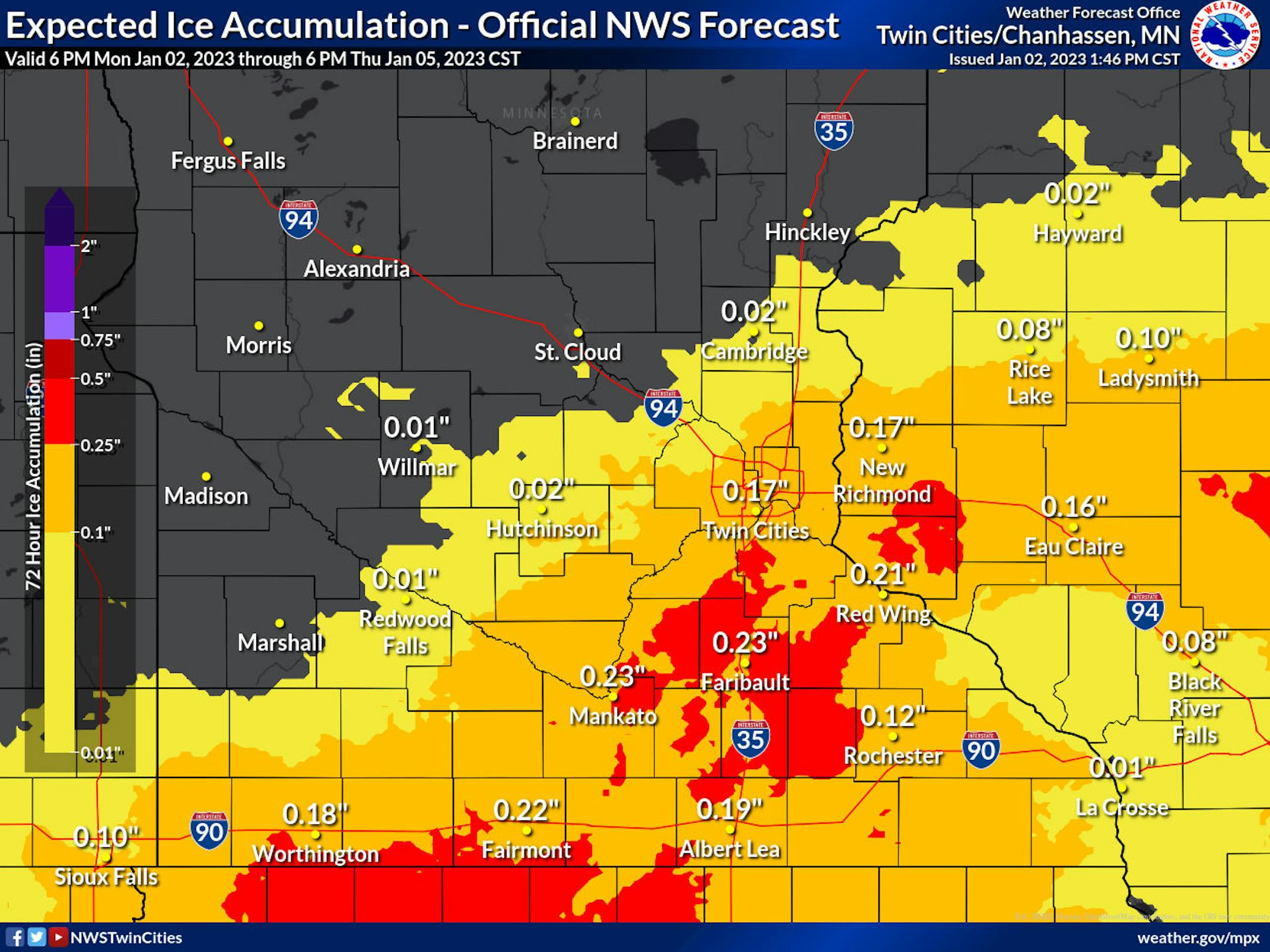- Ice Storm Warning in Southern Minnesota, where more than 0.25" will be possible.