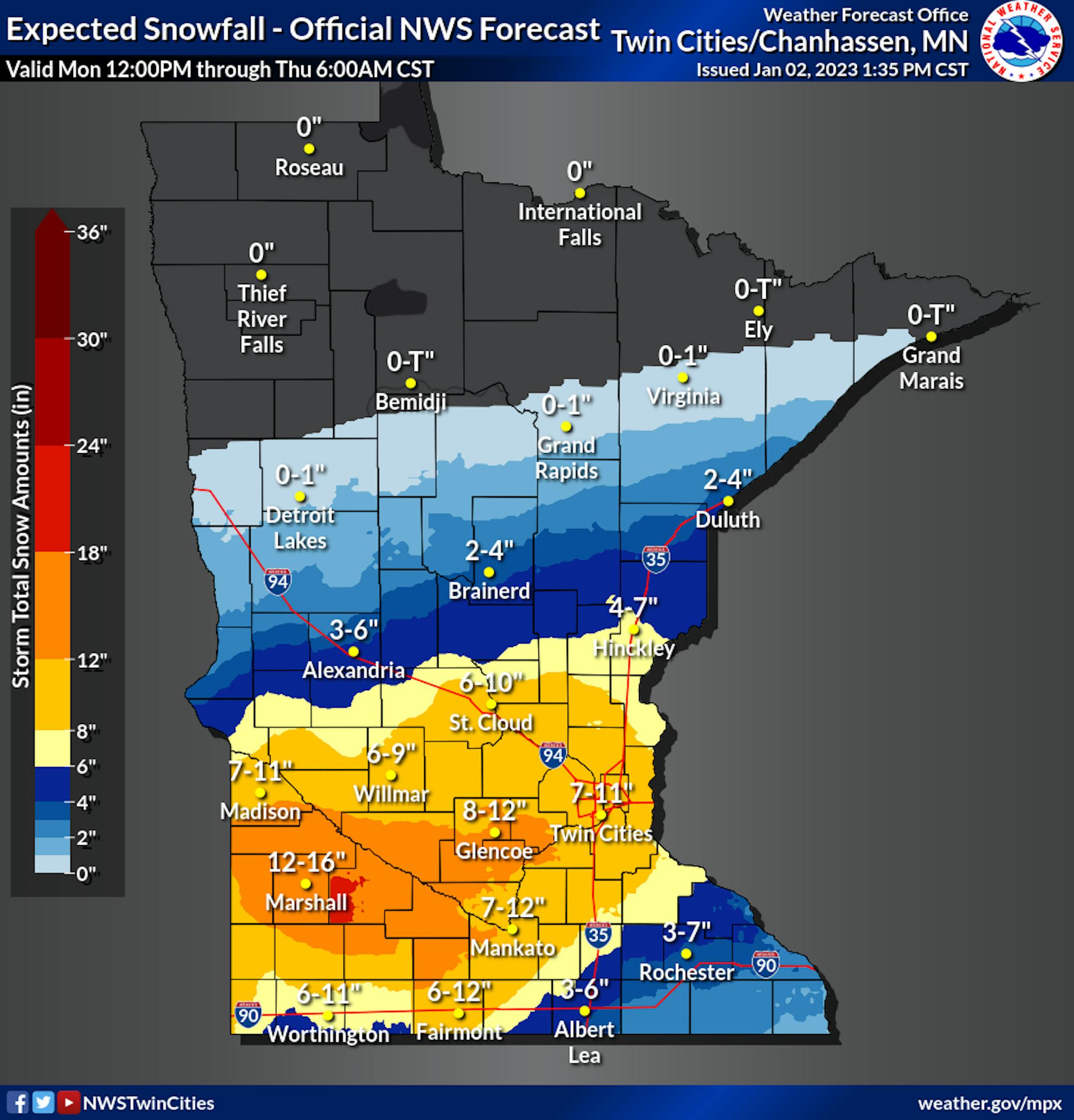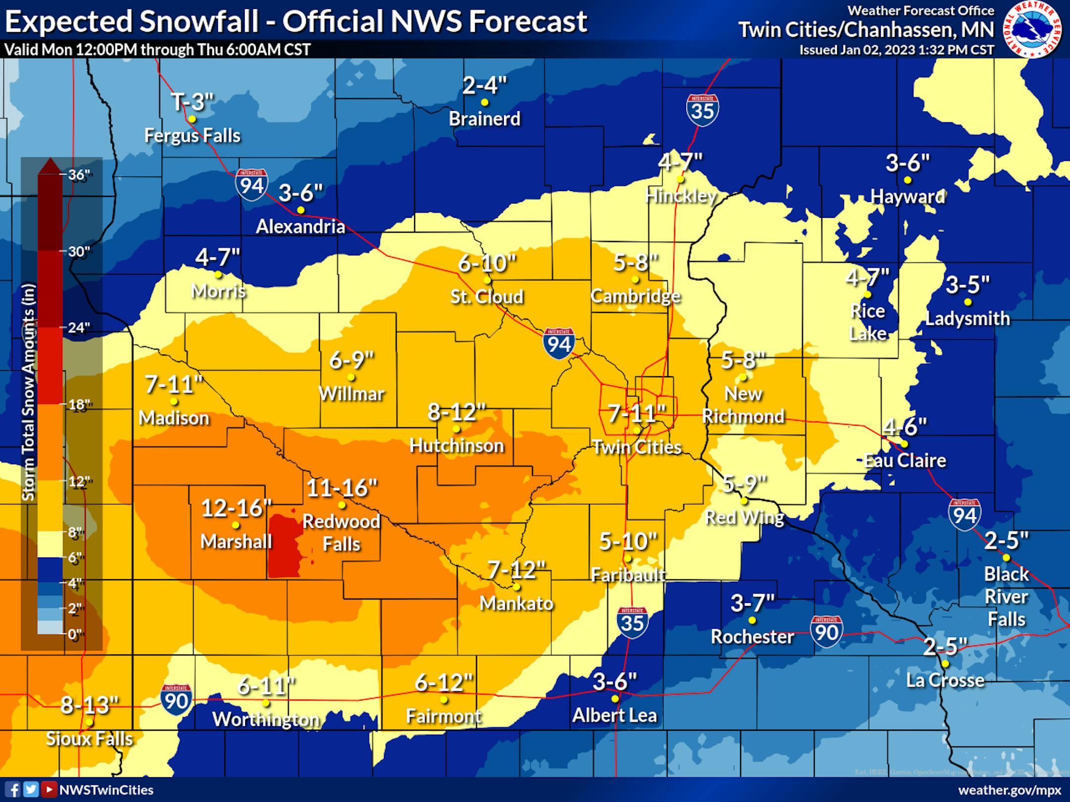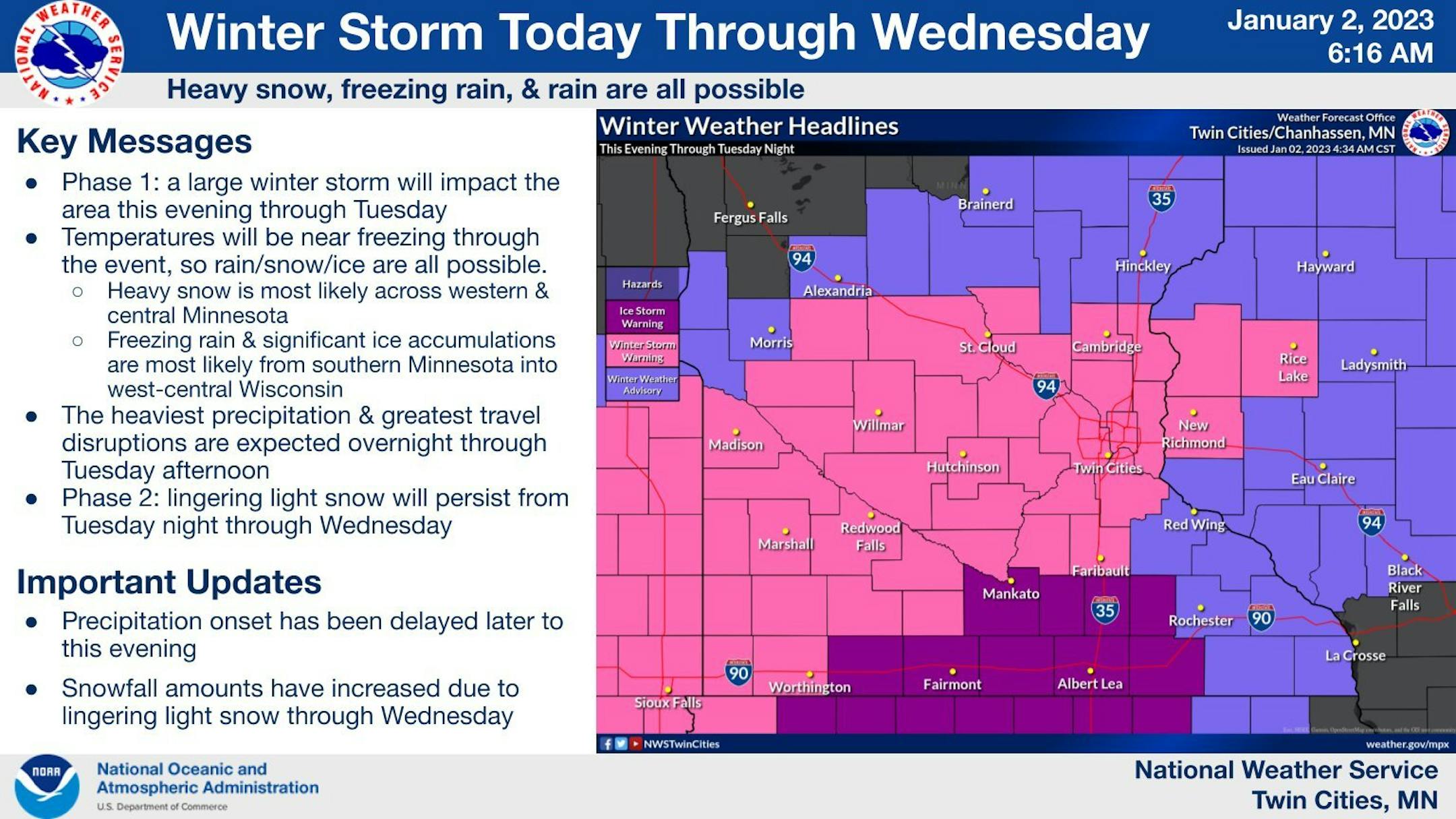 A complex and potent winter storm will cause travel impacts starting this evening, lasting through Wednesday. The worst conditions will be Tuesday morning and early afternoon. On Monday evening, a wintry mix of rain, sleet, and ice will develop across southern Minnesota. Some locations may see over a quarter of an inch of ice, and an Ice Storm Warning is in effect. On Monday night heavy snow will move into southwest Minnesota, and spread across central Minnesota and western Wisconsin Tuesday morning into early Tuesday afternoon. Snowfall rates of 1 to 2 inches per hour are likely for a few hours, which will cause significant travel impacts as visibility drops to a quarter mile at times due to the heavy snow. A Winter Storm Warning is in effect for this heavy snow, with generally 6 to 11 inches total accumulation expected, with isolated amounts over a foot possible, particularly in southwest Minnesota. Elsewhere, a Winter Weather Advisory is in effect for areas that will see a wintry mix, and less snow. Please adjust your travel plans for Tuesday if possible.