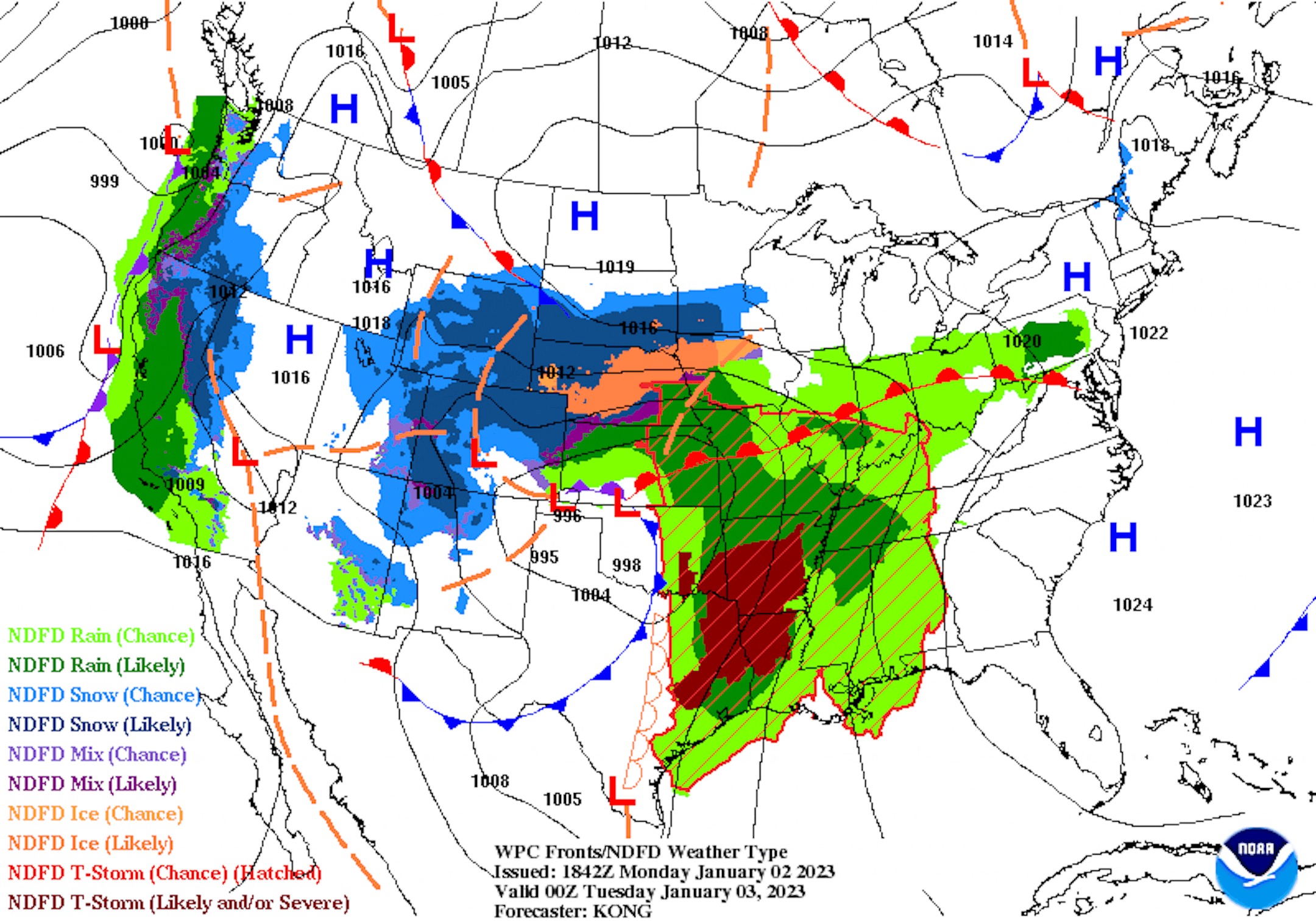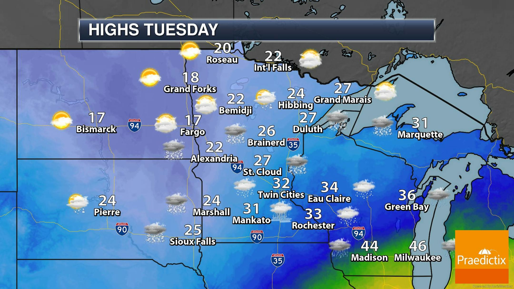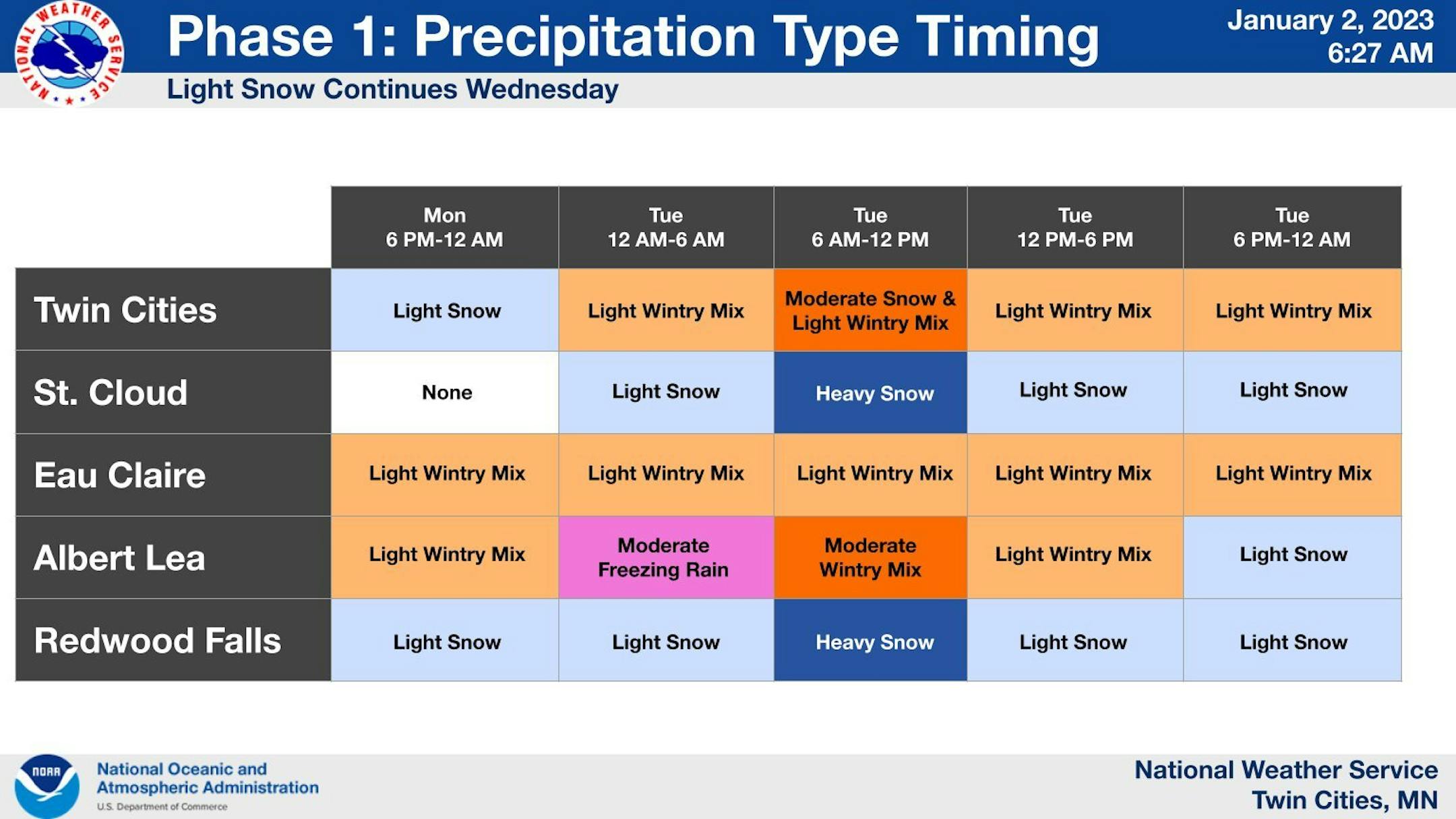 A complex and potent winter storm will cause travel impacts starting this evening, lasting through Wednesday. The worst conditions will be Tuesday morning and early afternoon. On Monday evening, a wintry mix of rain, sleet, and ice will develop across southern Minnesota. Some locations may see over a quarter of an inch of ice, and an Ice Storm Warning is in effect. On Monday night heavy snow will move into southwest Minnesota, and spread across central Minnesota and western Wisconsin Tuesday morning into early Tuesday afternoon. Snowfall rates of 1 to 2 inches per hour are likely for a few hours, which will cause significant travel impacts as visibility drops to a quarter mile at times due to the heavy snow. A Winter Storm Warning is in effect for this heavy snow, with generally 6 to 11 inches total accumulation expected, with isolated amounts over a foot possible, particularly in southwest Minnesota. Elsewhere, a Winter Weather Advisory is in effect for areas that will see a wintry mix, and less snow. Please adjust your travel plans for Tuesday if possible.