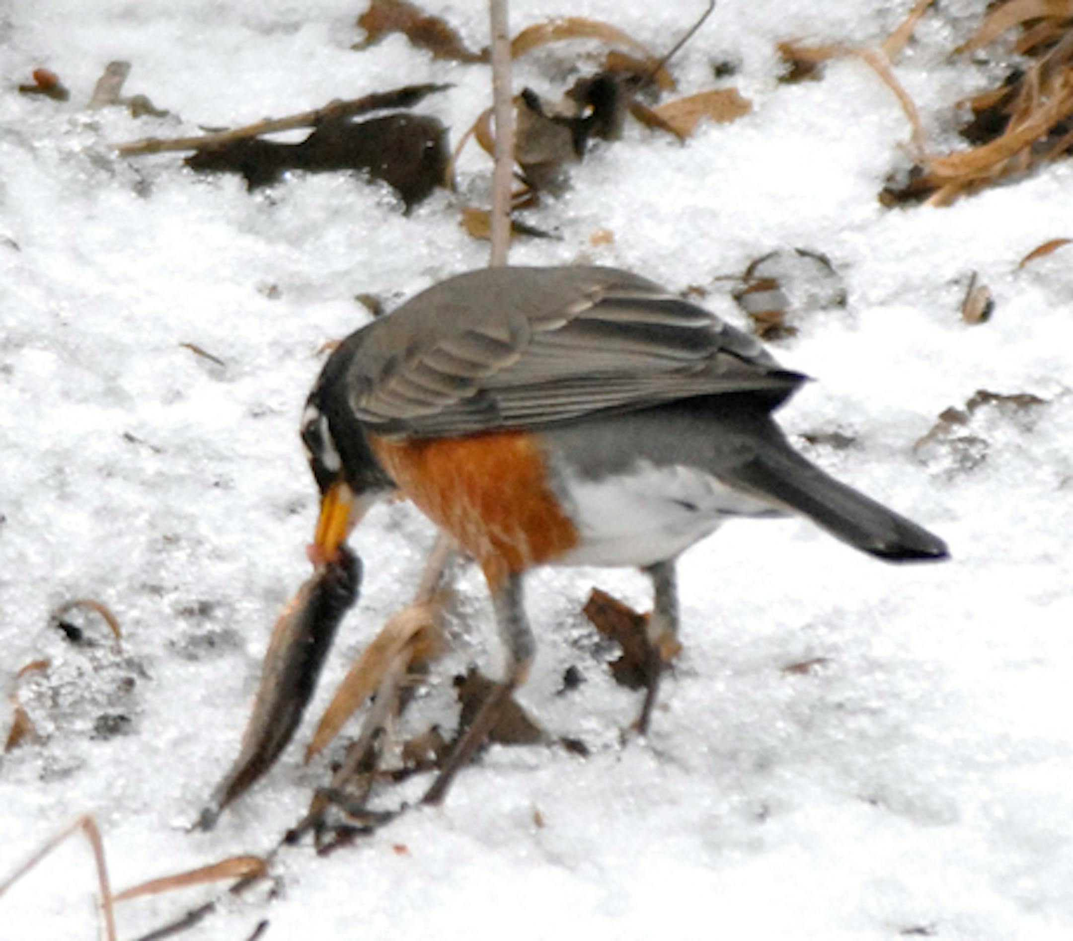 Several readers have emailed to ask about the robins they're seeing in their yards and neighborhoods. They wonder why the birds haven't gone south. One reader suggested that perhaps the males were "marrying local girls." No, its not romance. It's modification of climate. We have had and are having winters sufficiently mild, overall, to allow these birds to stick around. We have a resident flock of about 40 robins in the Wayzata area; some were in our yard yesterday. Also yesterday, two birders who belong to an email exchange network focusing on local birds reported flocks of "hundreds." Robins never migrated farther south than necessary to find mild weather. We might be seeing some surging, birds moving south and north with weather changes. And warmer conditions south of us (Iowa, Missouri) could prompt early spring migration, fattening our over-wintering flocks. The birds, by the way, subsist on berries and fruit still on trees, crab apples for instance. Protein? They find what they can. I've watched Wayzata robins dig in the snow behind a local bait shop for the dead minnows skimmed off the bait tanks. Here's a photo of one of those birds.
