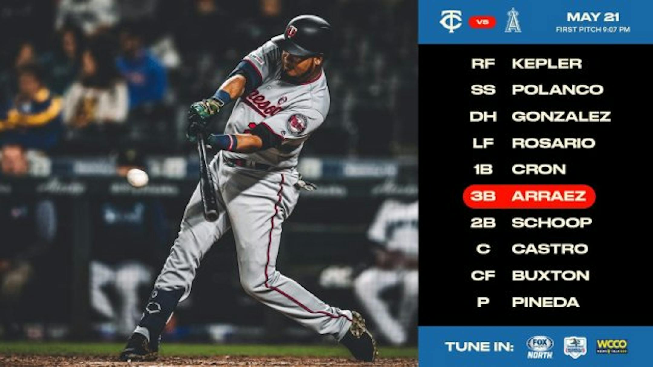 Luis Arraez gets his third consecutive start, this time at third base. Miguel Sano, who had the game winning home run last night, gets the night off with Marwin Gonzalez stepping in as DH.