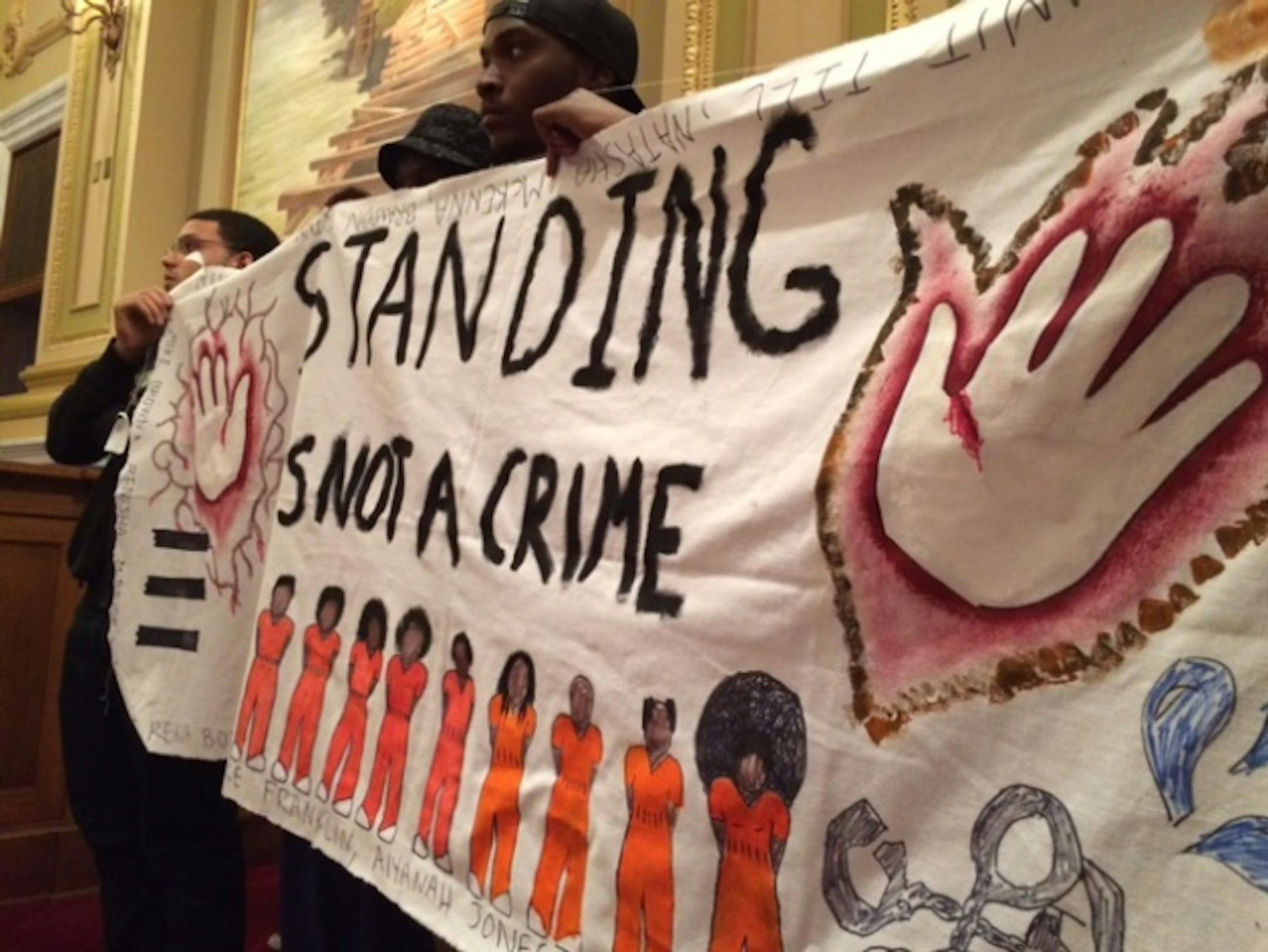 At Wednesday's public hearing, 27 of the 28 people who spoke said they were in favor of repealing the laws. Some said they were vague, unconstitutional and discriminatory. Some held up signs that read: "Standing is not a crime" and "My son is not a crime."