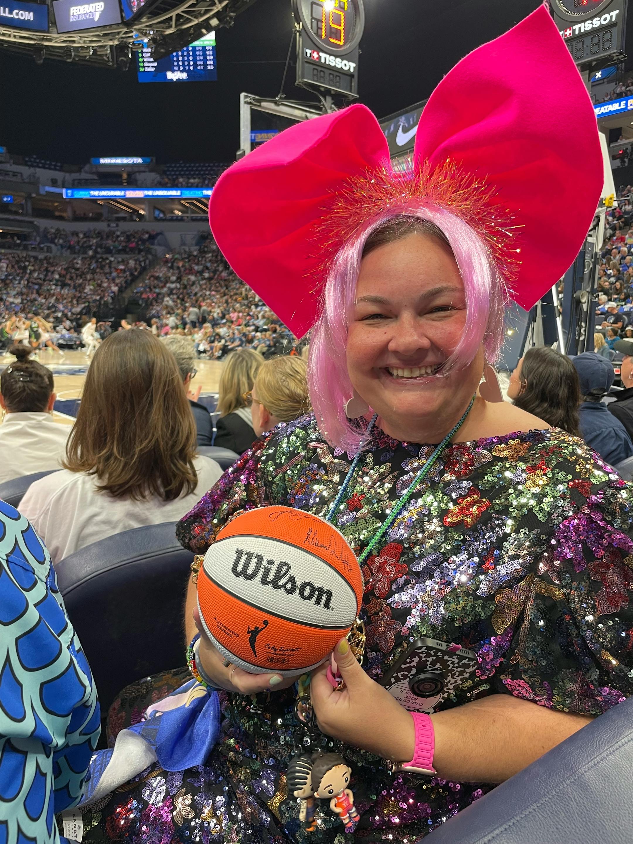 “I wasn’t very athletic as a kid. I’m an artist, and so sports weren’t really my thing, but everyone was just so welcoming ... so full of joy,” Broeren said at Sunday’s Lynx game, donning a giant pink bow, sequin dress and handmade purse made out of a basketball. “The world’s hard, and to get to come here for a couple hours and just celebrate with the community around us is so special.”