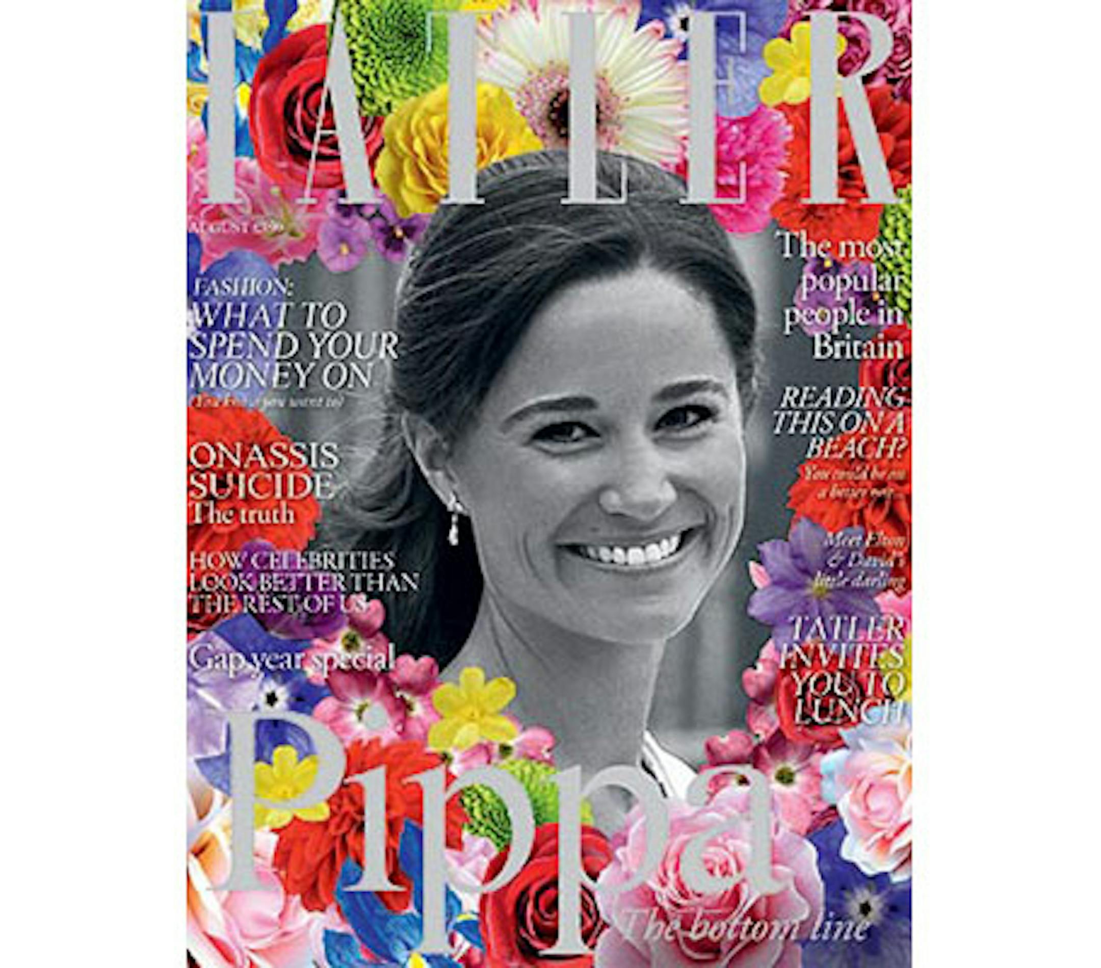 Pippa, England's spare Middleton, is on the cover of Tatler, which seems to be going out of its way to be unreadable. Maybe that's the cover for dogs; they wouldn't be confused by the color.