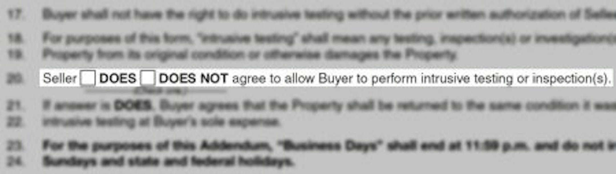 When someone buys a home in Minnesota, they typically include an addendum to their purchase agreement, called the Inspection Contingency. This is typically a one-page form that says the buyer wants a home inspection. It gives the buyer the option to cancel the purchase of a home without any penalties if they're not happy with the inspection results. I'm simplifying things a bit here, but that's the gist of it. The form is very basic but does have a spot for the seller to check a box to say whether or not they'll agree to allow the buyer to perform intrusive testing or inspections.