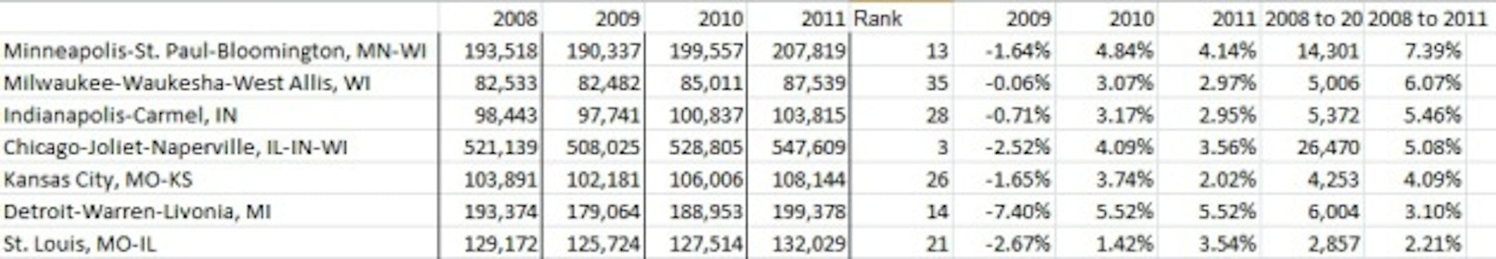 The rest of Minnesota's cities all posted slightly above-average growth, with Rochester the lone exception. GDP for the Rochester area actually fell in 2011 by almost 1 percent. Here's a quick screen grab of the data I'm working with: