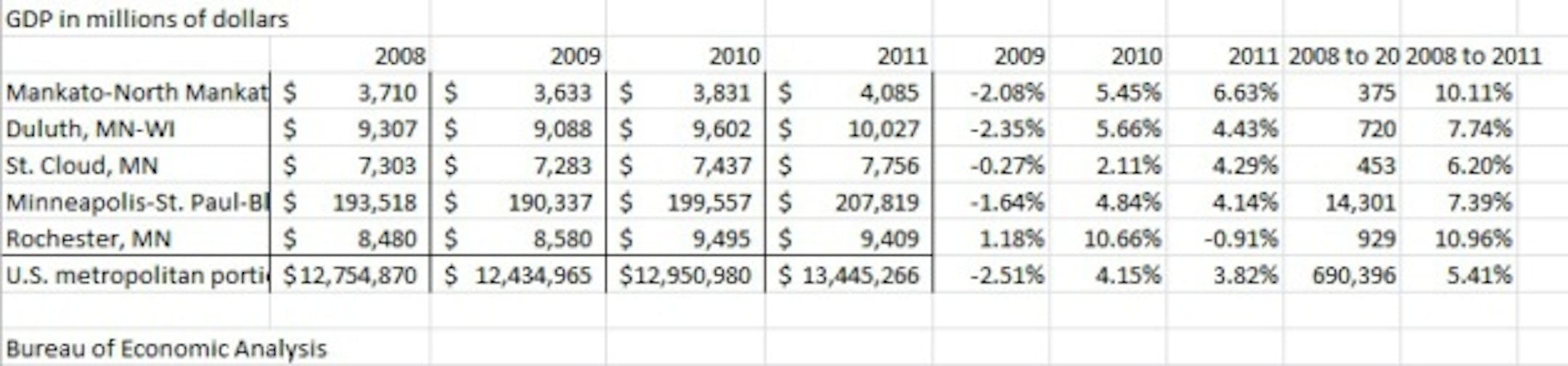 New data from the Bureau of Economic Analysis shows that the Mankato-area's GDP grew by 6.6 percent in 2011, nearly twice the national average.