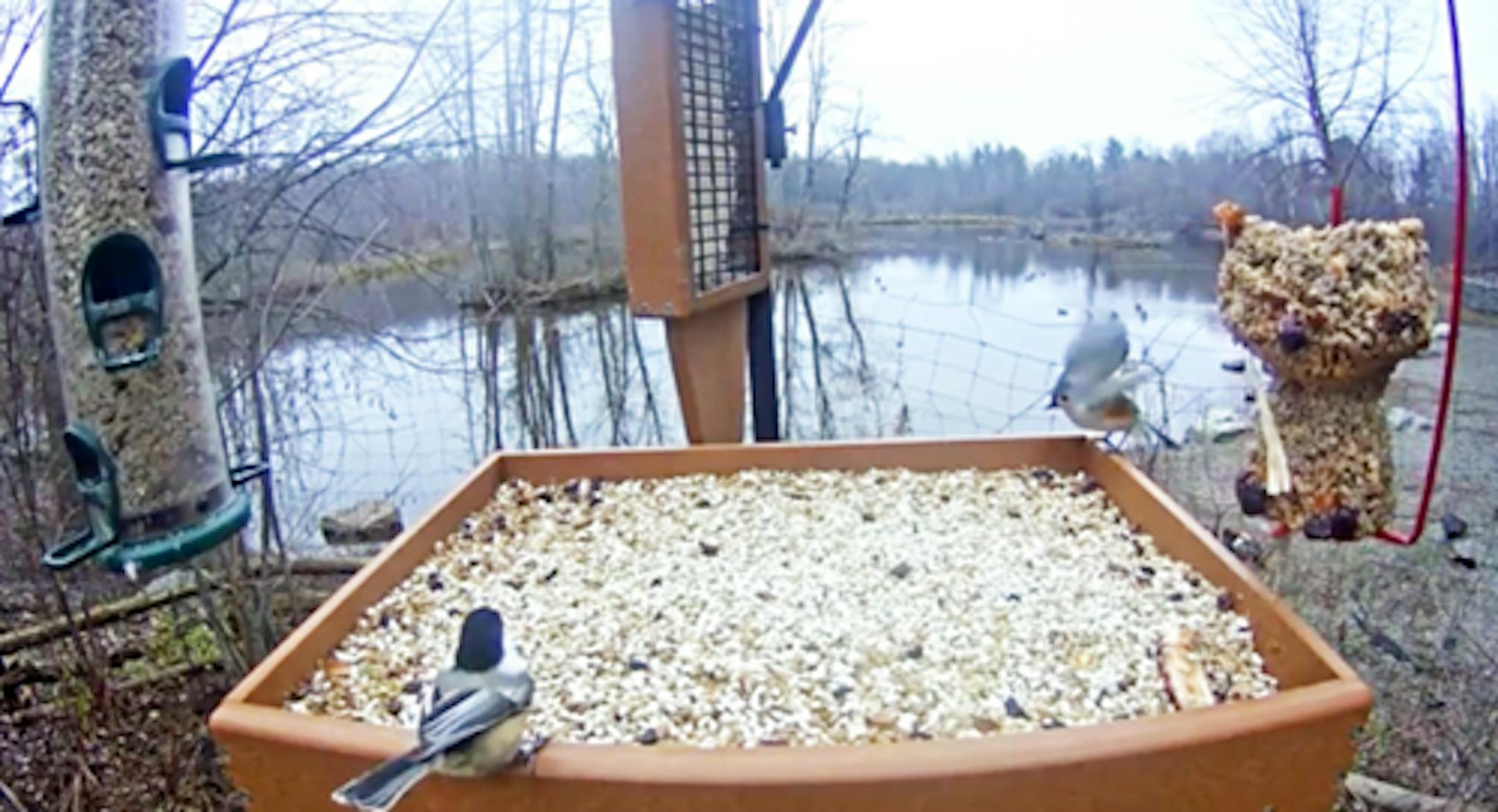 Here are three web-site addresses. My favorite is the Cornell Lab Feeder Watch. Its camera is aimed at feeders outside one of the lab buildings. Blue Jays, White-breasted Nuthatches, Black-capped Chickadees, Downy and Hairy woodpeckers, Red-winged Blackbirds, and Tufted Titmice are seen minute-to-minute as they feed on safflower seeds, sunflower chips, suet, and a very popular assemblage of seeds held together by (I believe) molasses.