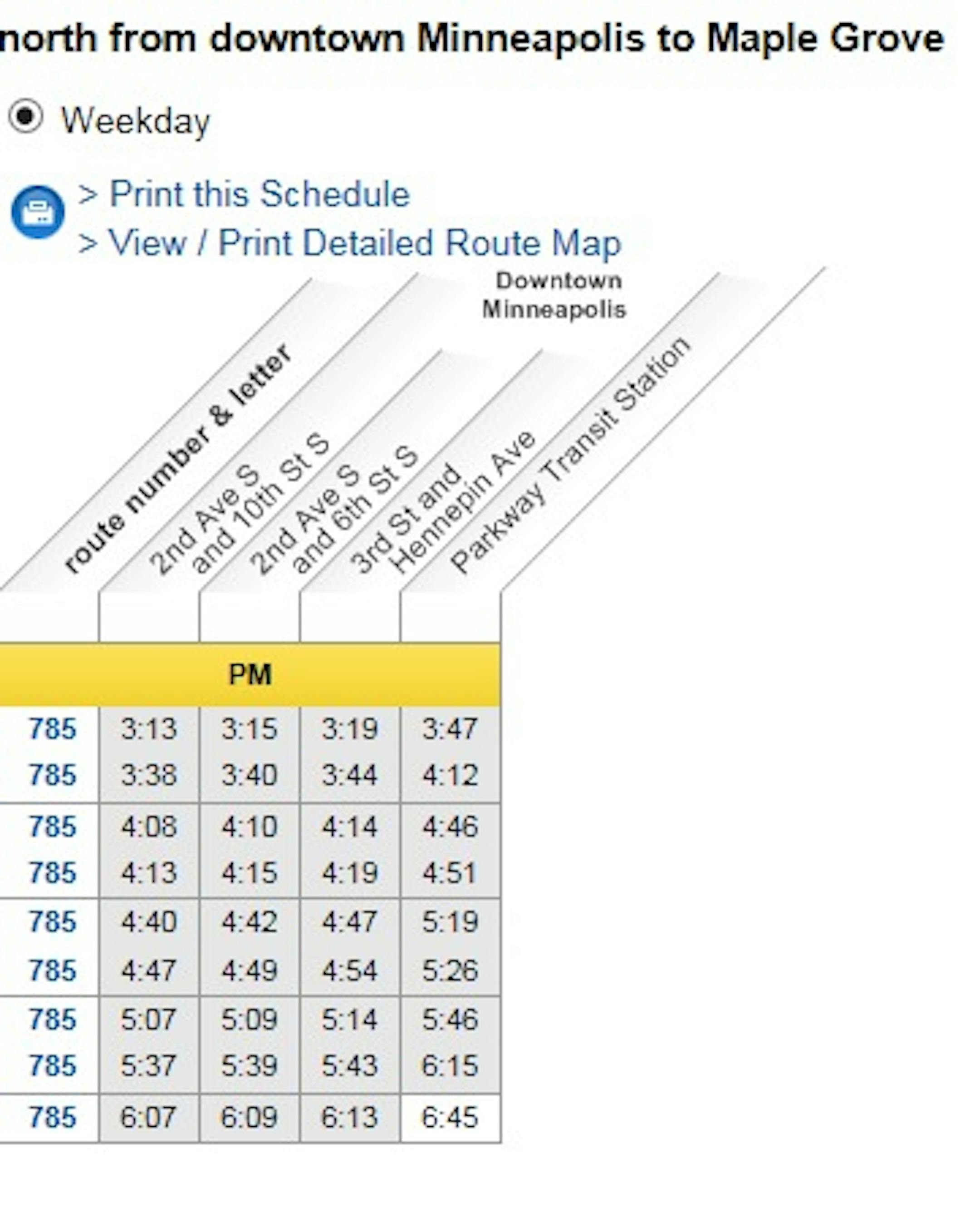 The transit agency operates nine trips from downtown Minneapolis to the newly expanded Parkway Station in Maple Grove. Passengers who take the third and fifth trips at 4:08 p.m. and 4:40 p.m. respectively have had standing room only conditions while northbound trips departing a few minutes later have seating available. To that end, transit spokesman Mike Opatz is encouraging riders on trips three and five to consider waiting five to seven minutes for a bus which has seating available.