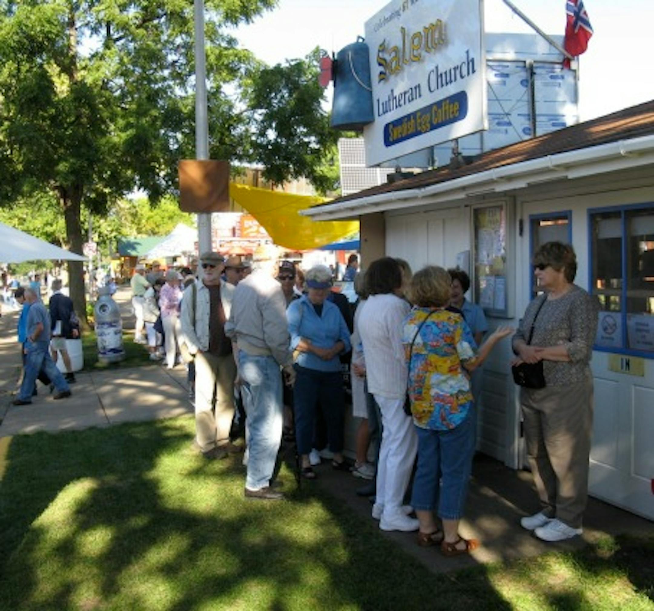 Trying to find all the new foods at the 2010 Minnesota State Fair? Click here for a handy Google guide. And please, be kind; it's my first attempt at Google Maps. Pictured above: A typical long line outside the Salem Lutheran Church diner (home of Swedish egg coffee, and one of the fair's best breakfasts) on the fair's record-setting opening day. In case you're on the lookout for the Hot Apple Dumpling stand, it's right behind the end of the Salem line.