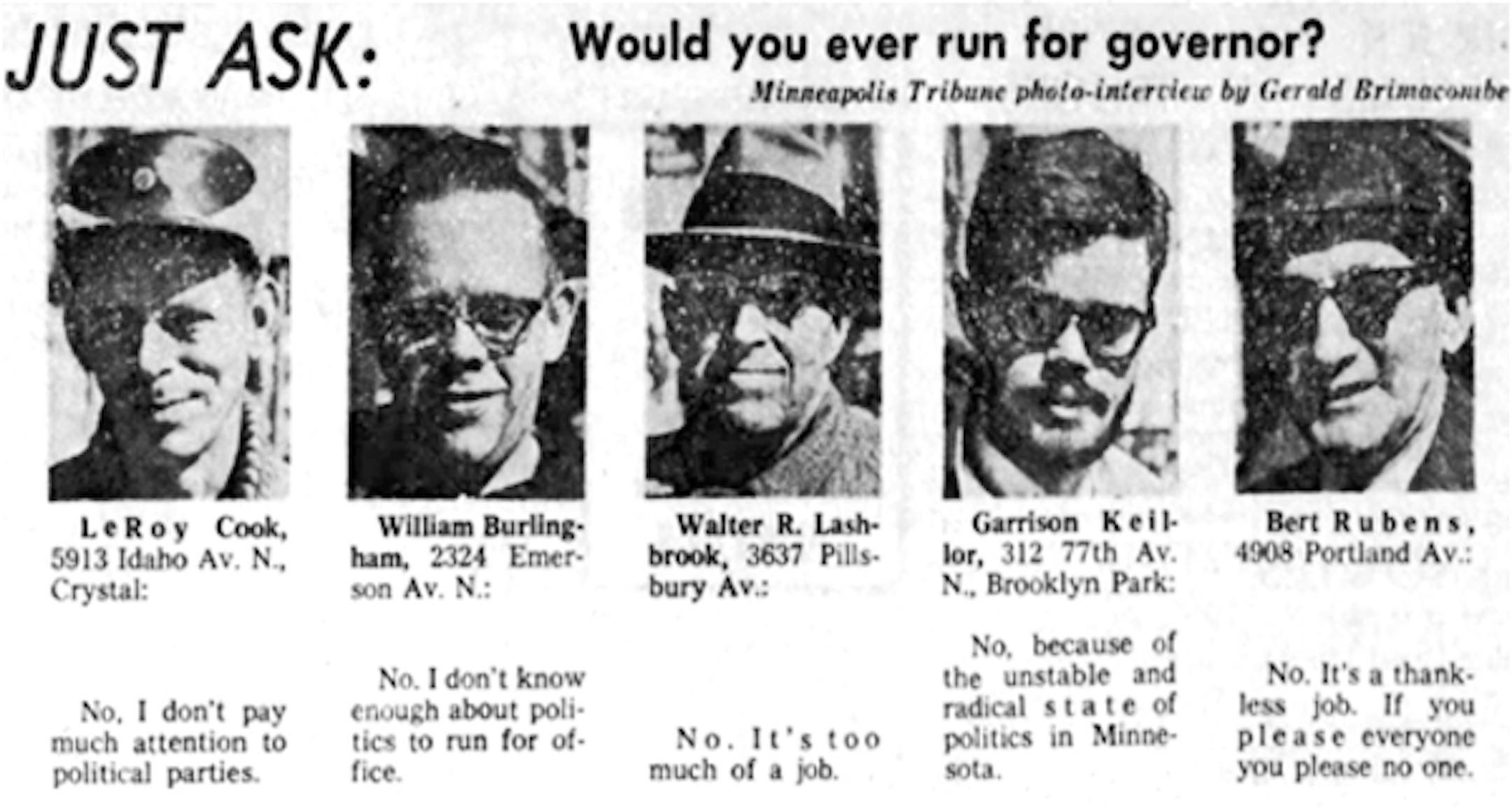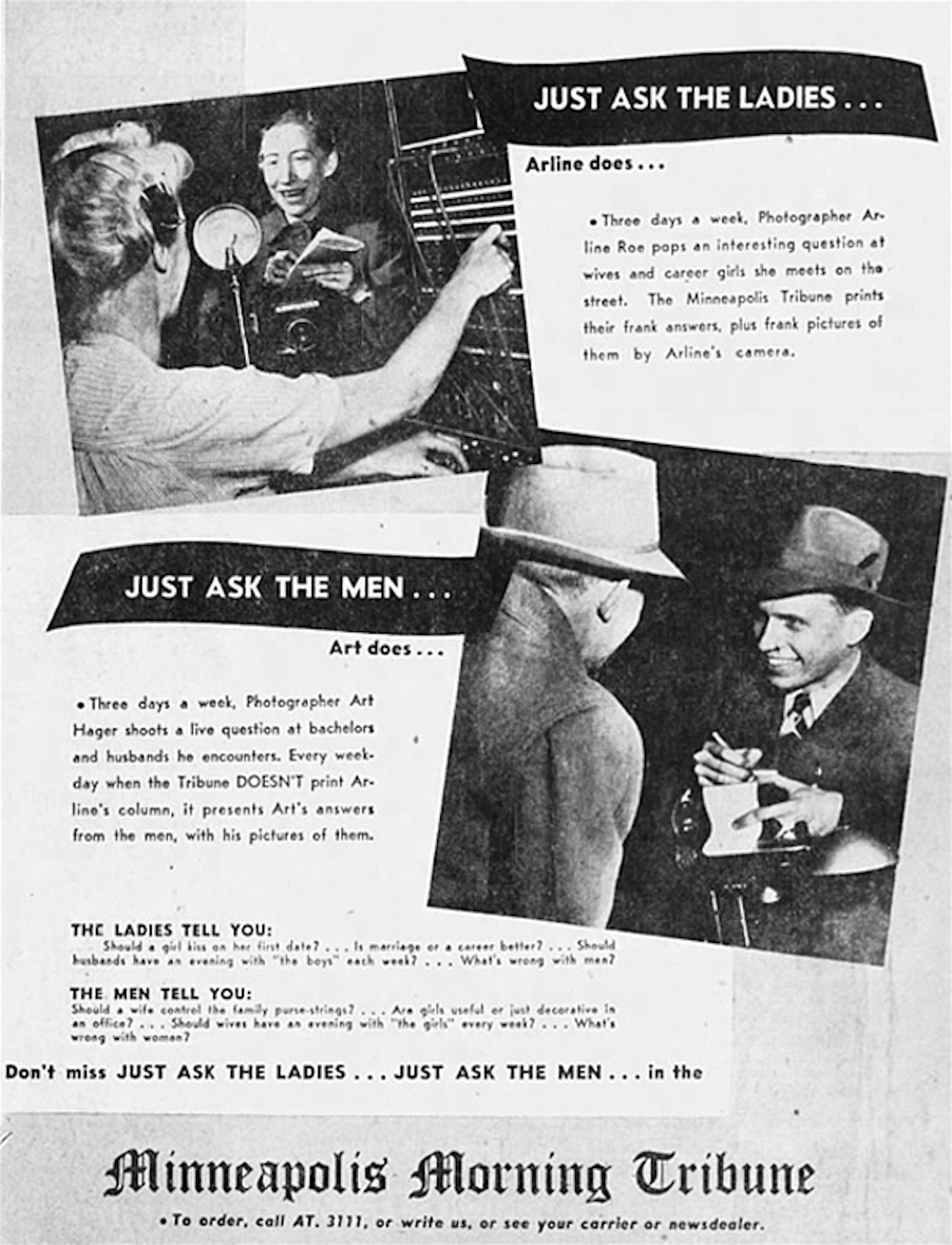 "Just ask," a man-on-the-street photo feature, appeared in the Minneapolis Tribune from November 1946 until June 1964.