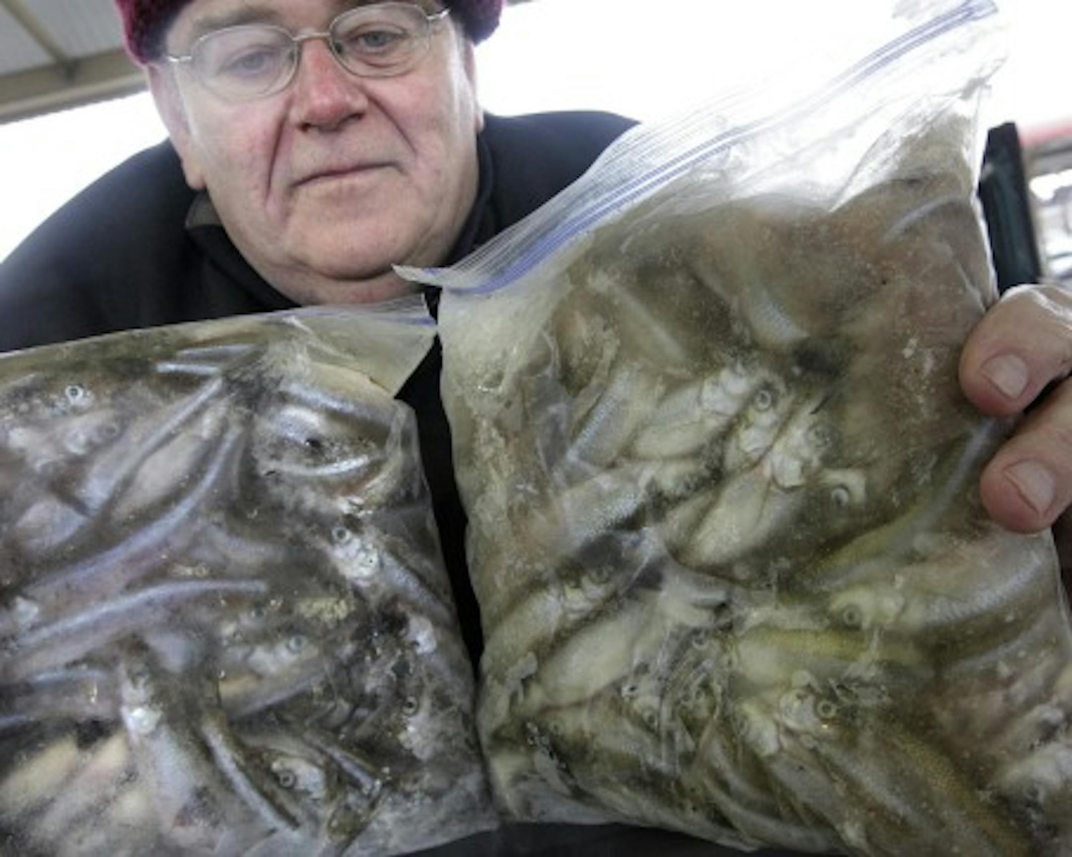 I have to admit that the sight of many tiny eyes appearing through plastic freezer bags was at first a bit disconcerting; that doesn't happen with asparagus, green onions and other late-spring farmers market staples. Father and son caught them near Ashland, Wis., and were selling them in 2- and 6-lb. bags.