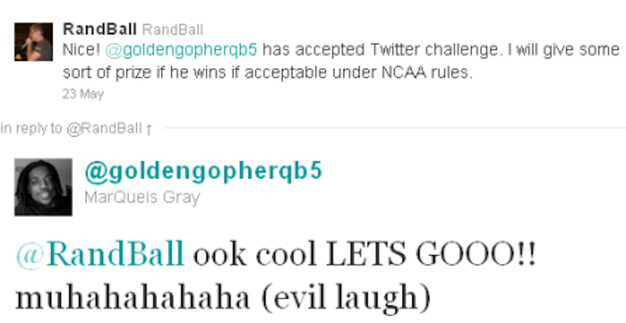 Because we're sure plenty of you were wondering based on our post earlier this week, Gophers QB MarQueis Gray has accepted our Twitter challenge -- a race to 2,500 followers. It figures to be the best Twitter challenge we've sponsored since pitting Tim Brewster against Brian Cardinal (Brewster won) in a race to 1,500 followers. It is also the only challenge since then, but semantics -- right?