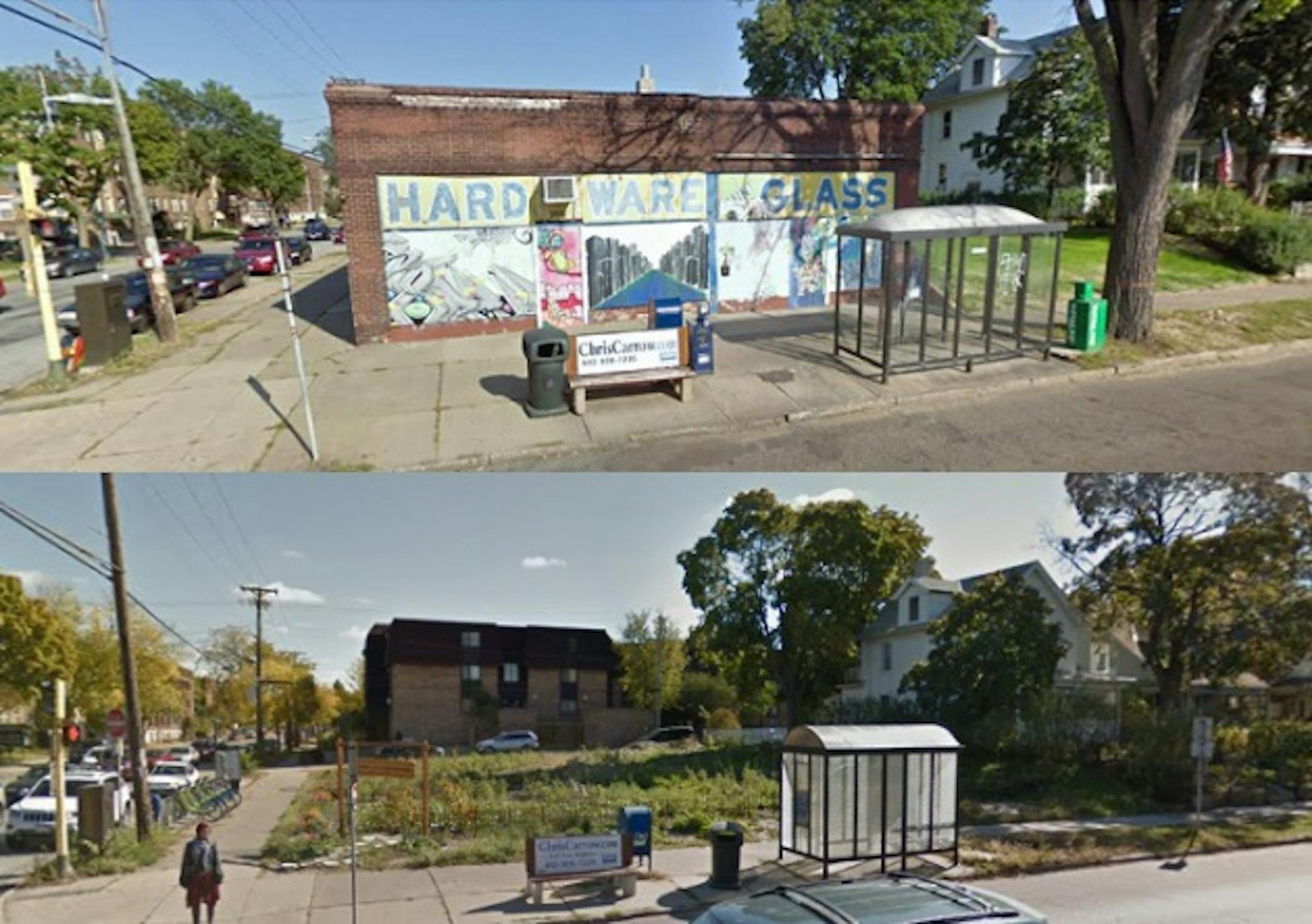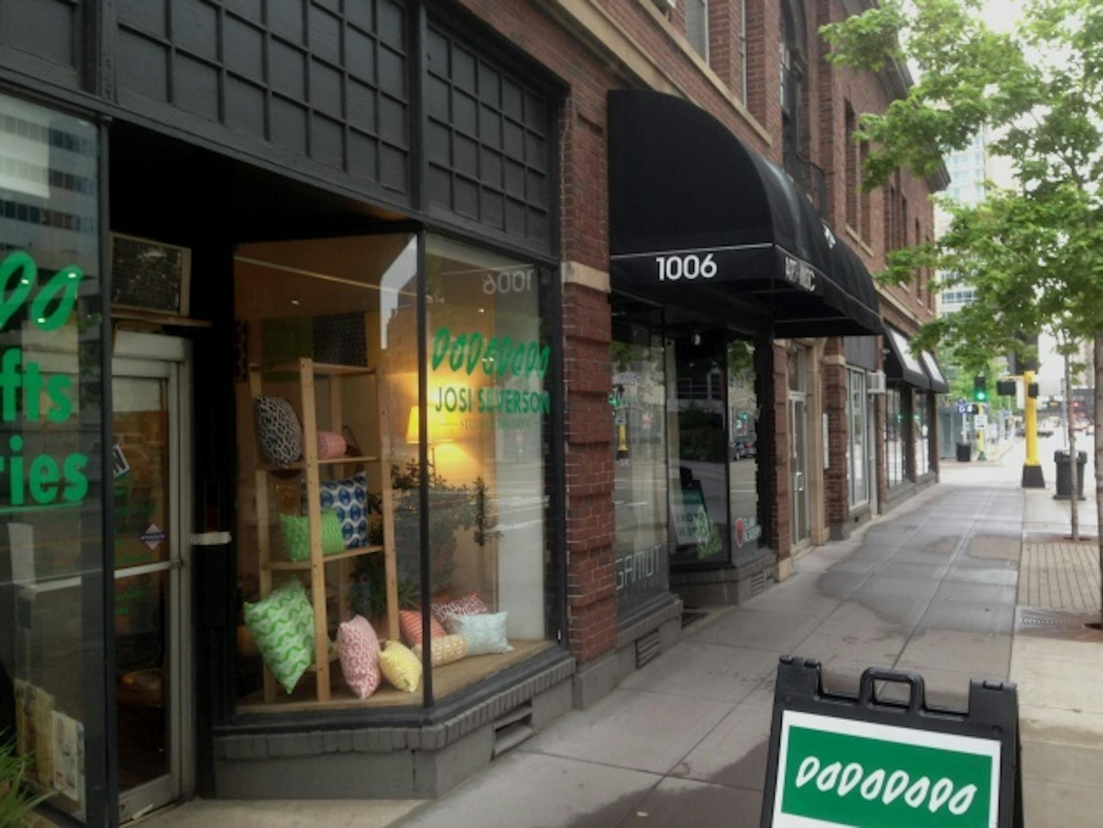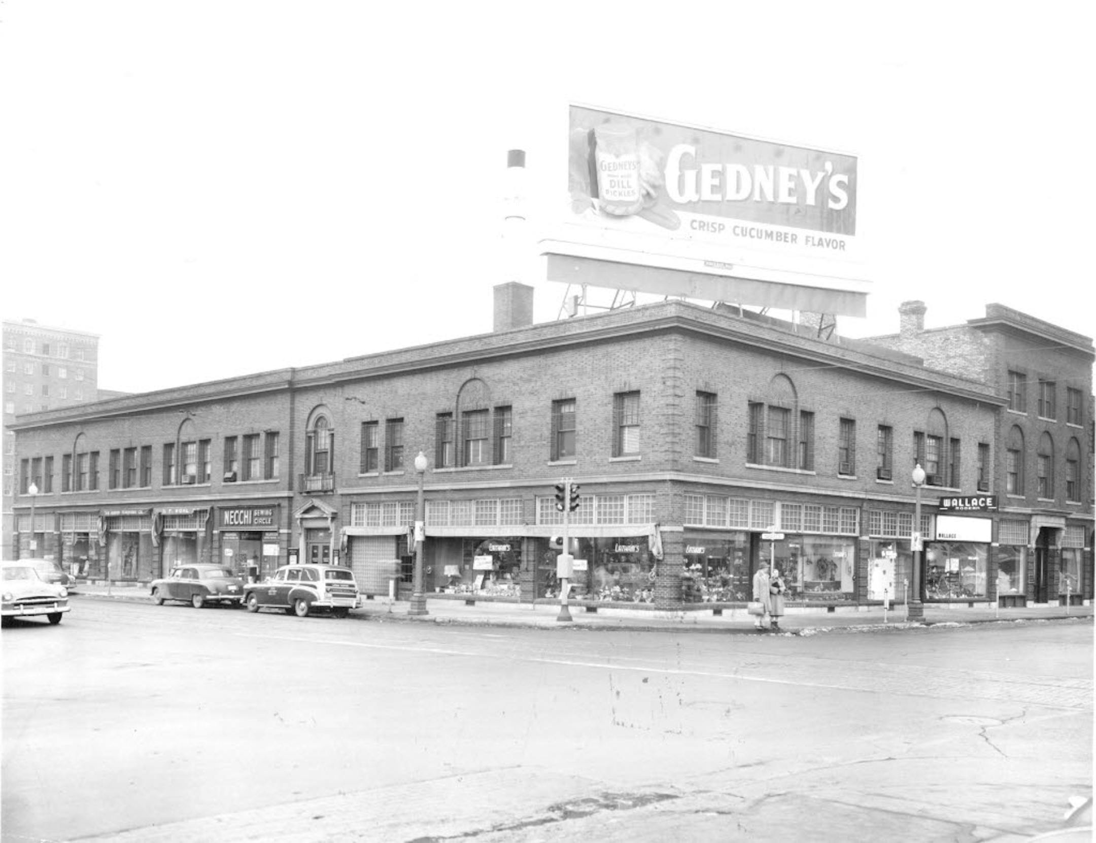 Above: A number of narrow storefronts front the sidewalk at 1004 Marquette Avenue.