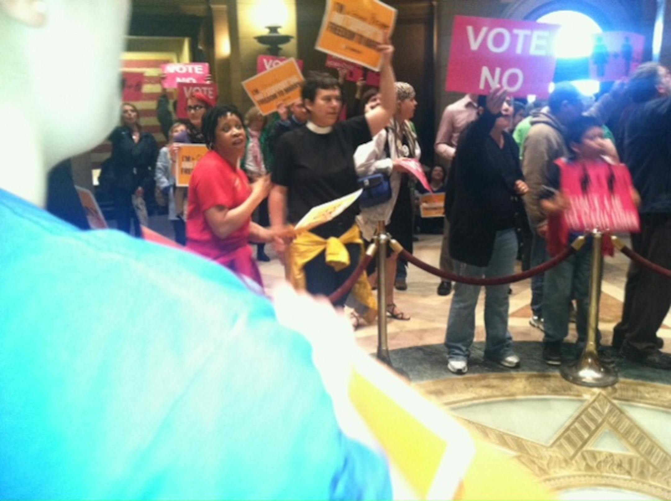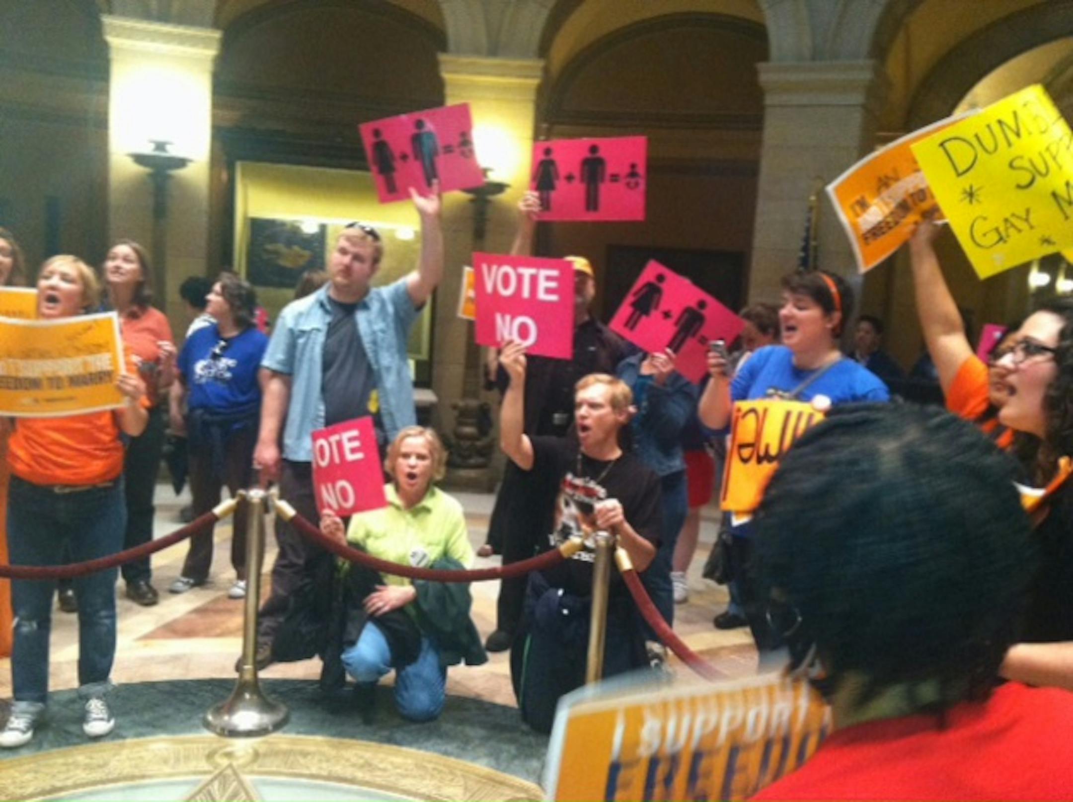 Buggs, a financial advisor who has been active in pushing for the legislation, said,"I'm a gay woman in full support of gay marriage... I wanted to become a part of Minnesota's history in being the 12th state to support gay marriage." "I hope to get married some day," she said. "And I hope Minnesota will allow me this chance to marry who I love." As the debate wore on in the chamber, the two sides kept up a respectful cacophony in the rotunda. "This Little Light of Mine" alternated with "Amazing Grace" among preferred songs. Pro-marriage groups recited the Pledge of Allegiance, shouting out, "with liberty and justice for all!" Anti-gay marriage activists chanted, "God says no!" A wandering preacher, Ernest Lowe Jr., warned of calamities if the bill passes. "It will bring destruction! It will bring curses on the land! Don't do this!" Standing next to Lowe was Ramona Scarpace of Plymouth, whose pro-gay-marriage sign identified her as a "lesbian, a citizen and a Christian." Of Lowe's message, she said: "It's very hard for me to understand that sometimes people can preach hatred and injustice in the love of God." When the vote totals became known, via a television monitor in an adjacent hallway, equal measures of elation and disappointment spread from the North star up into the rotunda. A resounding cheer began gathering momentum and silken rainbow ribbons were draped over the 2nd-floor railing. The orange-shirted supporters were hugging and shouting. The pink-sign-carrying opponents were heading home. "It's a great day for Minnesota! It's a great day for all families! Wonderful!" said Lynnell Mickelsen of Minneapolis as she joined in the cheers immediately after the vote was announced. She said she believes the tide is turning on the issue. "I think it's a turning point for the country on these issues.... it's more the mainstream viewpoint. This is the future." "Every society that's ever tried this has failed," said Sharon Zdrazil of St. Paul, who came to oppose the bill and left after the announcement. "Rome -- all of the great empires of the past have fallen when homosexuality got to this pitch," "I'm here because what we're doing as a state is wrong, it's just totally wrong -- and it's harmful to all of us," she said "It goes against, not only God's law, which they would mock for me to say that, but it's unhealthy what men do with men...." Brunsgaard, a fervent opponent, said he would be back for the Senate vote and lobby Sen. Katie Sieben, a DFLer who represents him. "Very disappointed, needless to say," he said after the vote."I'll be working on my senator. Prayerfully, the Senate will have better deliberations, and really consider what they're doing. They're definitely doing against God's word, against the faith. That's what I'm praying for -- that the senators will vote it down."