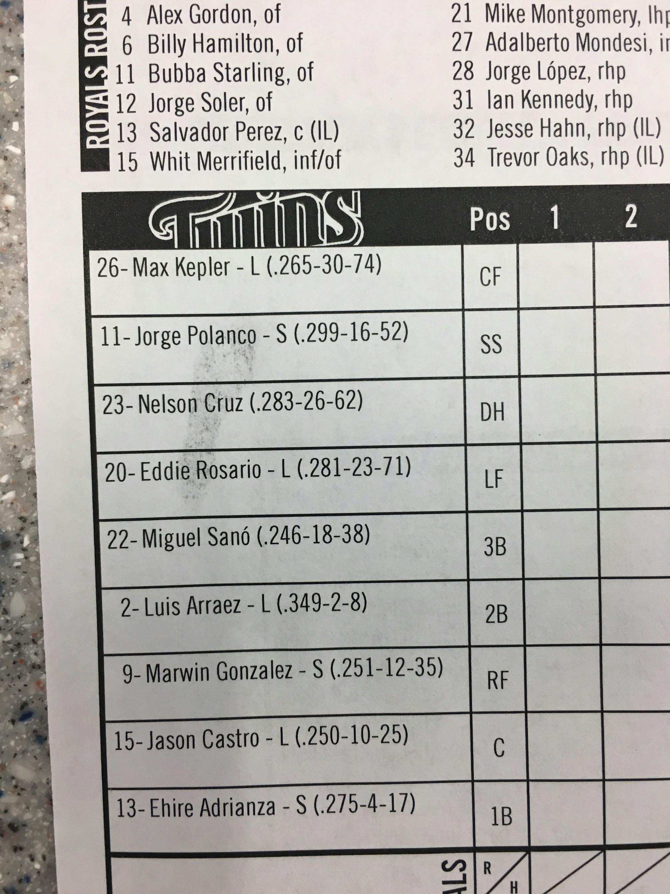 The Twins start a 10-game homestand tonight against the Royals at Target Field (7:10, FSN). One late UPDATE to report: Byron Buxton was a late scratch from the lineup. He has some left shoulder soreness lingering from Thursday's collision with the wall in Miami. The Twins say he is day-to-day.